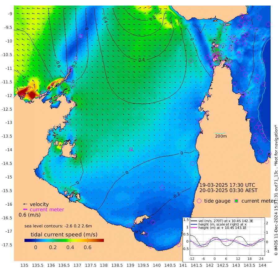 16cm/s 101T +3cm/s rms + 7cm/s -42T. ARA-GOC87 57m 17cm/s 143T +3cm/s rms + 2cm/s -2T. ARA-GOC87 60m 9cm/s 90T +2cm/s rms + 3cm/s 61T. ARA-GOC87 47m 20cm Daru 22cm Bobo Island 14cm Meer Island Barge 13cm Bramble Cay 16cm Unnamed Cay 12cm Pearce Cay 11cm Stephens Island 15cm Merrie England Shoals 18cm Mutacomal Reef 23cm Darnley Island Barge 10cm East Cay 25cm Yorke Island Barge 8cm Rennel Island 22cm Aureed Island 14cm Dungeness Reef 35cm Zagai Island 20cm Yam Island 36cm Dauan Island 53cm Saibai Island 33cm Phipi Reef 34cm Warrior Reef - West 25cm Mabuiag Island Barge 7cm Half Way Island 23cm Coconut Island 8cm Dugong Islet 16cm Poll Island 12cm Kirkcaldie Reef 19cm Suarji Island 32cm Sue Islet -11cm Hawkesbury Island 18cm Alert Patches 16cm Twin Island 2cm Badu Island 19cm St Pauls (Moa Island) -6cm Kubin (Moa Island) 10cm Ince Point 6cm Thursday Island 8cm Nardana Patches -2cm Turtle Head -1cm Round Island -13cm Goods Island -13cm Booby Island -25cm White Rocks Area 15cm Carpentaria 12cm Papou Point 5cm Bampfield Head -11cm Crab Island -15cm Red Wallis Island -8cm Packe Island 10cm Harrington Reef -6cm Herald Camp 11cm Sharp Point -3cm Red Island Point 11cm Possession Island 22cm Alpha Rock 17cm Frederick Point 23cm Wyborn Reef Light 24cm Tetley Island 19cm Triangle Reef 12cm Turtle Head Island 9cm Maclennan Cay 8cm Raine Island 17cm Mcsweeny Reef 21cm Collette Reef 19cm Shadwell Reef 21cm Hannibal Island 11cm Round Point -1cm Vrilya Point 13cm Cape Grenville 8cm Hicks Island 18cm Sir Charles Hardy Island 3cm Harvey Island 14cm Kay Reef 12cm Rocky Island 17cm Chapman Island 16cm Ham Reef 13cm Jubilee Reef 10cm Night Island 14cm Unnamed Reef No. 3 9cm Morris Island 8cm 1st 3 Mile Opening 11cm Creech Reef 7cm Fife Island 11cm Eden Reef 10cm Stanley Island 2cm Normanby River -106cm Yabooma Island -108cm Hutchison River -99cm Elcho Island -106cm North West Crocodile Island -22cm Cape Wessel -65cm Stevens Island 16cm Guluwuru Island -56cm Hopeful Bay -41cm Auster Point -47cm Two Island Bay -55cm Cadell Strait 185cm Mallison Island 3cm Melville Bay (Gove Harbour) 8cm Truant Island 14cm Cape Arnhem 1cm Cape Grey 0cm Hawk Island -16cm Milner Bay (Groote Eylandt) -25cm Cape Beatrice -27cm West Island -21cm Centre Island -26cm Mornington Island -30cm West Wellesley Islands -42cm Bountiful Island -79cm Albert River Mouth -63cm Sweers Island -72cm Karumba -18cm Nassau River Offshore 0cm Christmas Creek 8cm Archer River 12cm Boyd Point 2cm Weipa (Humbug Point) 9cm Pennefather River 4cm Cullen Point