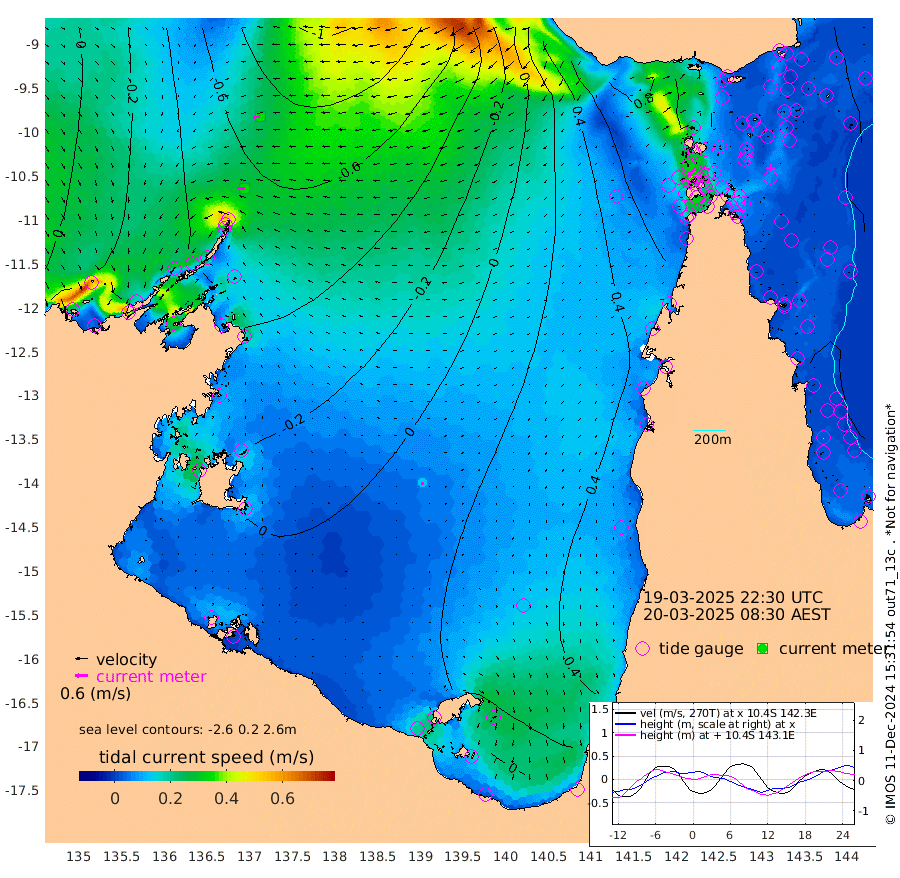 34cm/s -94T +3cm/s rms + 7cm/s -42T. ARA-GOC87 57m 12cm/s -167T +3cm/s rms + 2cm/s -2T. ARA-GOC87 60m 35cm/s -104T +2cm/s rms + 3cm/s 61T. ARA-GOC87 47m 14cm Daru 13cm Bobo Island 25cm Meer Island Barge 24cm Bramble Cay 23cm Unnamed Cay 30cm Pearce Cay 28cm Stephens Island 23cm Merrie England Shoals 18cm Mutacomal Reef 21cm Darnley Island Barge 32cm East Cay 18cm Yorke Island Barge 29cm Rennel Island 23cm Aureed Island 30cm Dungeness Reef -2cm Zagai Island 13cm Yam Island 5cm Dauan Island -6cm Saibai Island 18cm Phipi Reef 5cm Warrior Reef - West 27cm Mabuiag Island Barge 29cm Half Way Island 19cm Coconut Island 33cm Dugong Islet 22cm Poll Island 30cm Kirkcaldie Reef 39cm Suarji Island 15cm Sue Islet 90cm Hawkesbury Island 45cm Alert Patches 36cm Twin Island 69cm Badu Island 31cm St Pauls (Moa Island) 67cm Kubin (Moa Island) 47cm Ince Point 58cm Thursday Island 54cm Nardana Patches 73cm Turtle Head 69cm Round Island 93cm Goods Island 103cm Booby Island 106cm White Rocks Area 75cm Carpentaria 28cm Papou Point 95cm Bampfield Head 76cm Crab Island 95cm Red Wallis Island 79cm Packe Island 35cm Harrington Reef 91cm Herald Camp 1cm Sharp Point 68cm Red Island Point 51cm Possession Island 20cm Alpha Rock 31cm Frederick Point 13cm Wyborn Reef Light 12cm Tetley Island 22cm Triangle Reef 30cm Turtle Head Island 34cm Maclennan Cay 29cm Raine Island 25cm Mcsweeny Reef 21cm Collette Reef 22cm Shadwell Reef 22cm Hannibal Island 29cm Round Point 71cm Vrilya Point 32cm Cape Grenville 31cm Hicks Island 33cm Sir Charles Hardy Island 10cm Harvey Island 32cm Kay Reef 32cm Rocky Island 31cm Chapman Island 29cm Ham Reef 28cm Jubilee Reef 27cm Night Island 32cm Unnamed Reef No. 3 34cm Morris Island 35cm 1st 3 Mile Opening 34cm Creech Reef 29cm Fife Island 34cm Eden Reef 34cm Stanley Island 38cm Normanby River -23cm Yabooma Island -39cm Hutchison River -36cm Elcho Island -28cm North West Crocodile Island -62cm Cape Wessel -63cm Stevens Island -92cm Guluwuru Island -50cm Hopeful Bay -51cm Auster Point -58cm Two Island Bay -79cm Cadell Strait -242cm Mallison Island -73cm Melville Bay (Gove Harbour) -80cm Truant Island -60cm Cape Arnhem -33cm Cape Grey -30cm Hawk Island -19cm Milner Bay (Groote Eylandt) -5cm Cape Beatrice 18cm West Island 14cm Centre Island 17cm Mornington Island 25cm West Wellesley Islands 44cm Bountiful Island 9cm Albert River Mouth 9cm Sweers Island 23cm Karumba 41cm Nassau River Offshore 49cm Christmas Creek 56cm Archer River 55cm Boyd Point 68cm Weipa (Humbug Point) 47cm Pennefather River 66cm Cullen Point