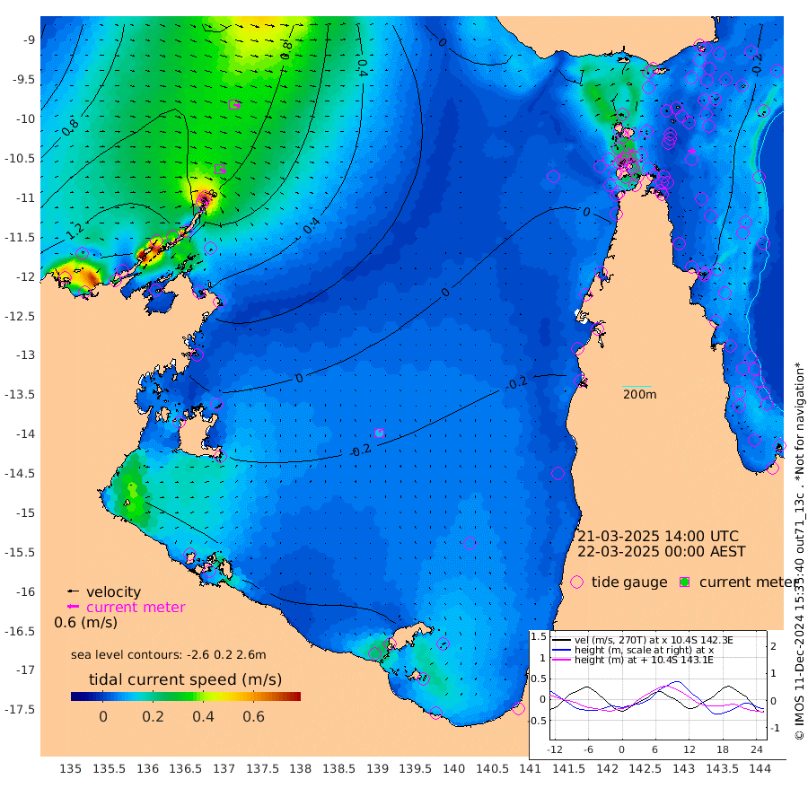 34cm/s 116T +3cm/s rms + 7cm/s -42T. ARA-GOC87 57m 13cm/s 11T +3cm/s rms + 2cm/s -2T. ARA-GOC87 60m 36cm/s 110T +2cm/s rms + 3cm/s 61T. ARA-GOC87 47m -4cm Daru -3cm Bobo Island -10cm Meer Island Barge -14cm Bramble Cay -14cm Unnamed Cay -3cm Pearce Cay -8cm Stephens Island -20cm Merrie England Shoals -16cm Mutacomal Reef -14cm Darnley Island Barge -14cm East Cay -11cm Yorke Island Barge -7cm Rennel Island -8cm Aureed Island 2cm Dungeness Reef 11cm Zagai Island 10cm Yam Island 20cm Dauan Island 1cm Saibai Island 16cm Phipi Reef 6cm Warrior Reef - West 17cm Mabuiag Island Barge -3cm Half Way Island 2cm Coconut Island -6cm Dugong Islet 7cm Poll Island 3cm Kirkcaldie Reef 9cm Suarji Island -6cm Sue Islet 41cm Hawkesbury Island 9cm Alert Patches 13cm Twin Island 47cm Badu Island 20cm St Pauls (Moa Island) 44cm Kubin (Moa Island) 21cm Ince Point 27cm Thursday Island 26cm Nardana Patches 32cm Turtle Head 44cm Round Island 43cm Goods Island 45cm Booby Island 43cm White Rocks Area 23cm Carpentaria 23cm Papou Point 54cm Bampfield Head 43cm Crab Island 39cm Red Wallis Island 38cm Packe Island -2cm Harrington Reef 40cm Herald Camp -3cm Sharp Point 23cm Red Island Point 27cm Possession Island 0cm Alpha Rock 6cm Frederick Point -3cm Wyborn Reef Light 0cm Tetley Island -10cm Triangle Reef 15cm Turtle Head Island -11cm Maclennan Cay -8cm Raine Island -12cm Mcsweeny Reef -18cm Collette Reef -16cm Shadwell Reef -19cm Hannibal Island -14cm Round Point 32cm Vrilya Point -21cm Cape Grenville -10cm Hicks Island -21cm Sir Charles Hardy Island -4cm Harvey Island -26cm Kay Reef -17cm Rocky Island -21cm Chapman Island -20cm Ham Reef -15cm Jubilee Reef -11cm Night Island -21cm Unnamed Reef No. 3 -15cm Morris Island -6cm 1st 3 Mile Opening -14cm Creech Reef -15cm Fife Island -17cm Eden Reef -20cm Stanley Island -20cm Normanby River 154cm Yabooma Island 177cm Hutchison River 151cm Elcho Island 143cm North West Crocodile Island 96cm Cape Wessel 136cm Stevens Island 82cm Guluwuru Island 113cm Hopeful Bay 113cm Auster Point 121cm Two Island Bay 152cm Cadell Strait -9cm Mallison Island 80cm Melville Bay (Gove Harbour) 89cm Truant Island 52cm Cape Arnhem 23cm Cape Grey 8cm Hawk Island -10cm Milner Bay (Groote Eylandt) -26cm Cape Beatrice -63cm West Island -60cm Centre Island -77cm Mornington Island -86cm West Wellesley Islands -89cm Bountiful Island -72cm Albert River Mouth -78cm Sweers Island -75cm Karumba -67cm Nassau River Offshore -50cm Christmas Creek -21cm Archer River -6cm Boyd Point -3cm Weipa (Humbug Point) 13cm Pennefather River 20cm Cullen Point
