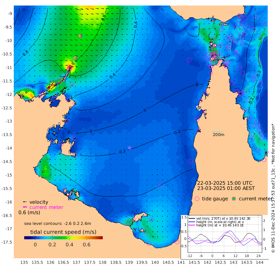 37cm/s 115T +3cm/s rms + 7cm/s -42T. ARA-GOC87 57m 10cm/s 27T +3cm/s rms + 2cm/s -2T. ARA-GOC87 60m 38cm/s 110T +2cm/s rms + 3cm/s 61T. ARA-GOC87 47m -29cm Daru -27cm Bobo Island -20cm Meer Island Barge -34cm Bramble Cay -39cm Unnamed Cay -27cm Pearce Cay -31cm Stephens Island -48cm Merrie England Shoals -44cm Mutacomal Reef -30cm Darnley Island Barge -30cm East Cay -29cm Yorke Island Barge -33cm Rennel Island -28cm Aureed Island -21cm Dungeness Reef 1cm Zagai Island -4cm Yam Island 22cm Dauan Island 8cm Saibai Island 7cm Phipi Reef -5cm Warrior Reef - West 15cm Mabuiag Island Barge -28cm Half Way Island -22cm Coconut Island -30cm Dugong Islet -14cm Poll Island -19cm Kirkcaldie Reef -9cm Suarji Island -20cm Sue Islet 33cm Hawkesbury Island -9cm Alert Patches -5cm Twin Island 43cm Badu Island 5cm St Pauls (Moa Island) 35cm Kubin (Moa Island) 8cm Ince Point 16cm Thursday Island 14cm Nardana Patches 22cm Turtle Head 32cm Round Island 38cm Goods Island 45cm Booby Island 37cm White Rocks Area 35cm Carpentaria 9cm Papou Point 49cm Bampfield Head 41cm Crab Island 37cm Red Wallis Island 28cm Packe Island -31cm Harrington Reef 34cm Herald Camp -6cm Sharp Point 13cm Red Island Point 11cm Possession Island -17cm Alpha Rock -16cm Frederick Point -30cm Wyborn Reef Light -26cm Tetley Island -20cm Triangle Reef -14cm Turtle Head Island -22cm Maclennan Cay -15cm Raine Island -34cm Mcsweeny Reef -38cm Collette Reef -27cm Shadwell Reef -41cm Hannibal Island -37cm Round Point 34cm Vrilya Point -40cm Cape Grenville -26cm Hicks Island -30cm Sir Charles Hardy Island -10cm Harvey Island -41cm Kay Reef -27cm Rocky Island -28cm Chapman Island -26cm Ham Reef -22cm Jubilee Reef -21cm Night Island -29cm Unnamed Reef No. 3 -26cm Morris Island -14cm 1st 3 Mile Opening -23cm Creech Reef -28cm Fife Island -26cm Eden Reef -31cm Stanley Island -34cm Normanby River 133cm Yabooma Island 156cm Hutchison River 133cm Elcho Island 124cm North West Crocodile Island 94cm Cape Wessel 119cm Stevens Island 89cm Guluwuru Island 98cm Hopeful Bay 103cm Auster Point 114cm Two Island Bay 143cm Cadell Strait 22cm Mallison Island 80cm Melville Bay (Gove Harbour) 90cm Truant Island 55cm Cape Arnhem 22cm Cape Grey 3cm Hawk Island -15cm Milner Bay (Groote Eylandt) -33cm Cape Beatrice -69cm West Island -67cm Centre Island -89cm Mornington Island -97cm West Wellesley Islands -102cm Bountiful Island -90cm Albert River Mouth -101cm Sweers Island -98cm Karumba -77cm Nassau River Offshore -54cm Christmas Creek -22cm Archer River -3cm Boyd Point -1cm Weipa (Humbug Point) 12cm Pennefather River 23cm Cullen Point