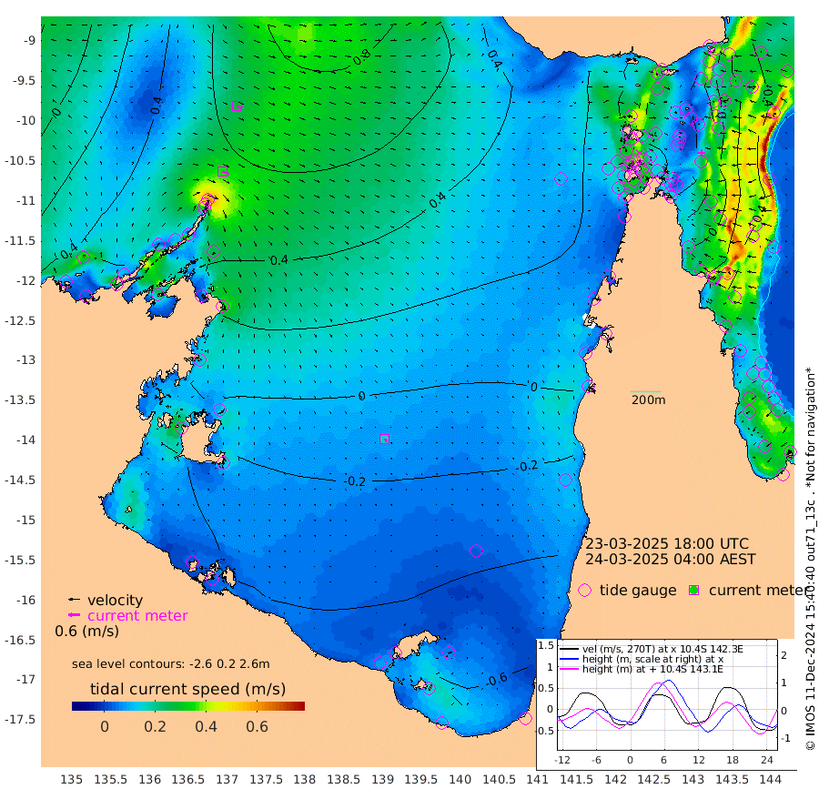 35cm/s 115T +3cm/s rms + 7cm/s -42T. ARA-GOC87 57m 17cm/s 147T +3cm/s rms + 2cm/s -2T. ARA-GOC87 60m 29cm/s 113T +2cm/s rms + 3cm/s 61T. ARA-GOC87 47m -12cm Daru -10cm Bobo Island 39cm Meer Island Barge 23cm Bramble Cay 8cm Unnamed Cay -2cm Pearce Cay 12cm Stephens Island 7cm Merrie England Shoals -14cm Mutacomal Reef 23cm Darnley Island Barge 29cm East Cay 8cm Yorke Island Barge -8cm Rennel Island -8cm Aureed Island -16cm Dungeness Reef -26cm Zagai Island -29cm Yam Island -19cm Dauan Island -20cm Saibai Island -37cm Phipi Reef -32cm Warrior Reef - West -21cm Mabuiag Island Barge -1cm Half Way Island -22cm Coconut Island -9cm Dugong Islet -27cm Poll Island -23cm Kirkcaldie Reef -50cm Suarji Island -20cm Sue Islet 21cm Hawkesbury Island -33cm Alert Patches -32cm Twin Island 12cm Badu Island -35cm St Pauls (Moa Island) 9cm Kubin (Moa Island) -21cm Ince Point -12cm Thursday Island -15cm Nardana Patches 0cm Turtle Head 7cm Round Island 25cm Goods Island 39cm Booby Island 22cm White Rocks Area 48cm Carpentaria -28cm Papou Point 41cm Bampfield Head 31cm Crab Island 27cm Red Wallis Island 12cm Packe Island -25cm Harrington Reef 26cm Herald Camp -18cm Sharp Point -12cm Red Island Point -21cm Possession Island -28cm Alpha Rock -29cm Frederick Point -14cm Wyborn Reef Light -19cm Tetley Island 23cm Triangle Reef -2cm Turtle Head Island 30cm Maclennan Cay 41cm Raine Island 6cm Mcsweeny Reef 12cm Collette Reef 32cm Shadwell Reef 16cm Hannibal Island 19cm Round Point 39cm Vrilya Point 23cm Cape Grenville 28cm Hicks Island 39cm Sir Charles Hardy Island 8cm Harvey Island 34cm Kay Reef 37cm Rocky Island 39cm Chapman Island 41cm Ham Reef 42cm Jubilee Reef 33cm Night Island 37cm Unnamed Reef No. 3 39cm Morris Island 48cm 1st 3 Mile Opening 42cm Creech Reef 31cm Fife Island 56cm Eden Reef 45cm Stanley Island 40cm Normanby River 54cm Yabooma Island 62cm Hutchison River 49cm Elcho Island 37cm North West Crocodile Island 59cm Cape Wessel 57cm Stevens Island 87cm Guluwuru Island 50cm Hopeful Bay 56cm Auster Point 68cm Two Island Bay 84cm Cadell Strait 183cm Mallison Island 63cm Melville Bay (Gove Harbour) 73cm Truant Island 46cm Cape Arnhem 9cm Cape Grey -12cm Hawk Island -40cm Milner Bay (Groote Eylandt) -52cm Cape Beatrice -85cm West Island -85cm Centre Island -98cm Mornington Island -96cm West Wellesley Islands -113cm Bountiful Island -134cm Albert River Mouth -148cm Sweers Island -142cm Karumba -63cm Nassau River Offshore -25cm Christmas Creek 8cm Archer River 24cm Boyd Point 25cm Weipa (Humbug Point) 28cm Pennefather River 34cm Cullen Point