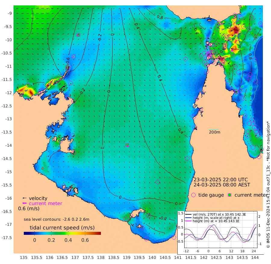 17cm/s -106T +3cm/s rms + 7cm/s -42T. ARA-GOC87 57m 33cm/s 168T +3cm/s rms + 2cm/s -2T. ARA-GOC87 60m 28cm/s -105T +2cm/s rms + 3cm/s 61T. ARA-GOC87 47m 119cm Daru 109cm Bobo Island 78cm Meer Island Barge 106cm Bramble Cay 127cm Unnamed Cay 114cm Pearce Cay 114cm Stephens Island 136cm Merrie England Shoals 139cm Mutacomal Reef 103cm Darnley Island Barge 90cm East Cay 107cm Yorke Island Barge 121cm Rennel Island 108cm Aureed Island 110cm Dungeness Reef 75cm Zagai Island 88cm Yam Island 51cm Dauan Island 49cm Saibai Island 58cm Phipi Reef 83cm Warrior Reef - West 63cm Mabuiag Island Barge 118cm Half Way Island 115cm Coconut Island 123cm Dugong Islet 106cm Poll Island 112cm Kirkcaldie Reef 98cm Suarji Island 100cm Sue Islet 96cm Hawkesbury Island 112cm Alert Patches 107cm Twin Island 76cm Badu Island 96cm St Pauls (Moa Island) 89cm Kubin (Moa Island) 97cm Ince Point 95cm Thursday Island 94cm Nardana Patches 95cm Turtle Head 86cm Round Island 90cm Goods Island 87cm Booby Island 92cm White Rocks Area 76cm Carpentaria 79cm Papou Point 97cm Bampfield Head 65cm Crab Island 94cm Red Wallis Island 107cm Packe Island 131cm Harrington Reef 95cm Herald Camp 24cm Sharp Point 76cm Red Island Point 88cm Possession Island 110cm Alpha Rock 117cm Frederick Point 131cm Wyborn Reef Light 129cm Tetley Island 82cm Triangle Reef 126cm Turtle Head Island 84cm Maclennan Cay 65cm Raine Island 117cm Mcsweeny Reef 112cm Collette Reef 86cm Shadwell Reef 121cm Hannibal Island 116cm Round Point 67cm Vrilya Point 110cm Cape Grenville 91cm Hicks Island 98cm Sir Charles Hardy Island 31cm Harvey Island 102cm Kay Reef 79cm Rocky Island 79cm Chapman Island 73cm Ham Reef 74cm Jubilee Reef 75cm Night Island 79cm Unnamed Reef No. 3 82cm Morris Island 70cm 1st 3 Mile Opening 78cm Creech Reef 84cm Fife Island 83cm Eden Reef 88cm Stanley Island 91cm Normanby River -96cm Yabooma Island -115cm Hutchison River -108cm Elcho Island -107cm North West Crocodile Island -60cm Cape Wessel -83cm Stevens Island -55cm Guluwuru Island -74cm Hopeful Bay -71cm Auster Point -78cm Two Island Bay -104cm Cadell Strait 44cm Mallison Island -51cm Melville Bay (Gove Harbour) -51cm Truant Island -36cm Cape Arnhem -41cm Cape Grey -32cm Hawk Island -50cm Milner Bay (Groote Eylandt) -37cm Cape Beatrice -29cm West Island -33cm Centre Island -24cm Mornington Island -17cm West Wellesley Islands -41cm Bountiful Island -95cm Albert River Mouth -103cm Sweers Island -79cm Karumba 19cm Nassau River Offshore 50cm Christmas Creek 58cm Archer River 62cm Boyd Point 61cm Weipa (Humbug Point) 56cm Pennefather River 66cm Cullen Point