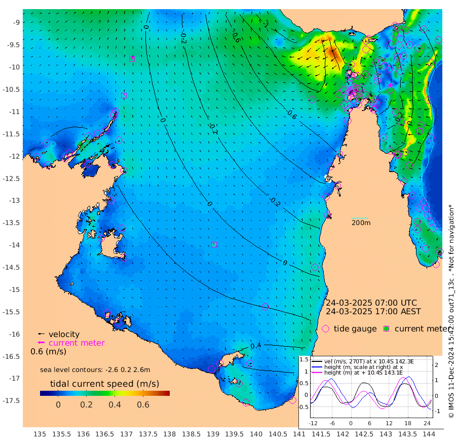 15cm/s 8T +3cm/s rms + 7cm/s -42T. ARA-GOC87 57m 17cm/s -40T +3cm/s rms + 2cm/s -2T. ARA-GOC87 60m 21cm/s 21T +2cm/s rms + 3cm/s 61T. ARA-GOC87 47m -50cm Daru -44cm Bobo Island 5cm Meer Island Barge -7cm Bramble Cay -28cm Unnamed Cay -42cm Pearce Cay -24cm Stephens Island -23cm Merrie England Shoals -51cm Mutacomal Reef -12cm Darnley Island Barge 1cm East Cay -30cm Yorke Island Barge -45cm Rennel Island -46cm Aureed Island -63cm Dungeness Reef -83cm Zagai Island -91cm Yam Island -100cm Dauan Island -89cm Saibai Island -85cm Phipi Reef -89cm Warrior Reef - West -110cm Mabuiag Island Barge -45cm Half Way Island -71cm Coconut Island -58cm Dugong Islet -86cm Poll Island -77cm Kirkcaldie Reef -112cm Suarji Island -72cm Sue Islet -139cm Hawkesbury Island -113cm Alert Patches -115cm Twin Island -138cm Badu Island -121cm St Pauls (Moa Island) -135cm Kubin (Moa Island) -123cm Ince Point -129cm Thursday Island -127cm Nardana Patches -130cm Turtle Head -126cm Round Island -136cm Goods Island -143cm Booby Island -147cm White Rocks Area -128cm Carpentaria -106cm Papou Point -148cm Bampfield Head -115cm Crab Island -148cm Red Wallis Island -145cm Packe Island -72cm Harrington Reef -134cm Herald Camp -29cm Sharp Point -109cm Red Island Point -109cm Possession Island -97cm Alpha Rock -97cm Frederick Point -65cm Wyborn Reef Light -75cm Tetley Island -18cm Triangle Reef -65cm Turtle Head Island -9cm Maclennan Cay 7cm Raine Island -32cm Mcsweeny Reef -18cm Collette Reef 1cm Shadwell Reef -14cm Hannibal Island -13cm Round Point -106cm Vrilya Point -6cm Cape Grenville -3cm Hicks Island -6cm Sir Charles Hardy Island -1cm Harvey Island 6cm Kay Reef 8cm Rocky Island 7cm Chapman Island 9cm Ham Reef 9cm Jubilee Reef 2cm Night Island 5cm Unnamed Reef No. 3 8cm Morris Island 7cm 1st 3 Mile Opening 7cm Creech Reef 4cm Fife Island 22cm Eden Reef 14cm Stanley Island 15cm Normanby River 7cm Yabooma Island 10cm Hutchison River 14cm Elcho Island 13cm North West Crocodile Island 2cm Cape Wessel 13cm Stevens Island 29cm Guluwuru Island 23cm Hopeful Bay 9cm Auster Point 12cm Two Island Bay 27cm Cadell Strait 90cm Mallison Island 21cm Melville Bay (Gove Harbour) 14cm Truant Island 16cm Cape Arnhem 34cm Cape Grey 38cm Hawk Island 50cm Milner Bay (Groote Eylandt) 51cm Cape Beatrice 56cm West Island 58cm Centre Island 89cm Mornington Island 89cm West Wellesley Islands 112cm Bountiful Island 148cm Albert River Mouth 166cm Sweers Island 141cm Karumba 48cm Nassau River Offshore 8cm Christmas Creek -27cm Archer River -54cm Boyd Point -54cm Weipa (Humbug Point) -59cm Pennefather River -95cm Cullen Point