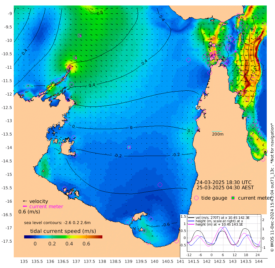 34cm/s 118T +3cm/s rms + 7cm/s -42T. ARA-GOC87 57m 15cm/s 146T +3cm/s rms + 2cm/s -2T. ARA-GOC87 60m 29cm/s 117T +2cm/s rms + 3cm/s 61T. ARA-GOC87 47m -29cm Daru -23cm Bobo Island 43cm Meer Island Barge 23cm Bramble Cay -1cm Unnamed Cay -9cm Pearce Cay 8cm Stephens Island 0cm Merrie England Shoals -29cm Mutacomal Reef 19cm Darnley Island Barge 34cm East Cay -2cm Yorke Island Barge -18cm Rennel Island -19cm Aureed Island -32cm Dungeness Reef -52cm Zagai Island -51cm Yam Island -47cm Dauan Island -47cm Saibai Island -67cm Phipi Reef -60cm Warrior Reef - West -40cm Mabuiag Island Barge -9cm Half Way Island -39cm Coconut Island -20cm Dugong Islet -47cm Poll Island -40cm Kirkcaldie Reef -73cm Suarji Island -40cm Sue Islet 23cm Hawkesbury Island -53cm Alert Patches -52cm Twin Island 6cm Badu Island -58cm St Pauls (Moa Island) 2cm Kubin (Moa Island) -37cm Ince Point -24cm Thursday Island -29cm Nardana Patches -7cm Turtle Head 0cm Round Island 29cm Goods Island 47cm Booby Island 31cm White Rocks Area 56cm Carpentaria -45cm Papou Point 43cm Bampfield Head 36cm Crab Island 35cm Red Wallis Island 10cm Packe Island -39cm Harrington Reef 26cm Herald Camp -28cm Sharp Point -16cm Red Island Point -36cm Possession Island -48cm Alpha Rock -48cm Frederick Point -32cm Wyborn Reef Light -38cm Tetley Island 22cm Triangle Reef -15cm Turtle Head Island 34cm Maclennan Cay 49cm Raine Island -2cm Mcsweeny Reef 6cm Collette Reef 33cm Shadwell Reef 11cm Hannibal Island 19cm Round Point 46cm Vrilya Point 25cm Cape Grenville 31cm Hicks Island 43cm Sir Charles Hardy Island 8cm Harvey Island 39cm Kay Reef 44cm Rocky Island 47cm Chapman Island 49cm Ham Reef 50cm Jubilee Reef 38cm Night Island 46cm Unnamed Reef No. 3 47cm Morris Island 56cm 1st 3 Mile Opening 50cm Creech Reef 38cm Fife Island 67cm Eden Reef 53cm Stanley Island 51cm Normanby River 79cm Yabooma Island 86cm Hutchison River 72cm Elcho Island 60cm North West Crocodile Island 70cm Cape Wessel 71cm Stevens Island 87cm Guluwuru Island 65cm Hopeful Bay 68cm Auster Point 81cm Two Island Bay 99cm Cadell Strait 152cm Mallison Island 64cm Melville Bay (Gove Harbour) 73cm Truant Island 43cm Cape Arnhem 8cm Cape Grey -18cm Hawk Island -42cm Milner Bay (Groote Eylandt) -53cm Cape Beatrice -87cm West Island -89cm Centre Island -106cm Mornington Island -100cm West Wellesley Islands -115cm Bountiful Island -138cm Albert River Mouth -155cm Sweers Island -148cm Karumba -67cm Nassau River Offshore -27cm Christmas Creek 11cm Archer River 27cm Boyd Point 30cm Weipa (Humbug Point) 29cm Pennefather River 38cm Cullen Point