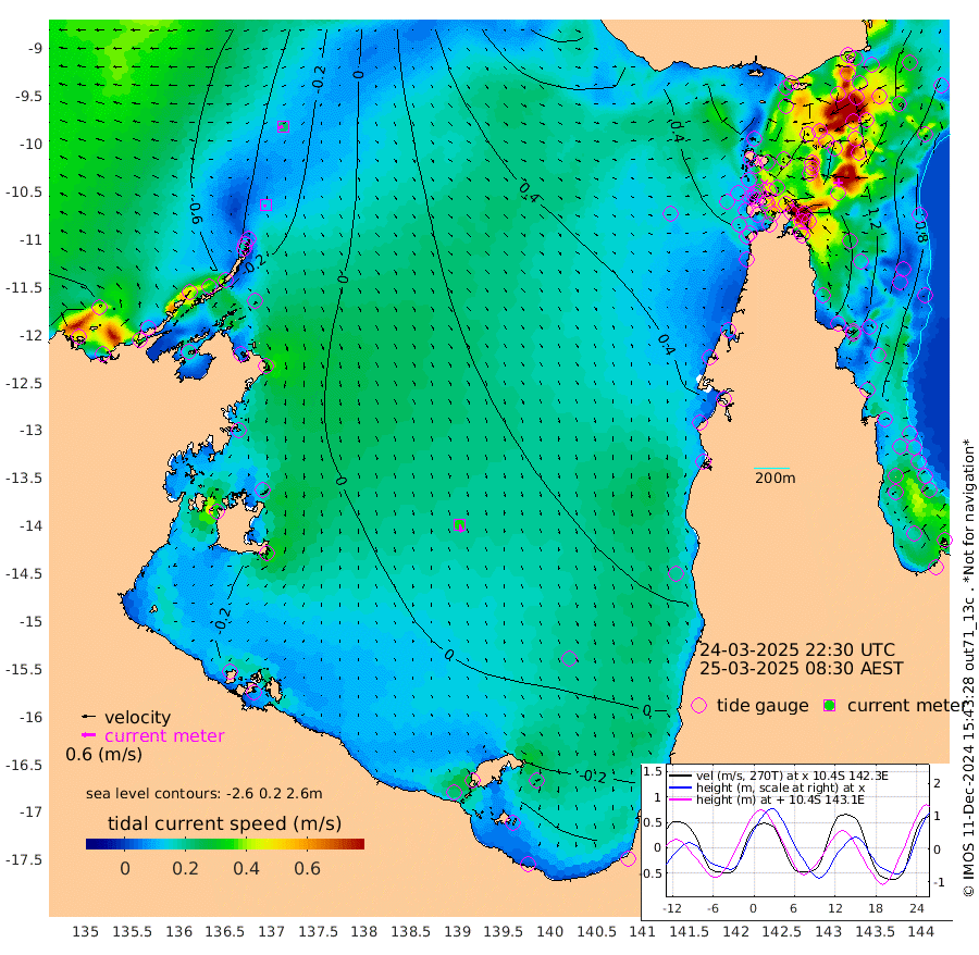 12cm/s -120T +3cm/s rms + 7cm/s -42T. ARA-GOC87 57m 35cm/s 168T +3cm/s rms + 2cm/s -2T. ARA-GOC87 60m 23cm/s -109T +2cm/s rms + 3cm/s 61T. ARA-GOC87 47m 149cm Daru 137cm Bobo Island 91cm Meer Island Barge 126cm Bramble Cay 153cm Unnamed Cay 141cm Pearce Cay 138cm Stephens Island 162cm Merrie England Shoals 168cm Mutacomal Reef 123cm Darnley Island Barge 104cm East Cay 131cm Yorke Island Barge 148cm Rennel Island 131cm Aureed Island 136cm Dungeness Reef 99cm Zagai Island 114cm Yam Island 68cm Dauan Island 62cm Saibai Island 75cm Phipi Reef 108cm Warrior Reef - West 74cm Mabuiag Island Barge 145cm Half Way Island 142cm Coconut Island 151cm Dugong Islet 132cm Poll Island 139cm Kirkcaldie Reef 118cm Suarji Island 123cm Sue Islet 99cm Hawkesbury Island 131cm Alert Patches 129cm Twin Island 82cm Badu Island 118cm St Pauls (Moa Island) 99cm Kubin (Moa Island) 113cm Ince Point 107cm Thursday Island 107cm Nardana Patches 103cm Turtle Head 89cm Round Island 91cm Goods Island 80cm Booby Island 90cm White Rocks Area 63cm Carpentaria 99cm Papou Point 86cm Bampfield Head 59cm Crab Island 90cm Red Wallis Island 112cm Packe Island 161cm Harrington Reef 90cm Herald Camp 30cm Sharp Point 82cm Red Island Point 98cm Possession Island 131cm Alpha Rock 142cm Frederick Point 161cm Wyborn Reef Light 158cm Tetley Island 93cm Triangle Reef 157cm Turtle Head Island 95cm Maclennan Cay 72cm Raine Island 141cm Mcsweeny Reef 132cm Collette Reef 97cm Shadwell Reef 143cm Hannibal Island 136cm Round Point 59cm Vrilya Point 125cm Cape Grenville 105cm Hicks Island 111cm Sir Charles Hardy Island 35cm Harvey Island 113cm Kay Reef 87cm Rocky Island 83cm Chapman Island 78cm Ham Reef 83cm Jubilee Reef 83cm Night Island 84cm Unnamed Reef No. 3 91cm Morris Island 78cm 1st 3 Mile Opening 85cm Creech Reef 94cm Fife Island 92cm Eden Reef 96cm Stanley Island 103cm Normanby River -69cm Yabooma Island -79cm Hutchison River -81cm Elcho Island -80cm North West Crocodile Island -39cm Cape Wessel -54cm Stevens Island -28cm Guluwuru Island -55cm Hopeful Bay -50cm Auster Point -54cm Two Island Bay -67cm Cadell Strait 73cm Mallison Island -28cm Melville Bay (Gove Harbour) -27cm Truant Island -21cm Cape Arnhem -32cm Cape Grey -28cm Hawk Island -52cm Milner Bay (Groote Eylandt) -39cm Cape Beatrice -39cm West Island -47cm Centre Island -33cm Mornington Island -26cm West Wellesley Islands -51cm Bountiful Island -101cm Albert River Mouth -116cm Sweers Island -88cm Karumba 13cm Nassau River Offshore 44cm Christmas Creek 49cm Archer River 55cm Boyd Point 53cm Weipa (Humbug Point) 50cm Pennefather River 56cm Cullen Point