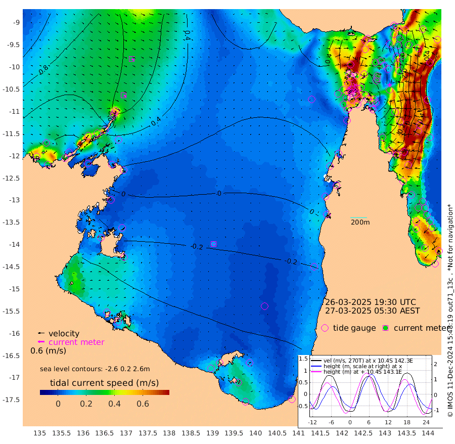 25cm/s 124T +3cm/s rms + 7cm/s -42T. ARA-GOC87 57m 9cm/s 143T +3cm/s rms + 2cm/s -2T. ARA-GOC87 60m 25cm/s 124T +2cm/s rms + 3cm/s 61T. ARA-GOC87 47m -61cm Daru -49cm Bobo Island 41cm Meer Island Barge 16cm Bramble Cay -22cm Unnamed Cay -24cm Pearce Cay -6cm Stephens Island -19cm Merrie England Shoals -58cm Mutacomal Reef 4cm Darnley Island Barge 37cm East Cay -26cm Yorke Island Barge -38cm Rennel Island -41cm Aureed Island -61cm Dungeness Reef -98cm Zagai Island -91cm Yam Island -96cm Dauan Island -93cm Saibai Island -115cm Phipi Reef -106cm Warrior Reef - West -70cm Mabuiag Island Barge -31cm Half Way Island -71cm Coconut Island -45cm Dugong Islet -81cm Poll Island -73cm Kirkcaldie Reef -108cm Suarji Island -77cm Sue Islet 26cm Hawkesbury Island -86cm Alert Patches -85cm Twin Island -3cm Badu Island -97cm St Pauls (Moa Island) -10cm Kubin (Moa Island) -65cm Ince Point -46cm Thursday Island -53cm Nardana Patches -20cm Turtle Head -10cm Round Island 32cm Goods Island 57cm Booby Island 45cm White Rocks Area 60cm Carpentaria -75cm Papou Point 47cm Bampfield Head 40cm Crab Island 43cm Red Wallis Island 2cm Packe Island -66cm Harrington Reef 26cm Herald Camp -45cm Sharp Point -19cm Red Island Point -59cm Possession Island -81cm Alpha Rock -79cm Frederick Point -64cm Wyborn Reef Light -73cm Tetley Island 16cm Triangle Reef -42cm Turtle Head Island 34cm Maclennan Cay 55cm Raine Island -20cm Mcsweeny Reef -10cm Collette Reef 27cm Shadwell Reef -5cm Hannibal Island 14cm Round Point 48cm Vrilya Point 21cm Cape Grenville 30cm Hicks Island 42cm Sir Charles Hardy Island 6cm Harvey Island 43cm Kay Reef 50cm Rocky Island 56cm Chapman Island 58cm Ham Reef 54cm Jubilee Reef 40cm Night Island 55cm Unnamed Reef No. 3 54cm Morris Island 60cm 1st 3 Mile Opening 56cm Creech Reef 44cm Fife Island 78cm Eden Reef 59cm Stanley Island 63cm Normanby River 132cm Yabooma Island 134cm Hutchison River 118cm Elcho Island 109cm North West Crocodile Island 88cm Cape Wessel 101cm Stevens Island 77cm Guluwuru Island 97cm Hopeful Bay 92cm Auster Point 103cm Two Island Bay 122cm Cadell Strait 68cm Mallison Island 61cm Melville Bay (Gove Harbour) 68cm Truant Island 34cm Cape Arnhem 7cm Cape Grey -20cm Hawk Island -38cm Milner Bay (Groote Eylandt) -47cm Cape Beatrice -78cm West Island -83cm Centre Island -104cm Mornington Island -94cm West Wellesley Islands -95cm Bountiful Island -121cm Albert River Mouth -135cm Sweers Island -131cm Karumba -64cm Nassau River Offshore -30cm Christmas Creek 13cm Archer River 26cm Boyd Point 36cm Weipa (Humbug Point) 23cm Pennefather River 40cm Cullen Point