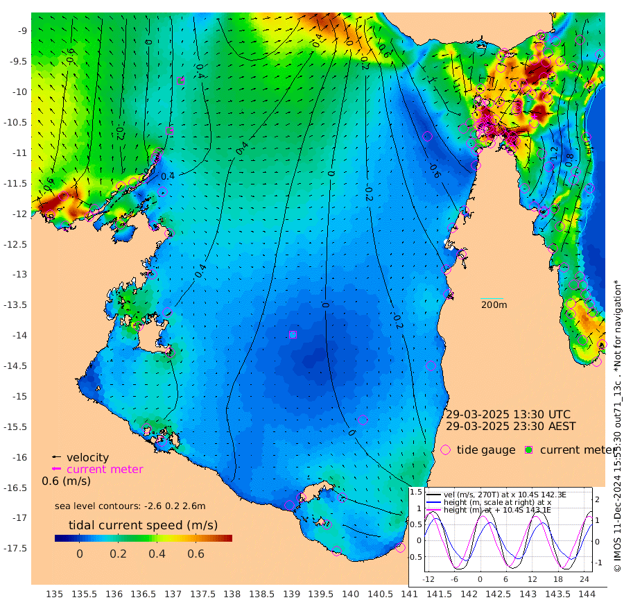 25cm/s 78T +3cm/s rms + 7cm/s -42T. ARA-GOC87 57m 10cm/s 13T +3cm/s rms + 2cm/s -2T. ARA-GOC87 60m 27cm/s 64T +2cm/s rms + 3cm/s 61T. ARA-GOC87 47m 147cm Daru 145cm Bobo Island 57cm Meer Island Barge 90cm Bramble Cay 126cm Unnamed Cay 126cm Pearce Cay 115cm Stephens Island 124cm Merrie England Shoals 141cm Mutacomal Reef 104cm Darnley Island Barge 62cm East Cay 123cm Yorke Island Barge 126cm Rennel Island 130cm Aureed Island 131cm Dungeness Reef 129cm Zagai Island 114cm Yam Island 66cm Dauan Island 64cm Saibai Island 99cm Phipi Reef 124cm Warrior Reef - West 37cm Mabuiag Island Barge 123cm Half Way Island 142cm Coconut Island 126cm Dugong Islet 126cm Poll Island 125cm Kirkcaldie Reef 123cm Suarji Island 121cm Sue Islet -70cm Hawkesbury Island 94cm Alert Patches 100cm Twin Island -36cm Badu Island 102cm St Pauls (Moa Island) -13cm Kubin (Moa Island) 55cm Ince Point 28cm Thursday Island 35cm Nardana Patches -6cm Turtle Head -17cm Round Island -68cm Goods Island -106cm Booby Island -90cm White Rocks Area -102cm Carpentaria 85cm Papou Point -70cm Bampfield Head -87cm Crab Island -99cm Red Wallis Island -39cm Packe Island 149cm Harrington Reef -69cm Herald Camp 36cm Sharp Point -10cm Red Island Point 60cm Possession Island 99cm Alpha Rock 122cm Frederick Point 147cm Wyborn Reef Light 145cm Tetley Island 56cm Triangle Reef 147cm Turtle Head Island 51cm Maclennan Cay 25cm Raine Island 116cm Mcsweeny Reef 104cm Collette Reef 58cm Shadwell Reef 114cm Hannibal Island 90cm Round Point -95cm Vrilya Point 75cm Cape Grenville 69cm Hicks Island 54cm Sir Charles Hardy Island 24cm Harvey Island 53cm Kay Reef 37cm Rocky Island 23cm Chapman Island 20cm Ham Reef 33cm Jubilee Reef 38cm Night Island 22cm Unnamed Reef No. 3 39cm Morris Island 31cm 1st 3 Mile Opening 33cm Creech Reef 42cm Fife Island 31cm Eden Reef 36cm Stanley Island 42cm Normanby River -25cm Yabooma Island 1cm Hutchison River -16cm Elcho Island -23cm North West Crocodile Island 23cm Cape Wessel 16cm Stevens Island 70cm Guluwuru Island 3cm Hopeful Bay 21cm Auster Point 13cm Two Island Bay 31cm Cadell Strait 141cm Mallison Island 61cm Melville Bay (Gove Harbour) 64cm Truant Island 54cm Cape Arnhem 51cm Cape Grey 49cm Hawk Island 38cm Milner Bay (Groote Eylandt) 27cm Cape Beatrice 20cm West Island 24cm Centre Island 41cm Mornington Island 32cm West Wellesley Islands 33cm Bountiful Island 34cm Albert River Mouth 59cm Sweers Island 36cm Karumba 6cm Nassau River Offshore -14cm Christmas Creek -48cm Archer River -56cm Boyd Point -70cm Weipa (Humbug Point) -54cm Pennefather River -89cm Cullen Point