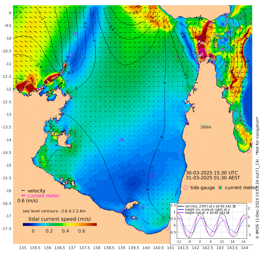 12cm/s 55T +3cm/s rms + 7cm/s -42T. ARA-GOC87 57m 8cm/s 80T +3cm/s rms + 2cm/s -2T. ARA-GOC87 60m 11cm/s 30T +2cm/s rms + 3cm/s 61T. ARA-GOC87 47m 87cm Daru 78cm Bobo Island 3cm Meer Island Barge 17cm Bramble Cay 56cm Unnamed Cay 51cm Pearce Cay 42cm Stephens Island 47cm Merrie England Shoals 78cm Mutacomal Reef 43cm Darnley Island Barge -4cm East Cay 68cm Yorke Island Barge 60cm Rennel Island 73cm Aureed Island 83cm Dungeness Reef 122cm Zagai Island 105cm Yam Island 102cm Dauan Island 108cm Saibai Island 112cm Phipi Reef 118cm Warrior Reef - West 70cm Mabuiag Island Barge 60cm Half Way Island 92cm Coconut Island 73cm Dugong Islet 95cm Poll Island 90cm Kirkcaldie Reef 115cm Suarji Island 104cm Sue Islet -46cm Hawkesbury Island 90cm Alert Patches 91cm Twin Island -9cm Badu Island 105cm St Pauls (Moa Island) 3cm Kubin (Moa Island) 64cm Ince Point 44cm Thursday Island 51cm Nardana Patches 11cm Turtle Head 0cm Round Island -44cm Goods Island -65cm Booby Island -64cm White Rocks Area -34cm Carpentaria 81cm Papou Point -35cm Bampfield Head -53cm Crab Island -61cm Red Wallis Island -20cm Packe Island 88cm Harrington Reef -33cm Herald Camp 45cm Sharp Point 1cm Red Island Point 61cm Possession Island 90cm Alpha Rock 91cm Frederick Point 88cm Wyborn Reef Light 93cm Tetley Island 13cm Triangle Reef 77cm Turtle Head Island 1cm Maclennan Cay -23cm Raine Island 52cm Mcsweeny Reef 43cm Collette Reef 10cm Shadwell Reef 43cm Hannibal Island 12cm Round Point -50cm Vrilya Point 11cm Cape Grenville 5cm Hicks Island 2cm Sir Charles Hardy Island 5cm Harvey Island -9cm Kay Reef -16cm Rocky Island -26cm Chapman Island -24cm Ham Reef -16cm Jubilee Reef -10cm Night Island -25cm Unnamed Reef No. 3 -19cm Morris Island -16cm 1st 3 Mile Opening -17cm Creech Reef -19cm Fife Island -33cm Eden Reef -21cm Stanley Island -29cm Normanby River -163cm Yabooma Island -162cm Hutchison River -151cm Elcho Island -154cm North West Crocodile Island -61cm Cape Wessel -111cm Stevens Island -6cm Guluwuru Island -111cm Hopeful Bay -78cm Auster Point -86cm Two Island Bay -107cm Cadell Strait 100cm Mallison Island -16cm Melville Bay (Gove Harbour) -13cm Truant Island 8cm Cape Arnhem 15cm Cape Grey 18cm Hawk Island 27cm Milner Bay (Groote Eylandt) 17cm Cape Beatrice 38cm West Island 44cm Centre Island 35cm Mornington Island 29cm West Wellesley Islands 18cm Bountiful Island 1cm Albert River Mouth 21cm Sweers Island 3cm Karumba 4cm Nassau River Offshore -4cm Christmas Creek -31cm Archer River -26cm Boyd Point -45cm Weipa (Humbug Point) -27cm Pennefather River -43cm Cullen Point
