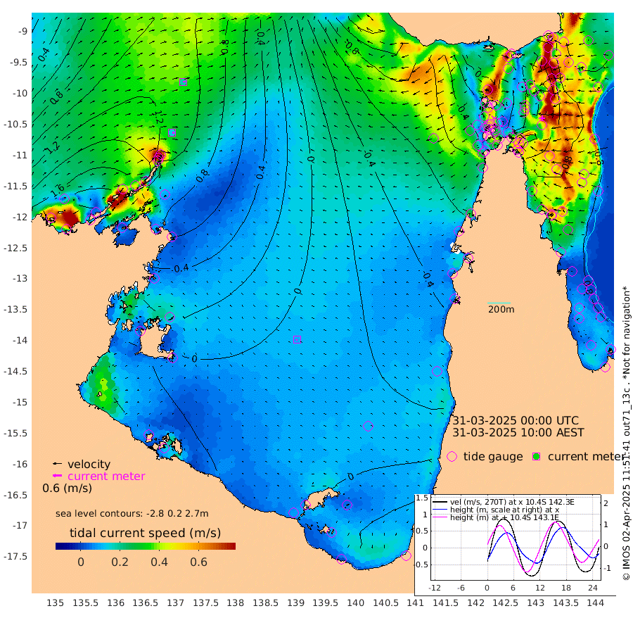 15cm/s 99T +3cm/s rms + 7cm/s -42T. ARA-GOC87 57m 10cm/s -133T +3cm/s rms + 2cm/s -2T. ARA-GOC87 60m 18cm/s 81T +2cm/s rms + 3cm/s 61T. ARA-GOC87 47m 81cm Daru 92cm Bobo Island 80cm Meer Island Barge 99cm Bramble Cay 94cm Unnamed Cay 104cm Pearce Cay 99cm Stephens Island 95cm Merrie England Shoals 83cm Mutacomal Reef 88cm Darnley Island Barge 93cm East Cay 81cm Yorke Island Barge 89cm Rennel Island 82cm Aureed Island 70cm Dungeness Reef 26cm Zagai Island 31cm Yam Island -8cm Dauan Island -18cm Saibai Island 2cm Phipi Reef 31cm Warrior Reef - West -18cm Mabuiag Island Barge 84cm Half Way Island 65cm Coconut Island 79cm Dugong Islet 49cm Poll Island 49cm Kirkcaldie Reef 24cm Suarji Island 35cm Sue Islet -4cm Hawkesbury Island 12cm Alert Patches 20cm Twin Island -15cm Badu Island 10cm St Pauls (Moa Island) 3cm Kubin (Moa Island) 1cm Ince Point -8cm Thursday Island -6cm Nardana Patches -6cm Turtle Head -10cm Round Island -11cm Goods Island -38cm Booby Island -19cm White Rocks Area -77cm Carpentaria 15cm Papou Point -34cm Bampfield Head -48cm Crab Island -34cm Red Wallis Island -8cm Packe Island 80cm Harrington Reef -21cm Herald Camp -11cm Sharp Point -5cm Red Island Point 4cm Possession Island 22cm Alpha Rock 46cm Frederick Point 79cm Wyborn Reef Light 70cm Tetley Island 67cm Triangle Reef 89cm Turtle Head Island 77cm Maclennan Cay 67cm Raine Island 87cm Mcsweeny Reef 81cm Collette Reef 68cm Shadwell Reef 93cm Hannibal Island 103cm Round Point -68cm Vrilya Point 86cm Cape Grenville 90cm Hicks Island 89cm Sir Charles Hardy Island 27cm Harvey Island 85cm Kay Reef 79cm Rocky Island 74cm Chapman Island 69cm Ham Reef 73cm Jubilee Reef 66cm Night Island 69cm Unnamed Reef No. 3 83cm Morris Island 69cm 1st 3 Mile Opening 73cm Creech Reef 85cm Fife Island 95cm Eden Reef 79cm Stanley Island 101cm Normanby River 214cm Yabooma Island 252cm Hutchison River 207cm Elcho Island 202cm North West Crocodile Island 141cm Cape Wessel 187cm Stevens Island 136cm Guluwuru Island 169cm Hopeful Bay 153cm Auster Point 161cm Two Island Bay 219cm Cadell Strait 73cm Mallison Island 128cm Melville Bay (Gove Harbour) 130cm Truant Island 78cm Cape Arnhem 54cm Cape Grey 38cm Hawk Island -3cm Milner Bay (Groote Eylandt) -3cm Cape Beatrice -47cm West Island -61cm Centre Island -22cm Mornington Island -22cm West Wellesley Islands 16cm Bountiful Island 12cm Albert River Mouth 8cm Sweers Island 8cm Karumba -9cm Nassau River Offshore -15cm Christmas Creek -24cm Archer River -30cm Boyd Point -21cm Weipa (Humbug Point) -55cm Pennefather River -54cm Cullen Point