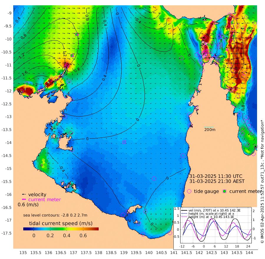 33cm/s 119T +3cm/s rms + 7cm/s -42T. ARA-GOC87 57m 8cm/s -54T +3cm/s rms + 2cm/s -2T. ARA-GOC87 60m 34cm/s 109T +2cm/s rms + 3cm/s 61T. ARA-GOC87 47m 29cm Daru 44cm Bobo Island 64cm Meer Island Barge 70cm Bramble Cay 47cm Unnamed Cay 64cm Pearce Cay 61cm Stephens Island 56cm Merrie England Shoals 28cm Mutacomal Reef 51cm Darnley Island Barge 75cm East Cay 33cm Yorke Island Barge 45cm Rennel Island 37cm Aureed Island 24cm Dungeness Reef -26cm Zagai Island -25cm Yam Island -51cm Dauan Island -71cm Saibai Island -27cm Phipi Reef -27cm Warrior Reef - West -46cm Mabuiag Island Barge 40cm Half Way Island 26cm Coconut Island 24cm Dugong Islet 1cm Poll Island 5cm Kirkcaldie Reef -22cm Suarji Island -21cm Sue Islet 19cm Hawkesbury Island -15cm Alert Patches -14cm Twin Island 16cm Badu Island -30cm St Pauls (Moa Island) 10cm Kubin (Moa Island) -16cm Ince Point -11cm Thursday Island -14cm Nardana Patches 11cm Turtle Head 12cm Round Island 32cm Goods Island 27cm Booby Island 35cm White Rocks Area -18cm Carpentaria -16cm Papou Point 28cm Bampfield Head 30cm Crab Island 24cm Red Wallis Island 23cm Packe Island 30cm Harrington Reef 9cm Herald Camp -26cm Sharp Point 12cm Red Island Point -3cm Possession Island -26cm Alpha Rock 3cm Frederick Point 26cm Wyborn Reef Light 16cm Tetley Island 48cm Triangle Reef 46cm Turtle Head Island 58cm Maclennan Cay 73cm Raine Island 48cm Mcsweeny Reef 49cm Collette Reef 55cm Shadwell Reef 59cm Hannibal Island 78cm Round Point 16cm Vrilya Point 62cm Cape Grenville 70cm Hicks Island 57cm Sir Charles Hardy Island 19cm Harvey Island 69cm Kay Reef 69cm Rocky Island 73cm Chapman Island 63cm Ham Reef 66cm Jubilee Reef 64cm Night Island 69cm Unnamed Reef No. 3 76cm Morris Island 71cm 1st 3 Mile Opening 70cm Creech Reef 80cm Fife Island 91cm Eden Reef 74cm Stanley Island 86cm Normanby River 200cm Yabooma Island 236cm Hutchison River 199cm Elcho Island 188cm North West Crocodile Island 113cm Cape Wessel 175cm Stevens Island 99cm Guluwuru Island 159cm Hopeful Bay 138cm Auster Point 134cm Two Island Bay 196cm Cadell Strait 32cm Mallison Island 98cm Melville Bay (Gove Harbour) 102cm Truant Island 59cm Cape Arnhem 29cm Cape Grey 18cm Hawk Island -15cm Milner Bay (Groote Eylandt) -19cm Cape Beatrice -70cm West Island -68cm Centre Island -31cm Mornington Island -38cm West Wellesley Islands -31cm Bountiful Island -5cm Albert River Mouth -13cm Sweers Island -4cm Karumba -8cm Nassau River Offshore 2cm Christmas Creek 21cm Archer River 7cm Boyd Point 23cm Weipa (Humbug Point) 20cm Pennefather River 5cm Cullen Point