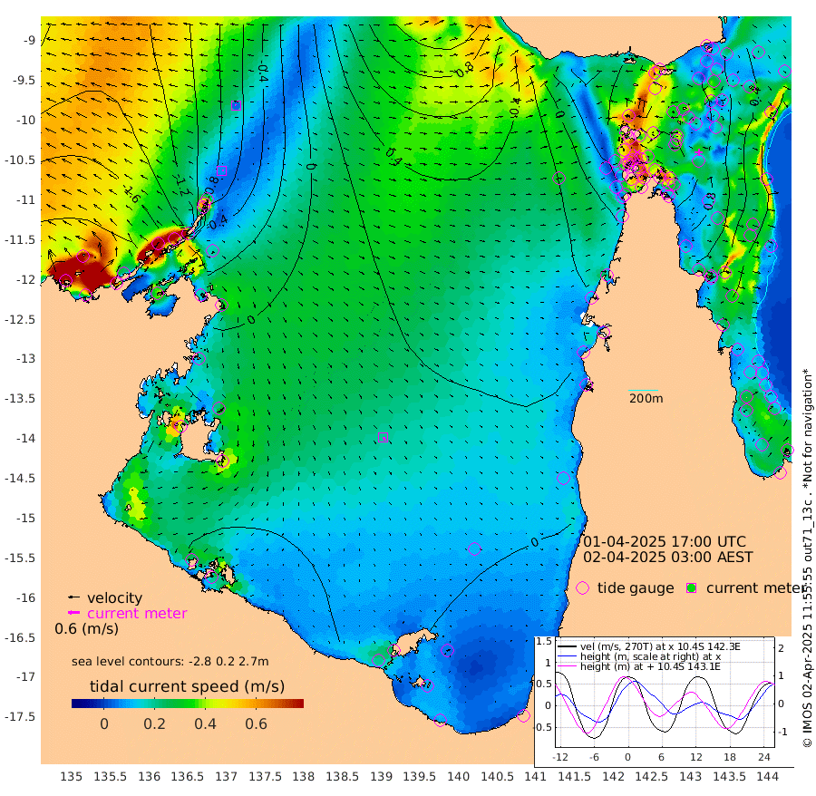 7cm/s 80T +3cm/s rms + 7cm/s -42T. ARA-GOC87 57m 20cm/s 147T +3cm/s rms + 2cm/s -2T. ARA-GOC87 60m 4cm/s -35T +2cm/s rms + 3cm/s 61T. ARA-GOC87 47m 76cm Daru 68cm Bobo Island 30cm Meer Island Barge 34cm Bramble Cay 59cm Unnamed Cay 53cm Pearce Cay 52cm Stephens Island 53cm Merrie England Shoals 68cm Mutacomal Reef 59cm Darnley Island Barge 22cm East Cay 71cm Yorke Island Barge 57cm Rennel Island 71cm Aureed Island 74cm Dungeness Reef 93cm Zagai Island 81cm Yam Island 83cm Dauan Island 88cm Saibai Island 84cm Phipi Reef 93cm Warrior Reef - West 54cm Mabuiag Island Barge 63cm Half Way Island 75cm Coconut Island 71cm Dugong Islet 76cm Poll Island 78cm Kirkcaldie Reef 84cm Suarji Island 87cm Sue Islet -20cm Hawkesbury Island 73cm Alert Patches 73cm Twin Island 4cm Badu Island 81cm St Pauls (Moa Island) 14cm Kubin (Moa Island) 55cm Ince Point 44cm Thursday Island 47cm Nardana Patches 23cm Turtle Head 6cm Round Island -11cm Goods Island -20cm Booby Island -29cm White Rocks Area 14cm Carpentaria 61cm Papou Point -7cm Bampfield Head -16cm Crab Island -19cm Red Wallis Island 5cm Packe Island 75cm Harrington Reef -4cm Herald Camp 33cm Sharp Point 9cm Red Island Point 47cm Possession Island 71cm Alpha Rock 74cm Frederick Point 70cm Wyborn Reef Light 73cm Tetley Island 32cm Triangle Reef 67cm Turtle Head Island 28cm Maclennan Cay 10cm Raine Island 57cm Mcsweeny Reef 52cm Collette Reef 33cm Shadwell Reef 54cm Hannibal Island 29cm Round Point -4cm Vrilya Point 33cm Cape Grenville 27cm Hicks Island 34cm Sir Charles Hardy Island 11cm Harvey Island 21cm Kay Reef 15cm Rocky Island 9cm Chapman Island 12cm Ham Reef 17cm Jubilee Reef 19cm Night Island 11cm Unnamed Reef No. 3 14cm Morris Island 20cm 1st 3 Mile Opening 19cm Creech Reef 12cm Fife Island 11cm Eden Reef 17cm Stanley Island 8cm Normanby River -202cm Yabooma Island -212cm Hutchison River -196cm Elcho Island -199cm North West Crocodile Island -88cm Cape Wessel -156cm Stevens Island -25cm Guluwuru Island -149cm Hopeful Bay -112cm Auster Point -115cm Two Island Bay -140cm Cadell Strait 118cm Mallison Island -41cm Melville Bay (Gove Harbour) -39cm Truant Island -10cm Cape Arnhem -8cm Cape Grey -10cm Hawk Island -6cm Milner Bay (Groote Eylandt) -9cm Cape Beatrice 12cm West Island 17cm Centre Island 14cm Mornington Island 14cm West Wellesley Islands -10cm Bountiful Island -46cm Albert River Mouth -41cm Sweers Island -43cm Karumba 13cm Nassau River Offshore 25cm Christmas Creek 7cm Archer River 15cm Boyd Point -1cm Weipa (Humbug Point) 10cm Pennefather River 0cm Cullen Point