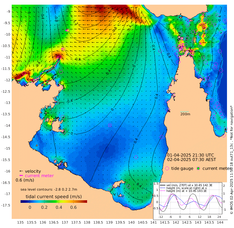 47cm/s -88T +3cm/s rms + 7cm/s -42T. ARA-GOC87 57m 7cm/s -133T +3cm/s rms + 2cm/s -2T. ARA-GOC87 60m 46cm/s -100T +2cm/s rms + 3cm/s 61T. ARA-GOC87 47m -54cm Daru -64cm Bobo Island -27cm Meer Island Barge -34cm Bramble Cay -40cm Unnamed Cay -53cm Pearce Cay -45cm Stephens Island -37cm Merrie England Shoals -41cm Mutacomal Reef -47cm Darnley Island Barge -24cm East Cay -52cm Yorke Island Barge -41cm Rennel Island -52cm Aureed Island -39cm Dungeness Reef -48cm Zagai Island -33cm Yam Island -11cm Dauan Island -16cm Saibai Island -7cm Phipi Reef -42cm Warrior Reef - West 18cm Mabuiag Island Barge -45cm Half Way Island -47cm Coconut Island -41cm Dugong Islet -36cm Poll Island -34cm Kirkcaldie Reef -8cm Suarji Island -38cm Sue Islet 86cm Hawkesbury Island 5cm Alert Patches -10cm Twin Island 68cm Badu Island -12cm St Pauls (Moa Island) 52cm Kubin (Moa Island) 18cm Ince Point 36cm Thursday Island 31cm Nardana Patches 59cm Turtle Head 72cm Round Island 92cm Goods Island 113cm Booby Island 111cm White Rocks Area 89cm Carpentaria -15cm Papou Point 114cm Bampfield Head 85cm Crab Island 103cm Red Wallis Island 75cm Packe Island -46cm Harrington Reef 102cm Herald Camp -7cm Sharp Point 46cm Red Island Point 23cm Possession Island -14cm Alpha Rock -28cm Frederick Point -47cm Wyborn Reef Light -45cm Tetley Island -21cm Triangle Reef -54cm Turtle Head Island -17cm Maclennan Cay -7cm Raine Island -40cm Mcsweeny Reef -34cm Collette Reef -18cm Shadwell Reef -39cm Hannibal Island -30cm Round Point 79cm Vrilya Point -19cm Cape Grenville -24cm Hicks Island -16cm Sir Charles Hardy Island -9cm Harvey Island -11cm Kay Reef -8cm Rocky Island -2cm Chapman Island -5cm Ham Reef -12cm Jubilee Reef -11cm Night Island -4cm Unnamed Reef No. 3 -10cm Morris Island -5cm 1st 3 Mile Opening -9cm Creech Reef -16cm Fife Island -14cm Eden Reef -7cm Stanley Island -15cm Normanby River -39cm Yabooma Island -72cm Hutchison River -53cm Elcho Island -45cm North West Crocodile Island -88cm Cape Wessel -77cm Stevens Island -133cm Guluwuru Island -54cm Hopeful Bay -74cm Auster Point -88cm Two Island Bay -132cm Cadell Strait -232cm Mallison Island -101cm Melville Bay (Gove Harbour) -112cm Truant Island -80cm Cape Arnhem -47cm Cape Grey -31cm Hawk Island -3cm Milner Bay (Groote Eylandt) 9cm Cape Beatrice 42cm West Island 42cm Centre Island 39cm Mornington Island 46cm West Wellesley Islands 73cm Bountiful Island 54cm Albert River Mouth 57cm Sweers Island 61cm Karumba 55cm Nassau River Offshore 56cm Christmas Creek 64cm Archer River 60cm Boyd Point 79cm Weipa (Humbug Point) 51cm Pennefather River 81cm Cullen Point