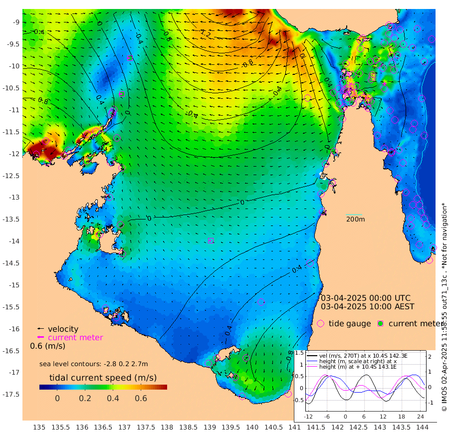 31cm/s -90T +3cm/s rms + 7cm/s -42T. ARA-GOC87 57m 16cm/s -105T +3cm/s rms + 2cm/s -2T. ARA-GOC87 60m 26cm/s -96T +2cm/s rms + 3cm/s 61T. ARA-GOC87 47m -12cm Daru -17cm Bobo Island -13cm Meer Island Barge -9cm Bramble Cay -12cm Unnamed Cay -9cm Pearce Cay -15cm Stephens Island -14cm Merrie England Shoals -8cm Mutacomal Reef -24cm Darnley Island Barge -7cm East Cay -23cm Yorke Island Barge -7cm Rennel Island -14cm Aureed Island 0cm Dungeness Reef -4cm Zagai Island 4cm Yam Island 35cm Dauan Island 16cm Saibai Island 46cm Phipi Reef 12cm Warrior Reef - West 28cm Mabuiag Island Barge -18cm Half Way Island -9cm Coconut Island -13cm Dugong Islet 0cm Poll Island -7cm Kirkcaldie Reef 24cm Suarji Island -14cm Sue Islet 58cm Hawkesbury Island 17cm Alert Patches 9cm Twin Island 60cm Badu Island 12cm St Pauls (Moa Island) 47cm Kubin (Moa Island) 24cm Ince Point 29cm Thursday Island 30cm Nardana Patches 50cm Turtle Head 54cm Round Island 63cm Goods Island 56cm Booby Island 66cm White Rocks Area -2cm Carpentaria 6cm Papou Point 53cm Bampfield Head 35cm Crab Island 53cm Red Wallis Island 55cm Packe Island -14cm Harrington Reef 59cm Herald Camp -3cm Sharp Point 36cm Red Island Point 25cm Possession Island 0cm Alpha Rock 0cm Frederick Point -10cm Wyborn Reef Light -9cm Tetley Island -4cm Triangle Reef -21cm Turtle Head Island -6cm Maclennan Cay -1cm Raine Island -13cm Mcsweeny Reef -14cm Collette Reef -9cm Shadwell Reef -16cm Hannibal Island -5cm Round Point 8cm Vrilya Point -9cm Cape Grenville -7cm Hicks Island -4cm Sir Charles Hardy Island -4cm Harvey Island -7cm Kay Reef -1cm Rocky Island 2cm Chapman Island -5cm Ham Reef -7cm Jubilee Reef -5cm Night Island -4cm Unnamed Reef No. 3 -2cm Morris Island -3cm 1st 3 Mile Opening -7cm Creech Reef -3cm Fife Island -5cm Eden Reef -8cm Stanley Island -6cm Normanby River 102cm Yabooma Island 113cm Hutchison River 99cm Elcho Island 102cm North West Crocodile Island 8cm Cape Wessel 59cm Stevens Island -26cm Guluwuru Island 63cm Hopeful Bay 30cm Auster Point 21cm Two Island Bay 36cm Cadell Strait -170cm Mallison Island -1cm Melville Bay (Gove Harbour) -11cm Truant Island -12cm Cape Arnhem -1cm Cape Grey 12cm Hawk Island 10cm Milner Bay (Groote Eylandt) 21cm Cape Beatrice 18cm West Island 12cm Centre Island 58cm Mornington Island 56cm West Wellesley Islands 112cm Bountiful Island 128cm Albert River Mouth 123cm Sweers Island 128cm Karumba 67cm Nassau River Offshore 51cm Christmas Creek 37cm Archer River 24cm Boyd Point 48cm Weipa (Humbug Point) 1cm Pennefather River 22cm Cullen Point