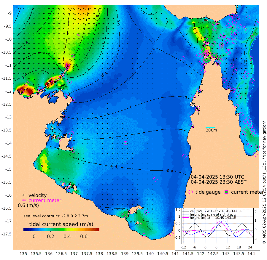 36cm/s 122T +3cm/s rms + 7cm/s -42T. ARA-GOC87 57m 16cm/s 13T +3cm/s rms + 2cm/s -2T. ARA-GOC87 60m 39cm/s 116T +2cm/s rms + 3cm/s 61T. ARA-GOC87 47m -40cm Daru -34cm Bobo Island -34cm Meer Island Barge -37cm Bramble Cay -46cm Unnamed Cay -34cm Pearce Cay -44cm Stephens Island -49cm Merrie England Shoals -43cm Mutacomal Reef -48cm Darnley Island Barge -33cm East Cay -45cm Yorke Island Barge -40cm Rennel Island -42cm Aureed Island -33cm Dungeness Reef -10cm Zagai Island -11cm Yam Island 14cm Dauan Island 10cm Saibai Island 5cm Phipi Reef -16cm Warrior Reef - West 34cm Mabuiag Island Barge -43cm Half Way Island -24cm Coconut Island -46cm Dugong Islet -20cm Poll Island -27cm Kirkcaldie Reef -10cm Suarji Island -26cm Sue Islet 89cm Hawkesbury Island 1cm Alert Patches 1cm Twin Island 88cm Badu Island 4cm St Pauls (Moa Island) 61cm Kubin (Moa Island) 21cm Ince Point 34cm Thursday Island 31cm Nardana Patches 47cm Turtle Head 71cm Round Island 78cm Goods Island 90cm Booby Island 87cm White Rocks Area 62cm Carpentaria 17cm Papou Point 100cm Bampfield Head 81cm Crab Island 82cm Red Wallis Island 61cm Packe Island -40cm Harrington Reef 72cm Herald Camp -9cm Sharp Point 53cm Red Island Point 29cm Possession Island -11cm Alpha Rock -14cm Frederick Point -28cm Wyborn Reef Light -23cm Tetley Island -23cm Triangle Reef -21cm Turtle Head Island -32cm Maclennan Cay -19cm Raine Island -43cm Mcsweeny Reef -43cm Collette Reef -33cm Shadwell Reef -48cm Hannibal Island -34cm Round Point 67cm Vrilya Point -43cm Cape Grenville -33cm Hicks Island -39cm Sir Charles Hardy Island -14cm Harvey Island -38cm Kay Reef -29cm Rocky Island -22cm Chapman Island -25cm Ham Reef -28cm Jubilee Reef -30cm Night Island -26cm Unnamed Reef No. 3 -30cm Morris Island -26cm 1st 3 Mile Opening -31cm Creech Reef -34cm Fife Island -34cm Eden Reef -37cm Stanley Island -38cm Normanby River 192cm Yabooma Island 217cm Hutchison River 189cm Elcho Island 182cm North West Crocodile Island 119cm Cape Wessel 170cm Stevens Island 83cm Guluwuru Island 149cm Hopeful Bay 136cm Auster Point 136cm Two Island Bay 172cm Cadell Strait -4cm Mallison Island 83cm Melville Bay (Gove Harbour) 92cm Truant Island 48cm Cape Arnhem 17cm Cape Grey -1cm Hawk Island -26cm Milner Bay (Groote Eylandt) -45cm Cape Beatrice -92cm West Island -88cm Centre Island -113cm Mornington Island -124cm West Wellesley Islands -122cm Bountiful Island -114cm Albert River Mouth -120cm Sweers Island -112cm Karumba -92cm Nassau River Offshore -63cm Christmas Creek -7cm Archer River 9cm Boyd Point 16cm Weipa (Humbug Point) 30cm Pennefather River 49cm Cullen Point