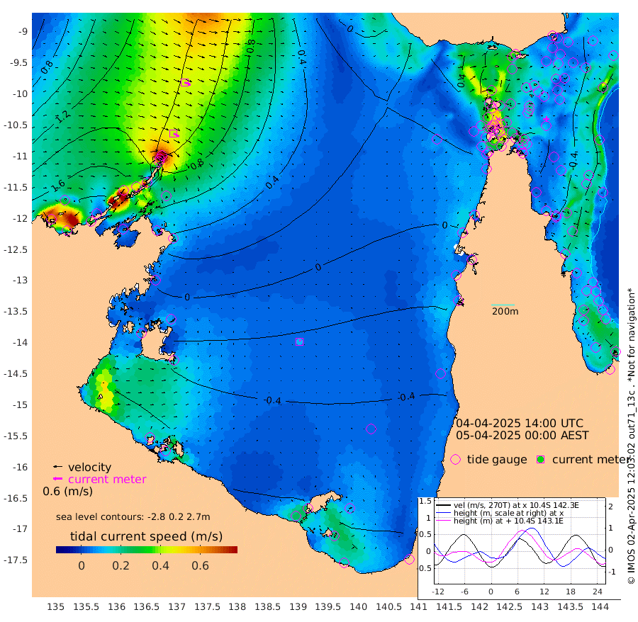 41cm/s 119T +3cm/s rms + 7cm/s -42T. ARA-GOC87 57m 11cm/s 21T +3cm/s rms + 2cm/s -2T. ARA-GOC87 60m 43cm/s 113T +2cm/s rms + 3cm/s 61T. ARA-GOC87 47m -34cm Daru -27cm Bobo Island -23cm Meer Island Barge -28cm Bramble Cay -40cm Unnamed Cay -26cm Pearce Cay -37cm Stephens Island -44cm Merrie England Shoals -41cm Mutacomal Reef -37cm Darnley Island Barge -23cm East Cay -37cm Yorke Island Barge -35cm Rennel Island -34cm Aureed Island -29cm Dungeness Reef -5cm Zagai Island -9cm Yam Island 21cm Dauan Island 17cm Saibai Island 11cm Phipi Reef -9cm Warrior Reef - West 32cm Mabuiag Island Barge -39cm Half Way Island -21cm Coconut Island -42cm Dugong Islet -18cm Poll Island -27cm Kirkcaldie Reef -12cm Suarji Island -24cm Sue Islet 82cm Hawkesbury Island -3cm Alert Patches -1cm Twin Island 84cm Badu Island 2cm St Pauls (Moa Island) 57cm Kubin (Moa Island) 17cm Ince Point 29cm Thursday Island 26cm Nardana Patches 43cm Turtle Head 64cm Round Island 73cm Goods Island 82cm Booby Island 78cm White Rocks Area 55cm Carpentaria 14cm Papou Point 92cm Bampfield Head 74cm Crab Island 74cm Red Wallis Island 56cm Packe Island -39cm Harrington Reef 65cm Herald Camp -10cm Sharp Point 47cm Red Island Point 24cm Possession Island -13cm Alpha Rock -15cm Frederick Point -25cm Wyborn Reef Light -21cm Tetley Island -14cm Triangle Reef -19cm Turtle Head Island -23cm Maclennan Cay -9cm Raine Island -36cm Mcsweeny Reef -36cm Collette Reef -24cm Shadwell Reef -40cm Hannibal Island -26cm Round Point 59cm Vrilya Point -36cm Cape Grenville -24cm Hicks Island -27cm Sir Charles Hardy Island -11cm Harvey Island -30cm Kay Reef -19cm Rocky Island -11cm Chapman Island -14cm Ham Reef -17cm Jubilee Reef -21cm Night Island -16cm Unnamed Reef No. 3 -20cm Morris Island -16cm 1st 3 Mile Opening -21cm Creech Reef -23cm Fife Island -20cm Eden Reef -28cm Stanley Island -28cm Normanby River 194cm Yabooma Island 224cm Hutchison River 193cm Elcho Island 184cm North West Crocodile Island 130cm Cape Wessel 175cm Stevens Island 104cm Guluwuru Island 155cm Hopeful Bay 143cm Auster Point 145cm Two Island Bay 189cm Cadell Strait 43cm Mallison Island 99cm Melville Bay (Gove Harbour) 110cm Truant Island 61cm Cape Arnhem 22cm Cape Grey 2cm Hawk Island -32cm Milner Bay (Groote Eylandt) -51cm Cape Beatrice -105cm West Island -101cm Centre Island -118cm Mornington Island -128cm West Wellesley Islands -125cm Bountiful Island -120cm Albert River Mouth -129cm Sweers Island -120cm Karumba -92cm Nassau River Offshore -59cm Christmas Creek -4cm Archer River 11cm Boyd Point 18cm Weipa (Humbug Point) 27cm Pennefather River 45cm Cullen Point