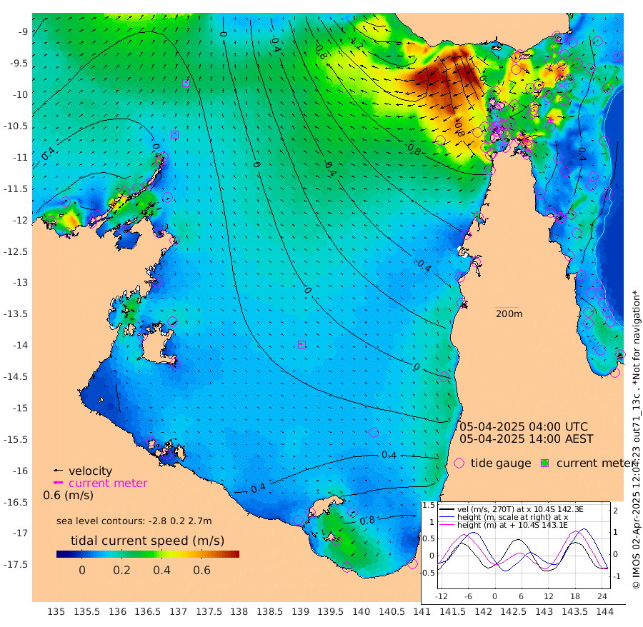 11cm/s -11T +3cm/s rms + 7cm/s -42T. ARA-GOC87 57m 17cm/s -77T +3cm/s rms + 2cm/s -2T. ARA-GOC87 60m 16cm/s 11T +2cm/s rms + 3cm/s 61T. ARA-GOC87 47m -66cm Daru -60cm Bobo Island -36cm Meer Island Barge -50cm Bramble Cay -69cm Unnamed Cay -62cm Pearce Cay -64cm Stephens Island -75cm Merrie England Shoals -77cm Mutacomal Reef -53cm Darnley Island Barge -43cm East Cay -58cm Yorke Island Barge -71cm Rennel Island -56cm Aureed Island -64cm Dungeness Reef -41cm Zagai Island -58cm Yam Island -6cm Dauan Island -11cm Saibai Island -9cm Phipi Reef -31cm Warrior Reef - West -55cm Mabuiag Island Barge -78cm Half Way Island -72cm Coconut Island -79cm Dugong Islet -69cm Poll Island -84cm Kirkcaldie Reef -64cm Suarji Island -67cm Sue Islet -114cm Hawkesbury Island -88cm Alert Patches -87cm Twin Island -87cm Badu Island -80cm St Pauls (Moa Island) -94cm Kubin (Moa Island) -86cm Ince Point -95cm Thursday Island -89cm Nardana Patches -89cm Turtle Head -97cm Round Island -101cm Goods Island -119cm Booby Island -118cm White Rocks Area -128cm Carpentaria -78cm Papou Point -131cm Bampfield Head -104cm Crab Island -116cm Red Wallis Island -102cm Packe Island -93cm Harrington Reef -110cm Herald Camp -18cm Sharp Point -91cm Red Island Point -89cm Possession Island -80cm Alpha Rock -87cm Frederick Point -80cm Wyborn Reef Light -81cm Tetley Island -35cm Triangle Reef -102cm Turtle Head Island -43cm Maclennan Cay -28cm Raine Island -65cm Mcsweeny Reef -56cm Collette Reef -37cm Shadwell Reef -60cm Hannibal Island -57cm Round Point -116cm Vrilya Point -56cm Cape Grenville -46cm Hicks Island -41cm Sir Charles Hardy Island -17cm Harvey Island -48cm Kay Reef -32cm Rocky Island -27cm Chapman Island -29cm Ham Reef -33cm Jubilee Reef -32cm Night Island -33cm Unnamed Reef No. 3 -36cm Morris Island -34cm 1st 3 Mile Opening -36cm Creech Reef -32cm Fife Island -29cm Eden Reef -41cm Stanley Island -43cm Normanby River 56cm Yabooma Island 84cm Hutchison River 76cm Elcho Island 72cm North West Crocodile Island 36cm Cape Wessel 57cm Stevens Island 57cm Guluwuru Island 60cm Hopeful Bay 39cm Auster Point 40cm Two Island Bay 76cm Cadell Strait 65cm Mallison Island 54cm Melville Bay (Gove Harbour) 48cm Truant Island 41cm Cape Arnhem 40cm Cape Grey 51cm Hawk Island 47cm Milner Bay (Groote Eylandt) 51cm Cape Beatrice 40cm West Island 39cm Centre Island 98cm Mornington Island 93cm West Wellesley Islands 136cm Bountiful Island 194cm Albert River Mouth 195cm Sweers Island 175cm Karumba 65cm Nassau River Offshore 22cm Christmas Creek -24cm Archer River -46cm Boyd Point -37cm Weipa (Humbug Point) -75cm Pennefather River -87cm Cullen Point