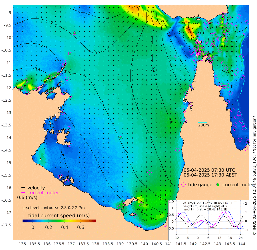 23cm/s 12T +3cm/s rms + 7cm/s -42T. ARA-GOC87 57m 24cm/s -5T +3cm/s rms + 2cm/s -2T. ARA-GOC87 60m 26cm/s 22T +2cm/s rms + 3cm/s 61T. ARA-GOC87 47m -24cm Daru -12cm Bobo Island 10cm Meer Island Barge 6cm Bramble Cay -4cm Unnamed Cay -14cm Pearce Cay 2cm Stephens Island 3cm Merrie England Shoals -19cm Mutacomal Reef 8cm Darnley Island Barge 9cm East Cay -5cm Yorke Island Barge -16cm Rennel Island -12cm Aureed Island -42cm Dungeness Reef -68cm Zagai Island -76cm Yam Island -133cm Dauan Island -112cm Saibai Island -128cm Phipi Reef -84cm Warrior Reef - West -128cm Mabuiag Island Barge -12cm Half Way Island -39cm Coconut Island -23cm Dugong Islet -58cm Poll Island -54cm Kirkcaldie Reef -88cm Suarji Island -50cm Sue Islet -192cm Hawkesbury Island -102cm Alert Patches -93cm Twin Island -194cm Badu Island -104cm St Pauls (Moa Island) -161cm Kubin (Moa Island) -121cm Ince Point -135cm Thursday Island -133cm Nardana Patches -157cm Turtle Head -159cm Round Island -184cm Goods Island -192cm Booby Island -183cm White Rocks Area -132cm Carpentaria -92cm Papou Point -183cm Bampfield Head -160cm Crab Island -182cm Red Wallis Island -170cm Packe Island -25cm Harrington Reef -176cm Herald Camp -22cm Sharp Point -140cm Red Island Point -110cm Possession Island -67cm Alpha Rock -66cm Frederick Point -29cm Wyborn Reef Light -38cm Tetley Island -10cm Triangle Reef -31cm Turtle Head Island 0cm Maclennan Cay -1cm Raine Island -5cm Mcsweeny Reef 1cm Collette Reef 2cm Shadwell Reef 7cm Hannibal Island 3cm Round Point -138cm Vrilya Point 9cm Cape Grenville 5cm Hicks Island -1cm Sir Charles Hardy Island 4cm Harvey Island 12cm Kay Reef 5cm Rocky Island 1cm Chapman Island 5cm Ham Reef 5cm Jubilee Reef 6cm Night Island 4cm Unnamed Reef No. 3 7cm Morris Island 0cm 1st 3 Mile Opening 6cm Creech Reef 13cm Fife Island 15cm Eden Reef 14cm Stanley Island 21cm Normanby River -53cm Yabooma Island -62cm Hutchison River -45cm Elcho Island -47cm North West Crocodile Island 3cm Cape Wessel -23cm Stevens Island 17cm Guluwuru Island -17cm Hopeful Bay -9cm Auster Point -5cm Two Island Bay -25cm Cadell Strait 107cm Mallison Island 8cm Melville Bay (Gove Harbour) 9cm Truant Island 15cm Cape Arnhem 29cm Cape Grey 36cm Hawk Island 63cm Milner Bay (Groote Eylandt) 60cm Cape Beatrice 83cm West Island 84cm Centre Island 67cm Mornington Island 74cm West Wellesley Islands 58cm Bountiful Island 85cm Albert River Mouth 111cm Sweers Island 71cm Karumba 5cm Nassau River Offshore -38cm Christmas Creek -77cm Archer River -89cm Boyd Point -106cm Weipa (Humbug Point) -91cm Pennefather River -126cm Cullen Point