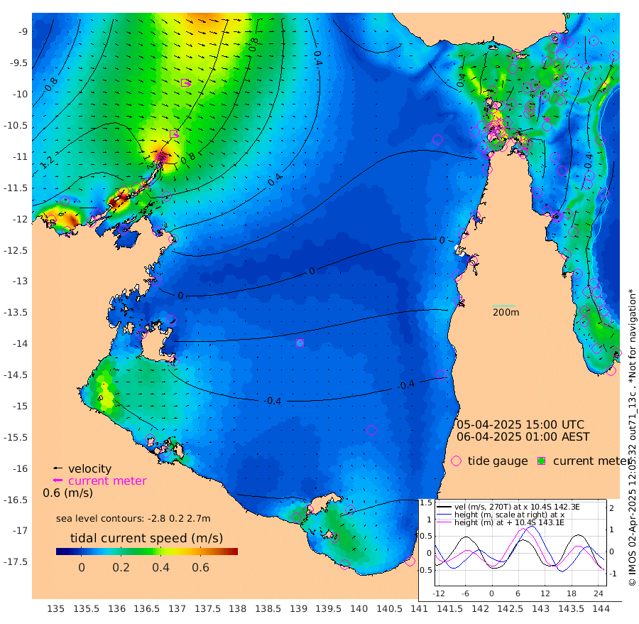 40cm/s 118T +3cm/s rms + 7cm/s -42T. ARA-GOC87 57m 10cm/s 35T +3cm/s rms + 2cm/s -2T. ARA-GOC87 60m 41cm/s 112T +2cm/s rms + 3cm/s 61T. ARA-GOC87 47m -58cm Daru -52cm Bobo Island -35cm Meer Island Barge -49cm Bramble Cay -62cm Unnamed Cay -53cm Pearce Cay -60cm Stephens Island -69cm Merrie England Shoals -65cm Mutacomal Reef -54cm Darnley Island Barge -41cm East Cay -55cm Yorke Island Barge -61cm Rennel Island -55cm Aureed Island -51cm Dungeness Reef -15cm Zagai Island -22cm Yam Island 24cm Dauan Island 24cm Saibai Island 4cm Phipi Reef -20cm Warrior Reef - West 30cm Mabuiag Island Barge -63cm Half Way Island -45cm Coconut Island -65cm Dugong Islet -38cm Poll Island -48cm Kirkcaldie Reef -28cm Suarji Island -36cm Sue Islet 73cm Hawkesbury Island -19cm Alert Patches -18cm Twin Island 75cm Badu Island -11cm St Pauls (Moa Island) 47cm Kubin (Moa Island) 5cm Ince Point 18cm Thursday Island 15cm Nardana Patches 32cm Turtle Head 56cm Round Island 63cm Goods Island 77cm Booby Island 67cm White Rocks Area 61cm Carpentaria 0cm Papou Point 90cm Bampfield Head 67cm Crab Island 67cm Red Wallis Island 45cm Packe Island -67cm Harrington Reef 64cm Herald Camp -12cm Sharp Point 33cm Red Island Point 11cm Possession Island -26cm Alpha Rock -36cm Frederick Point -49cm Wyborn Reef Light -43cm Tetley Island -26cm Triangle Reef -47cm Turtle Head Island -37cm Maclennan Cay -20cm Raine Island -58cm Mcsweeny Reef -54cm Collette Reef -36cm Shadwell Reef -61cm Hannibal Island -50cm Round Point 56cm Vrilya Point -53cm Cape Grenville -41cm Hicks Island -38cm Sir Charles Hardy Island -17cm Harvey Island -45cm Kay Reef -31cm Rocky Island -22cm Chapman Island -23cm Ham Reef -28cm Jubilee Reef -33cm Night Island -27cm Unnamed Reef No. 3 -34cm Morris Island -26cm 1st 3 Mile Opening -32cm Creech Reef -40cm Fife Island -33cm Eden Reef -40cm Stanley Island -45cm Normanby River 166cm Yabooma Island 189cm Hutchison River 164cm Elcho Island 155cm North West Crocodile Island 119cm Cape Wessel 152cm Stevens Island 100cm Guluwuru Island 136cm Hopeful Bay 128cm Auster Point 131cm Two Island Bay 165cm Cadell Strait 73cm Mallison Island 92cm Melville Bay (Gove Harbour) 103cm Truant Island 59cm Cape Arnhem 20cm Cape Grey 0cm Hawk Island -32cm Milner Bay (Groote Eylandt) -53cm Cape Beatrice -103cm West Island -98cm Centre Island -123cm Mornington Island -132cm West Wellesley Islands -129cm Bountiful Island -132cm Albert River Mouth -138cm Sweers Island -133cm Karumba -98cm Nassau River Offshore -63cm Christmas Creek -8cm Archer River 12cm Boyd Point 17cm Weipa (Humbug Point) 23cm Pennefather River 47cm Cullen Point