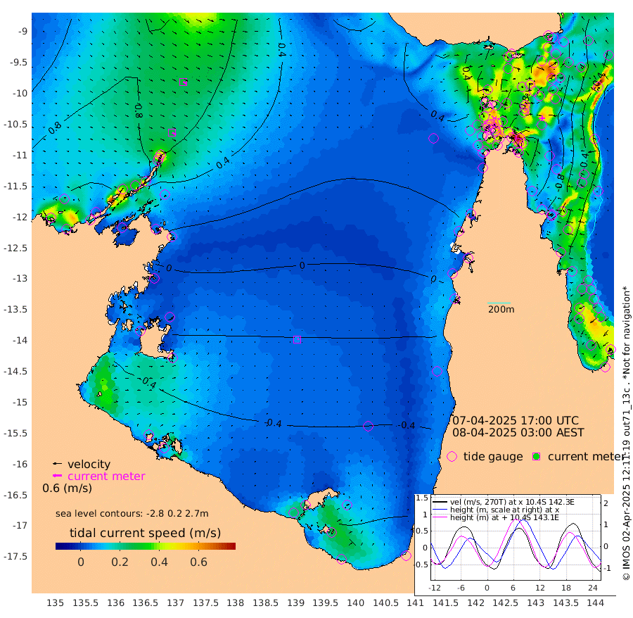 27cm/s 120T +3cm/s rms + 7cm/s -42T. ARA-GOC87 57m 7cm/s 70T +3cm/s rms + 2cm/s -2T. ARA-GOC87 60m 28cm/s 116T +2cm/s rms + 3cm/s 61T. ARA-GOC87 47m -99cm Daru -96cm Bobo Island -37cm Meer Island Barge -62cm Bramble Cay -86cm Unnamed Cay -92cm Pearce Cay -85cm Stephens Island -91cm Merrie England Shoals -100cm Mutacomal Reef -70cm Darnley Island Barge -47cm East Cay -81cm Yorke Island Barge -96cm Rennel Island -91cm Aureed Island -93cm Dungeness Reef -65cm Zagai Island -68cm Yam Island -16cm Dauan Island -8cm Saibai Island -47cm Phipi Reef -71cm Warrior Reef - West -4cm Mabuiag Island Barge -95cm Half Way Island -93cm Coconut Island -100cm Dugong Islet -85cm Poll Island -93cm Kirkcaldie Reef -80cm Suarji Island -73cm Sue Islet 53cm Hawkesbury Island -65cm Alert Patches -67cm Twin Island 41cm Badu Island -63cm St Pauls (Moa Island) 17cm Kubin (Moa Island) -36cm Ince Point -18cm Thursday Island -22cm Nardana Patches 2cm Turtle Head 32cm Round Island 45cm Goods Island 70cm Booby Island 53cm White Rocks Area 73cm Carpentaria -49cm Papou Point 84cm Bampfield Head 55cm Crab Island 57cm Red Wallis Island 21cm Packe Island -115cm Harrington Reef 59cm Herald Camp -25cm Sharp Point -1cm Red Island Point -28cm Possession Island -63cm Alpha Rock -85cm Frederick Point -91cm Wyborn Reef Light -88cm Tetley Island -34cm Triangle Reef -94cm Turtle Head Island -40cm Maclennan Cay -17cm Raine Island -83cm Mcsweeny Reef -72cm Collette Reef -37cm Shadwell Reef -78cm Hannibal Island -66cm Round Point 54cm Vrilya Point -59cm Cape Grenville -50cm Hicks Island -36cm Sir Charles Hardy Island -19cm Harvey Island -41cm Kay Reef -27cm Rocky Island -14cm Chapman Island -14cm Ham Reef -22cm Jubilee Reef -31cm Night Island -20cm Unnamed Reef No. 3 -31cm Morris Island -20cm 1st 3 Mile Opening -27cm Creech Reef -40cm Fife Island -23cm Eden Reef -31cm Stanley Island -40cm Normanby River 113cm Yabooma Island 115cm Hutchison River 105cm Elcho Island 96cm North West Crocodile Island 84cm Cape Wessel 99cm Stevens Island 68cm Guluwuru Island 97cm Hopeful Bay 87cm Auster Point 92cm Two Island Bay 101cm Cadell Strait 101cm Mallison Island 59cm Melville Bay (Gove Harbour) 69cm Truant Island 38cm Cape Arnhem 6cm Cape Grey -10cm Hawk Island -30cm Milner Bay (Groote Eylandt) -50cm Cape Beatrice -84cm West Island -80cm Centre Island -113cm Mornington Island -113cm West Wellesley Islands -111cm Bountiful Island -127cm Albert River Mouth -131cm Sweers Island -133cm Karumba -87cm Nassau River Offshore -51cm Christmas Creek 1cm Archer River 21cm Boyd Point 27cm Weipa (Humbug Point) 22cm Pennefather River 54cm Cullen Point