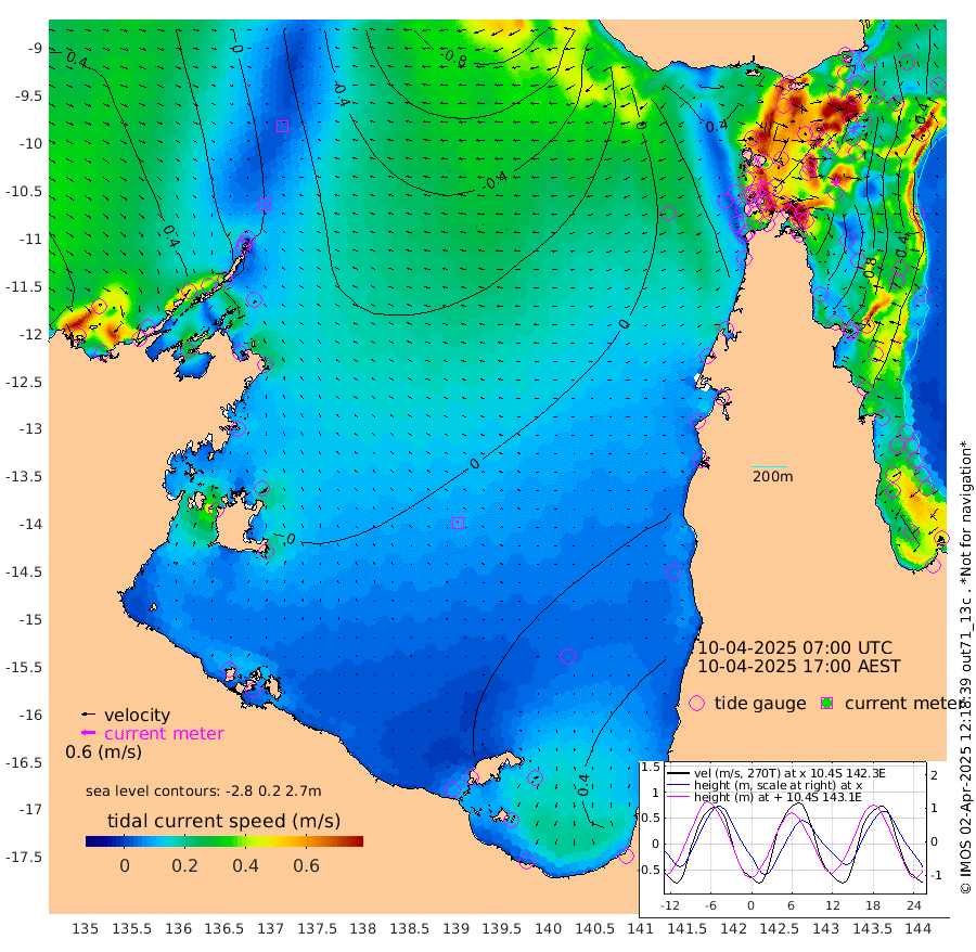 8cm/s -87T +3cm/s rms + 7cm/s -42T. ARA-GOC87 57m 12cm/s -62T +3cm/s rms + 2cm/s -2T. ARA-GOC87 60m 4cm/s -83T +2cm/s rms + 3cm/s 61T. ARA-GOC87 47m -122cm Daru -122cm Bobo Island -41cm Meer Island Barge -65cm Bramble Cay -100cm Unnamed Cay -108cm Pearce Cay -94cm Stephens Island -93cm Merrie England Shoals -121cm Mutacomal Reef -81cm Darnley Island Barge -47cm East Cay -103cm Yorke Island Barge -110cm Rennel Island -116cm Aureed Island -120cm Dungeness Reef -128cm Zagai Island -130cm Yam Island -88cm Dauan Island -88cm Saibai Island -85cm Phipi Reef -127cm Warrior Reef - West -78cm Mabuiag Island Barge -112cm Half Way Island -128cm Coconut Island -125cm Dugong Islet -131cm Poll Island -125cm Kirkcaldie Reef -139cm Suarji Island -121cm Sue Islet -26cm Hawkesbury Island -114cm Alert Patches -126cm Twin Island -32cm Badu Island -131cm St Pauls (Moa Island) -64cm Kubin (Moa Island) -98cm Ince Point -83cm Thursday Island -87cm Nardana Patches -56cm Turtle Head -48cm Round Island -20cm Goods Island 0cm Booby Island -15cm White Rocks Area -13cm Carpentaria -114cm Papou Point -26cm Bampfield Head 12cm Crab Island -12cm Red Wallis Island -49cm Packe Island -142cm Harrington Reef -32cm Herald Camp -38cm Sharp Point -43cm Red Island Point -91cm Possession Island -122cm Alpha Rock -133cm Frederick Point -132cm Wyborn Reef Light -135cm Tetley Island -50cm Triangle Reef -130cm Turtle Head Island -48cm Maclennan Cay -12cm Raine Island -96cm Mcsweeny Reef -77cm Collette Reef -37cm Shadwell Reef -82cm Hannibal Island -67cm Round Point 19cm Vrilya Point -58cm Cape Grenville -52cm Hicks Island -54cm Sir Charles Hardy Island -19cm Harvey Island -37cm Kay Reef -25cm Rocky Island -14cm Chapman Island -15cm Ham Reef -21cm Jubilee Reef -27cm Night Island -16cm Unnamed Reef No. 3 -25cm Morris Island -18cm 1st 3 Mile Opening -23cm Creech Reef -29cm Fife Island -15cm Eden Reef -21cm Stanley Island -30cm Normanby River 25cm Yabooma Island 18cm Hutchison River 28cm Elcho Island 29cm North West Crocodile Island -25cm Cape Wessel 8cm Stevens Island -33cm Guluwuru Island 21cm Hopeful Bay -6cm Auster Point -11cm Two Island Bay 2cm Cadell Strait -31cm Mallison Island -25cm Melville Bay (Gove Harbour) -34cm Truant Island -24cm Cape Arnhem -8cm Cape Grey -1cm Hawk Island 10cm Milner Bay (Groote Eylandt) 17cm Cape Beatrice 16cm West Island 21cm Centre Island 46cm Mornington Island 46cm West Wellesley Islands 59cm Bountiful Island 100cm Albert River Mouth 101cm Sweers Island 97cm Karumba 43cm Nassau River Offshore 30cm Christmas Creek 36cm Archer River 14cm Boyd Point 28cm Weipa (Humbug Point) 28cm Pennefather River 11cm Cullen Point