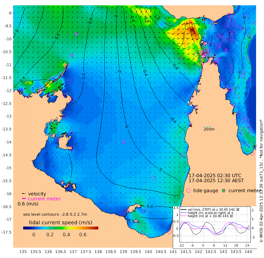 13cm/s 44T +3cm/s rms + 7cm/s -42T. ARA-GOC87 57m 10cm/s -84T +3cm/s rms + 2cm/s -2T. ARA-GOC87 60m 18cm/s 36T +2cm/s rms + 3cm/s 61T. ARA-GOC87 47m 29cm Daru 25cm Bobo Island -11cm Meer Island Barge 3cm Bramble Cay 15cm Unnamed Cay 13cm Pearce Cay 5cm Stephens Island 10cm Merrie England Shoals 25cm Mutacomal Reef 5cm Darnley Island Barge -14cm East Cay 16cm Yorke Island Barge 12cm Rennel Island 16cm Aureed Island 20cm Dungeness Reef 41cm Zagai Island 31cm Yam Island 43cm Dauan Island 43cm Saibai Island 45cm Phipi Reef 48cm Warrior Reef - West 3cm Mabuiag Island Barge 9cm Half Way Island 17cm Coconut Island 13cm Dugong Islet 21cm Poll Island 14cm Kirkcaldie Reef 14cm Suarji Island 24cm Sue Islet -84cm Hawkesbury Island -6cm Alert Patches 0cm Twin Island -53cm Badu Island 9cm St Pauls (Moa Island) -54cm Kubin (Moa Island) -18cm Ince Point -37cm Thursday Island -29cm Nardana Patches -52cm Turtle Head -73cm Round Island -88cm Goods Island -120cm Booby Island -109cm White Rocks Area -132cm Carpentaria 2cm Papou Point -140cm Bampfield Head -105cm Crab Island -112cm Red Wallis Island -78cm Packe Island 9cm Harrington Reef -109cm Herald Camp 11cm Sharp Point -49cm Red Island Point -35cm Possession Island 8cm Alpha Rock 7cm Frederick Point 22cm Wyborn Reef Light 22cm Tetley Island -8cm Triangle Reef 4cm Turtle Head Island -16cm Maclennan Cay -24cm Raine Island 8cm Mcsweeny Reef 5cm Collette Reef -9cm Shadwell Reef 7cm Hannibal Island -5cm Round Point -115cm Vrilya Point -12cm Cape Grenville -12cm Hicks Island -12cm Sir Charles Hardy Island -4cm Harvey Island -18cm Kay Reef -19cm Rocky Island -25cm Chapman Island -25cm Ham Reef -19cm Jubilee Reef -21cm Night Island -27cm Unnamed Reef No. 3 -21cm Morris Island -27cm 1st 3 Mile Opening -25cm Creech Reef -22cm Fife Island -23cm Eden Reef -26cm Stanley Island -22cm Normanby River 58cm Yabooma Island 89cm Hutchison River 72cm Elcho Island 74cm North West Crocodile Island 48cm Cape Wessel 73cm Stevens Island 82cm Guluwuru Island 57cm Hopeful Bay 48cm Auster Point 52cm Two Island Bay 97cm Cadell Strait 114cm Mallison Island 71cm Melville Bay (Gove Harbour) 65cm Truant Island 50cm Cape Arnhem 50cm Cape Grey 48cm Hawk Island 40cm Milner Bay (Groote Eylandt) 43cm Cape Beatrice 31cm West Island 22cm Centre Island 65cm Mornington Island 62cm West Wellesley Islands 96cm Bountiful Island 139cm Albert River Mouth 134cm Sweers Island 120cm Karumba 37cm Nassau River Offshore -2cm Christmas Creek -45cm Archer River -61cm Boyd Point -63cm Weipa (Humbug Point) -77cm Pennefather River -101cm Cullen Point