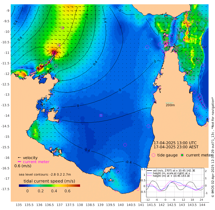 40cm/s 116T +3cm/s rms + 7cm/s -42T. ARA-GOC87 57m 6cm/s 20T +3cm/s rms + 2cm/s -2T. ARA-GOC87 60m 39cm/s 109T +2cm/s rms + 3cm/s 61T. ARA-GOC87 47m 51cm Daru 52cm Bobo Island 39cm Meer Island Barge 46cm Bramble Cay 51cm Unnamed Cay 53cm Pearce Cay 51cm Stephens Island 49cm Merrie England Shoals 46cm Mutacomal Reef 42cm Darnley Island Barge 39cm East Cay 43cm Yorke Island Barge 50cm Rennel Island 41cm Aureed Island 49cm Dungeness Reef 39cm Zagai Island 40cm Yam Island 28cm Dauan Island 10cm Saibai Island 37cm Phipi Reef 33cm Warrior Reef - West 28cm Mabuiag Island Barge 50cm Half Way Island 52cm Coconut Island 45cm Dugong Islet 45cm Poll Island 46cm Kirkcaldie Reef 36cm Suarji Island 32cm Sue Islet 65cm Hawkesbury Island 42cm Alert Patches 43cm Twin Island 65cm Badu Island 43cm St Pauls (Moa Island) 65cm Kubin (Moa Island) 43cm Ince Point 46cm Thursday Island 45cm Nardana Patches 53cm Turtle Head 70cm Round Island 63cm Goods Island 59cm Booby Island 59cm White Rocks Area 28cm Carpentaria 46cm Papou Point 85cm Bampfield Head 54cm Crab Island 51cm Red Wallis Island 59cm Packe Island 51cm Harrington Reef 64cm Herald Camp 0cm Sharp Point 42cm Red Island Point 56cm Possession Island 32cm Alpha Rock 46cm Frederick Point 56cm Wyborn Reef Light 54cm Tetley Island 33cm Triangle Reef 75cm Turtle Head Island 35cm Maclennan Cay 35cm Raine Island 45cm Mcsweeny Reef 40cm Collette Reef 34cm Shadwell Reef 46cm Hannibal Island 49cm Round Point 39cm Vrilya Point 37cm Cape Grenville 44cm Hicks Island 34cm Sir Charles Hardy Island 13cm Harvey Island 32cm Kay Reef 32cm Rocky Island 26cm Chapman Island 24cm Ham Reef 32cm Jubilee Reef 31cm Night Island 24cm Unnamed Reef No. 3 36cm Morris Island 39cm 1st 3 Mile Opening 32cm Creech Reef 29cm Fife Island 39cm Eden Reef 33cm Stanley Island 36cm Normanby River 170cm Yabooma Island 206cm Hutchison River 169cm Elcho Island 156cm North West Crocodile Island 111cm Cape Wessel 158cm Stevens Island 113cm Guluwuru Island 135cm Hopeful Bay 131cm Auster Point 136cm Two Island Bay 175cm Cadell Strait 61cm Mallison Island 102cm Melville Bay (Gove Harbour) 113cm Truant Island 67cm Cape Arnhem 29cm Cape Grey 12cm Hawk Island -25cm Milner Bay (Groote Eylandt) -41cm Cape Beatrice -94cm West Island -89cm Centre Island -91cm Mornington Island -102cm West Wellesley Islands -108cm Bountiful Island -101cm Albert River Mouth -111cm Sweers Island -100cm Karumba -73cm Nassau River Offshore -43cm Christmas Creek -7cm Archer River 6cm Boyd Point 10cm Weipa (Humbug Point) 23cm Pennefather River 26cm Cullen Point