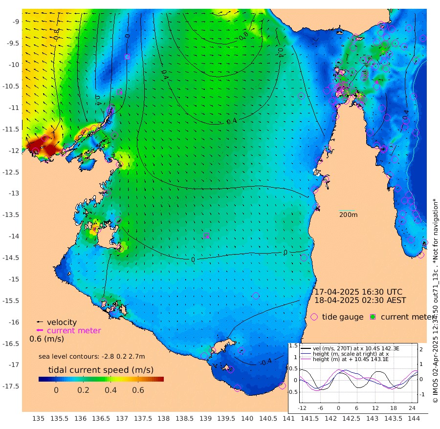 22cm/s 109T +3cm/s rms + 7cm/s -42T. ARA-GOC87 57m 23cm/s 153T +3cm/s rms + 2cm/s -2T. ARA-GOC87 60m 13cm/s 100T +2cm/s rms + 3cm/s 61T. ARA-GOC87 47m 64cm Daru 59cm Bobo Island 37cm Meer Island Barge 43cm Bramble Cay 57cm Unnamed Cay 49cm Pearce Cay 46cm Stephens Island 53cm Merrie England Shoals 64cm Mutacomal Reef 54cm Darnley Island Barge 34cm East Cay 61cm Yorke Island Barge 49cm Rennel Island 57cm Aureed Island 57cm Dungeness Reef 77cm Zagai Island 67cm Yam Island 84cm Dauan Island 91cm Saibai Island 78cm Phipi Reef 79cm Warrior Reef - West 62cm Mabuiag Island Barge 47cm Half Way Island 63cm Coconut Island 52cm Dugong Islet 60cm Poll Island 56cm Kirkcaldie Reef 62cm Suarji Island 72cm Sue Islet 38cm Hawkesbury Island 62cm Alert Patches 61cm Twin Island 46cm Badu Island 65cm St Pauls (Moa Island) 43cm Kubin (Moa Island) 54cm Ince Point 50cm Thursday Island 51cm Nardana Patches 43cm Turtle Head 46cm Round Island 31cm Goods Island 26cm Booby Island 15cm White Rocks Area 35cm Carpentaria 52cm Papou Point 51cm Bampfield Head 20cm Crab Island 24cm Red Wallis Island 41cm Packe Island 52cm Harrington Reef 46cm Herald Camp 21cm Sharp Point 30cm Red Island Point 53cm Possession Island 64cm Alpha Rock 61cm Frederick Point 68cm Wyborn Reef Light 70cm Tetley Island 43cm Triangle Reef 58cm Turtle Head Island 33cm Maclennan Cay 26cm Raine Island 52cm Mcsweeny Reef 53cm Collette Reef 43cm Shadwell Reef 55cm Hannibal Island 43cm Round Point 22cm Vrilya Point 40cm Cape Grenville 35cm Hicks Island 47cm Sir Charles Hardy Island 11cm Harvey Island 37cm Kay Reef 31cm Rocky Island 34cm Chapman Island 32cm Ham Reef 32cm Jubilee Reef 28cm Night Island 30cm Unnamed Reef No. 3 28cm Morris Island 29cm 1st 3 Mile Opening 30cm Creech Reef 26cm Fife Island 31cm Eden Reef 31cm Stanley Island 23cm Normanby River -75cm Yabooma Island -75cm Hutchison River -77cm Elcho Island -85cm North West Crocodile Island -5cm Cape Wessel -40cm Stevens Island 39cm Guluwuru Island -37cm Hopeful Bay -22cm Auster Point -25cm Two Island Bay -26cm Cadell Strait 219cm Mallison Island 21cm Melville Bay (Gove Harbour) 29cm Truant Island 25cm Cape Arnhem -1cm Cape Grey -5cm Hawk Island -35cm Milner Bay (Groote Eylandt) -45cm Cape Beatrice -62cm West Island -56cm Centre Island -51cm Mornington Island -53cm West Wellesley Islands -72cm Bountiful Island -114cm Albert River Mouth -113cm Sweers Island -106cm Karumba -26cm Nassau River Offshore 8cm Christmas Creek 19cm Archer River 30cm Boyd Point 22cm Weipa (Humbug Point) 23cm Pennefather River 29cm Cullen Point