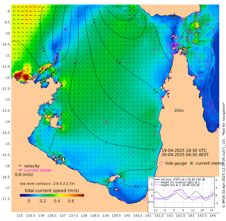 8cm/s 136T +3cm/s rms + 7cm/s -42T. ARA-GOC87 57m 32cm/s 160T +3cm/s rms + 2cm/s -2T. ARA-GOC87 60m 7cm/s -131T +2cm/s rms + 3cm/s 61T. ARA-GOC87 47m 66cm Daru 57cm Bobo Island 60cm Meer Island Barge 67cm Bramble Cay 75cm Unnamed Cay 57cm Pearce Cay 66cm Stephens Island 79cm Merrie England Shoals 75cm Mutacomal Reef 71cm Darnley Island Barge 60cm East Cay 68cm Yorke Island Barge 62cm Rennel Island 58cm Aureed Island 56cm Dungeness Reef 46cm Zagai Island 49cm Yam Island 46cm Dauan Island 51cm Saibai Island 36cm Phipi Reef 51cm Warrior Reef - West 40cm Mabuiag Island Barge 63cm Half Way Island 57cm Coconut Island 64cm Dugong Islet 51cm Poll Island 56cm Kirkcaldie Reef 39cm Suarji Island 61cm Sue Islet 54cm Hawkesbury Island 52cm Alert Patches 50cm Twin Island 43cm Badu Island 46cm St Pauls (Moa Island) 48cm Kubin (Moa Island) 47cm Ince Point 48cm Thursday Island 47cm Nardana Patches 49cm Turtle Head 48cm Round Island 49cm Goods Island 52cm Booby Island 43cm White Rocks Area 63cm Carpentaria 34cm Papou Point 66cm Bampfield Head 41cm Crab Island 53cm Red Wallis Island 58cm Packe Island 59cm Harrington Reef 65cm Herald Camp 13cm Sharp Point 32cm Red Island Point 41cm Possession Island 59cm Alpha Rock 55cm Frederick Point 71cm Wyborn Reef Light 68cm Tetley Island 58cm Triangle Reef 63cm Turtle Head Island 58cm Maclennan Cay 52cm Raine Island 69cm Mcsweeny Reef 71cm Collette Reef 66cm Shadwell Reef 76cm Hannibal Island 69cm Round Point 50cm Vrilya Point 70cm Cape Grenville 60cm Hicks Island 76cm Sir Charles Hardy Island 20cm Harvey Island 71cm Kay Reef 59cm Rocky Island 62cm Chapman Island 60cm Ham Reef 60cm Jubilee Reef 55cm Night Island 61cm Unnamed Reef No. 3 59cm Morris Island 58cm 1st 3 Mile Opening 60cm Creech Reef 59cm Fife Island 67cm Eden Reef 67cm Stanley Island 62cm Normanby River -104cm Yabooma Island -125cm Hutchison River -116cm Elcho Island -121cm North West Crocodile Island -39cm Cape Wessel -78cm Stevens Island -6cm Guluwuru Island -69cm Hopeful Bay -58cm Auster Point -58cm Two Island Bay -76cm Cadell Strait 192cm Mallison Island -18cm Melville Bay (Gove Harbour) -13cm Truant Island -6cm Cape Arnhem -26cm Cape Grey -28cm Hawk Island -49cm Milner Bay (Groote Eylandt) -49cm Cape Beatrice -52cm West Island -53cm Centre Island -49cm Mornington Island -42cm West Wellesley Islands -69cm Bountiful Island -124cm Albert River Mouth -132cm Sweers Island -115cm Karumba -6cm Nassau River Offshore 33cm Christmas Creek 44cm Archer River 53cm Boyd Point 49cm Weipa (Humbug Point) 45cm Pennefather River 54cm Cullen Point