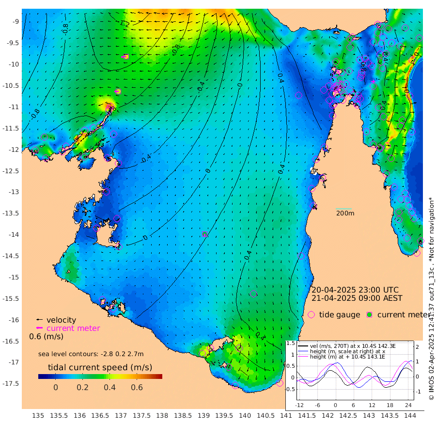 43cm/s -92T +3cm/s rms + 7cm/s -42T. ARA-GOC87 57m 26cm/s -174T +3cm/s rms + 2cm/s -2T. ARA-GOC87 60m 49cm/s -98T +2cm/s rms + 3cm/s 61T. ARA-GOC87 47m 61cm Daru 48cm Bobo Island 7cm Meer Island Barge 25cm Bramble Cay 44cm Unnamed Cay 49cm Pearce Cay 37cm Stephens Island 45cm Merrie England Shoals 67cm Mutacomal Reef 24cm Darnley Island Barge 18cm East Cay 38cm Yorke Island Barge 57cm Rennel Island 52cm Aureed Island 70cm Dungeness Reef 68cm Zagai Island 82cm Yam Island 87cm Dauan Island 74cm Saibai Island 100cm Phipi Reef 87cm Warrior Reef - West 84cm Mabuiag Island Barge 53cm Half Way Island 69cm Coconut Island 65cm Dugong Islet 80cm Poll Island 79cm Kirkcaldie Reef 103cm Suarji Island 67cm Sue Islet 108cm Hawkesbury Island 104cm Alert Patches 98cm Twin Island 99cm Badu Island 100cm St Pauls (Moa Island) 103cm Kubin (Moa Island) 102cm Ince Point 103cm Thursday Island 103cm Nardana Patches 108cm Turtle Head 102cm Round Island 104cm Goods Island 100cm Booby Island 104cm White Rocks Area 69cm Carpentaria 80cm Papou Point 96cm Bampfield Head 81cm Crab Island 108cm Red Wallis Island 121cm Packe Island 75cm Harrington Reef 115cm Herald Camp 30cm Sharp Point 93cm Red Island Point 93cm Possession Island 85cm Alpha Rock 88cm Frederick Point 65cm Wyborn Reef Light 71cm Tetley Island 26cm Triangle Reef 55cm Turtle Head Island 21cm Maclennan Cay 5cm Raine Island 44cm Mcsweeny Reef 36cm Collette Reef 16cm Shadwell Reef 34cm Hannibal Island 33cm Round Point 70cm Vrilya Point 30cm Cape Grenville 20cm Hicks Island 23cm Sir Charles Hardy Island 8cm Harvey Island 18cm Kay Reef 11cm Rocky Island 11cm Chapman Island 6cm Ham Reef 5cm Jubilee Reef 15cm Night Island 12cm Unnamed Reef No. 3 11cm Morris Island 3cm 1st 3 Mile Opening 9cm Creech Reef 16cm Fife Island -1cm Eden Reef 8cm Stanley Island 8cm Normanby River -107cm Yabooma Island -127cm Hutchison River -112cm Elcho Island -101cm North West Crocodile Island -107cm Cape Wessel -118cm Stevens Island -127cm Guluwuru Island -102cm Hopeful Bay -108cm Auster Point -114cm Two Island Bay -144cm Cadell Strait -175cm Mallison Island -101cm Melville Bay (Gove Harbour) -110cm Truant Island -74cm Cape Arnhem -58cm Cape Grey -32cm Hawk Island -31cm Milner Bay (Groote Eylandt) -10cm Cape Beatrice 19cm West Island 16cm Centre Island 44cm Mornington Island 40cm West Wellesley Islands 48cm Bountiful Island 21cm Albert River Mouth 13cm Sweers Island 45cm Karumba 76cm Nassau River Offshore 83cm Christmas Creek 69cm Archer River 65cm Boyd Point 74cm Weipa (Humbug Point) 54cm Pennefather River 77cm Cullen Point