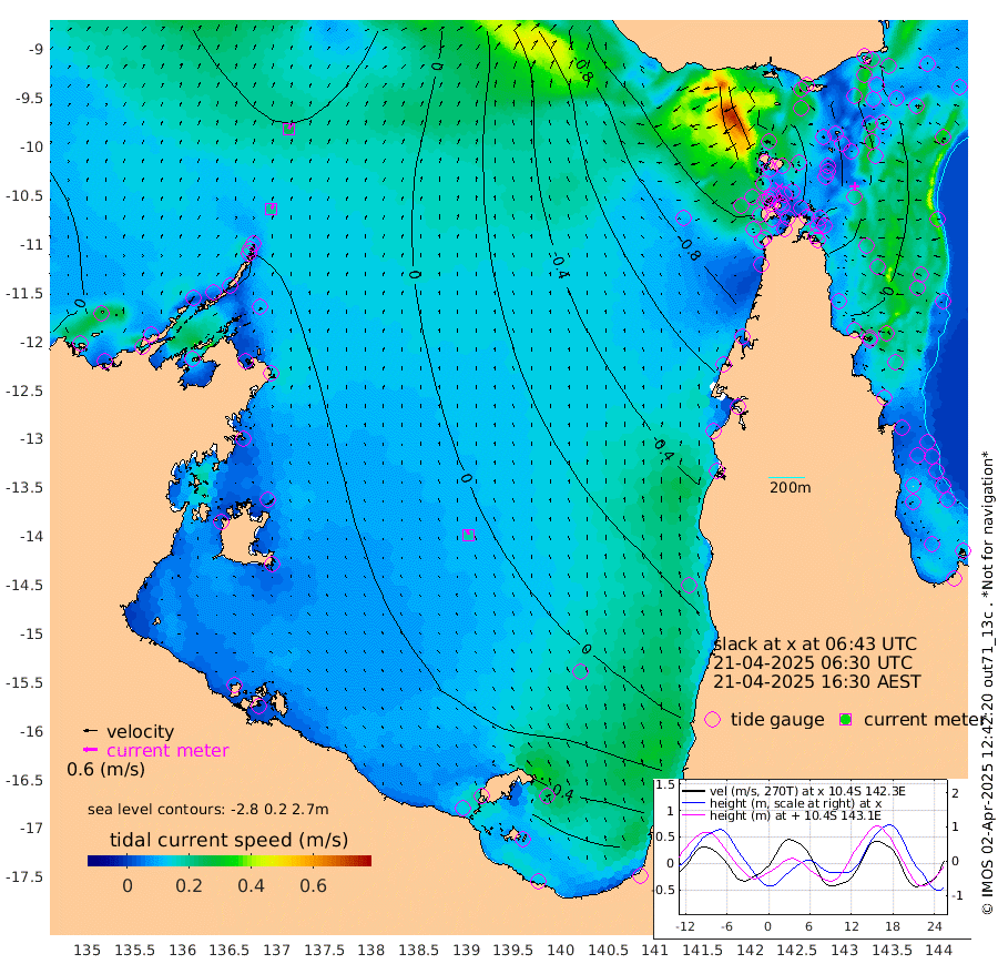 19cm/s 28T +3cm/s rms + 7cm/s -42T. ARA-GOC87 57m 19cm/s -21T +3cm/s rms + 2cm/s -2T. ARA-GOC87 60m 26cm/s 32T +2cm/s rms + 3cm/s 61T. ARA-GOC87 47m -38cm Daru -33cm Bobo Island 0cm Meer Island Barge -5cm Bramble Cay -20cm Unnamed Cay -33cm Pearce Cay -19cm Stephens Island -13cm Merrie England Shoals -38cm Mutacomal Reef -8cm Darnley Island Barge -4cm East Cay -21cm Yorke Island Barge -37cm Rennel Island -36cm Aureed Island -56cm Dungeness Reef -74cm Zagai Island -87cm Yam Island -105cm Dauan Island -89cm Saibai Island -94cm Phipi Reef -83cm Warrior Reef - West -110cm Mabuiag Island Barge -37cm Half Way Island -58cm Coconut Island -48cm Dugong Islet -75cm Poll Island -71cm Kirkcaldie Reef -102cm Suarji Island -60cm Sue Islet -165cm Hawkesbury Island -105cm Alert Patches -106cm Twin Island -158cm Badu Island -113cm St Pauls (Moa Island) -152cm Kubin (Moa Island) -122cm Ince Point -134cm Thursday Island -131cm Nardana Patches -144cm Turtle Head -147cm Round Island -163cm Goods Island -173cm Booby Island -172cm White Rocks Area -145cm Carpentaria -101cm Papou Point -175cm Bampfield Head -142cm Crab Island -174cm Red Wallis Island -167cm Packe Island -57cm Harrington Reef -169cm Herald Camp -25cm Sharp Point -125cm Red Island Point -113cm Possession Island -83cm Alpha Rock -85cm Frederick Point -48cm Wyborn Reef Light -57cm Tetley Island -19cm Triangle Reef -50cm Turtle Head Island -15cm Maclennan Cay -3cm Raine Island -22cm Mcsweeny Reef -11cm Collette Reef -1cm Shadwell Reef -7cm Hannibal Island -11cm Round Point -127cm Vrilya Point -7cm Cape Grenville -8cm Hicks Island -14cm Sir Charles Hardy Island -2cm Harvey Island 2cm Kay Reef 0cm Rocky Island -2cm Chapman Island 0cm Ham Reef 1cm Jubilee Reef -5cm Night Island -3cm Unnamed Reef No. 3 0cm Morris Island -3cm 1st 3 Mile Opening -2cm Creech Reef 1cm Fife Island 9cm Eden Reef 6cm Stanley Island 7cm Normanby River -5cm Yabooma Island -3cm Hutchison River 4cm Elcho Island 1cm North West Crocodile Island 13cm Cape Wessel 18cm Stevens Island 40cm Guluwuru Island 22cm Hopeful Bay 16cm Auster Point 14cm Two Island Bay 26cm Cadell Strait 138cm Mallison Island 32cm Melville Bay (Gove Harbour) 28cm Truant Island 27cm Cape Arnhem 45cm Cape Grey 47cm Hawk Island 62cm Milner Bay (Groote Eylandt) 59cm Cape Beatrice 66cm West Island 66cm Centre Island 80cm Mornington Island 83cm West Wellesley Islands 93cm Bountiful Island 129cm Albert River Mouth 159cm Sweers Island 116cm Karumba 26cm Nassau River Offshore -19cm Christmas Creek -52cm Archer River -76cm Boyd Point -83cm Weipa (Humbug Point) -74cm Pennefather River -120cm Cullen Point