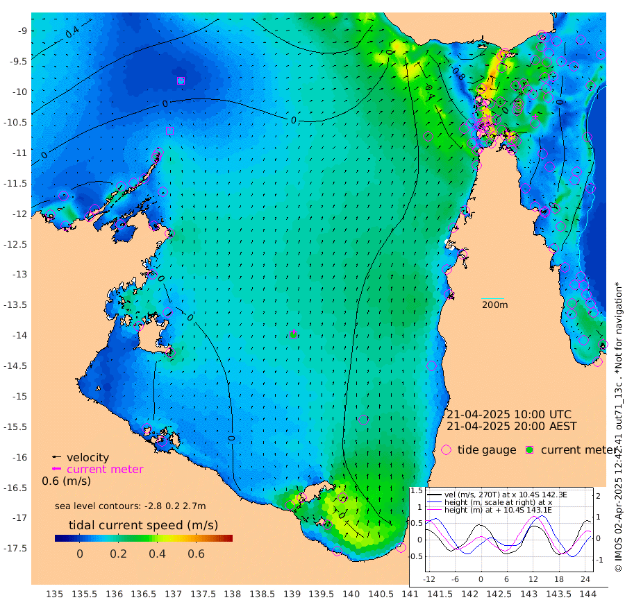 12cm/s 7T +3cm/s rms + 7cm/s -42T. ARA-GOC87 57m 33cm/s 8T +3cm/s rms + 2cm/s -2T. ARA-GOC87 60m 11cm/s 44T +2cm/s rms + 3cm/s 61T. ARA-GOC87 47m 3cm Daru 10cm Bobo Island -16cm Meer Island Barge -1cm Bramble Cay 6cm Unnamed Cay 0cm Pearce Cay 1cm Stephens Island 16cm Merrie England Shoals 15cm Mutacomal Reef -6cm Darnley Island Barge -7cm East Cay -3cm Yorke Island Barge 6cm Rennel Island 0cm Aureed Island -12cm Dungeness Reef -18cm Zagai Island -20cm Yam Island -80cm Dauan Island -56cm Saibai Island -71cm Phipi Reef -37cm Warrior Reef - West -37cm Mabuiag Island Barge 3cm Half Way Island 10cm Coconut Island -1cm Dugong Islet -6cm Poll Island -3cm Kirkcaldie Reef -11cm Suarji Island -4cm Sue Islet -71cm Hawkesbury Island -14cm Alert Patches -10cm Twin Island -68cm Badu Island -20cm St Pauls (Moa Island) -63cm Kubin (Moa Island) -29cm Ince Point -37cm Thursday Island -36cm Nardana Patches -58cm Turtle Head -54cm Round Island -74cm Goods Island -73cm Booby Island -57cm White Rocks Area -34cm Carpentaria -10cm Papou Point -56cm Bampfield Head -56cm Crab Island -65cm Red Wallis Island -68cm Packe Island 18cm Harrington Reef -82cm Herald Camp 0cm Sharp Point -34cm Red Island Point -22cm Possession Island 3cm Alpha Rock 2cm Frederick Point 17cm Wyborn Reef Light 14cm Tetley Island -15cm Triangle Reef 11cm Turtle Head Island -16cm Maclennan Cay -19cm Raine Island 5cm Mcsweeny Reef 4cm Collette Reef -13cm Shadwell Reef 5cm Hannibal Island 2cm Round Point -45cm Vrilya Point 0cm Cape Grenville -9cm Hicks Island -22cm Sir Charles Hardy Island -2cm Harvey Island -1cm Kay Reef -16cm Rocky Island -17cm Chapman Island -16cm Ham Reef -17cm Jubilee Reef -16cm Night Island -13cm Unnamed Reef No. 3 -14cm Morris Island -24cm 1st 3 Mile Opening -19cm Creech Reef -10cm Fife Island -24cm Eden Reef -13cm Stanley Island -8cm Normanby River -20cm Yabooma Island -28cm Hutchison River -15cm Elcho Island -14cm North West Crocodile Island 9cm Cape Wessel 1cm Stevens Island -15cm Guluwuru Island -3cm Hopeful Bay 2cm Auster Point -11cm Two Island Bay -33cm Cadell Strait -10cm Mallison Island -11cm Melville Bay (Gove Harbour) -9cm Truant Island -6cm Cape Arnhem 14cm Cape Grey 13cm Hawk Island 42cm Milner Bay (Groote Eylandt) 35cm Cape Beatrice 54cm West Island 56cm Centre Island 6cm Mornington Island 10cm West Wellesley Islands -10cm Bountiful Island -2cm Albert River Mouth 22cm Sweers Island -6cm Karumba -40cm Nassau River Offshore -61cm Christmas Creek -57cm Archer River -58cm Boyd Point -73cm Weipa (Humbug Point) -37cm Pennefather River -58cm Cullen Point
