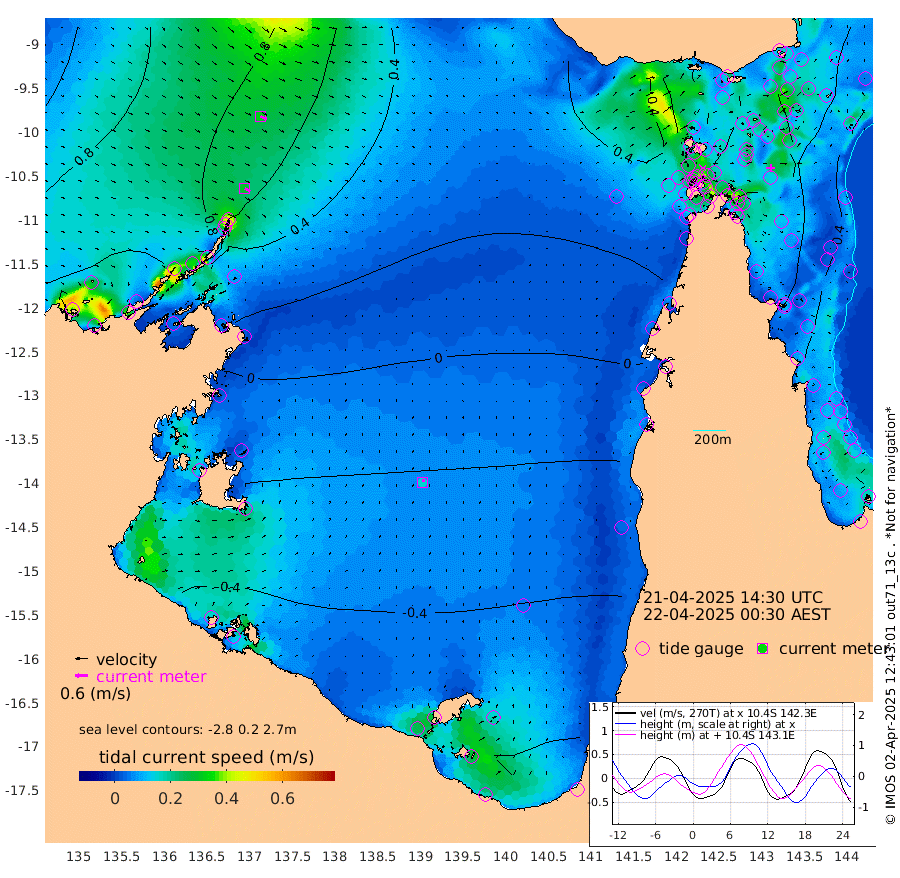 29cm/s 120T +3cm/s rms + 7cm/s -42T. ARA-GOC87 57m 15cm/s 22T +3cm/s rms + 2cm/s -2T. ARA-GOC87 60m 33cm/s 116T +2cm/s rms + 3cm/s 61T. ARA-GOC87 47m -57cm Daru -48cm Bobo Island -37cm Meer Island Barge -56cm Bramble Cay -65cm Unnamed Cay -48cm Pearce Cay -55cm Stephens Island -76cm Merrie England Shoals -69cm Mutacomal Reef -52cm Darnley Island Barge -44cm East Cay -51cm Yorke Island Barge -55cm Rennel Island -45cm Aureed Island -40cm Dungeness Reef -9cm Zagai Island -12cm Yam Island 18cm Dauan Island 15cm Saibai Island -3cm Phipi Reef -17cm Warrior Reef - West 26cm Mabuiag Island Barge -51cm Half Way Island -39cm Coconut Island -50cm Dugong Islet -27cm Poll Island -35cm Kirkcaldie Reef -9cm Suarji Island -31cm Sue Islet 57cm Hawkesbury Island -12cm Alert Patches -7cm Twin Island 61cm Badu Island 1cm St Pauls (Moa Island) 45cm Kubin (Moa Island) 12cm Ince Point 24cm Thursday Island 21cm Nardana Patches 33cm Turtle Head 45cm Round Island 60cm Goods Island 76cm Booby Island 70cm White Rocks Area 74cm Carpentaria 12cm Papou Point 80cm Bampfield Head 63cm Crab Island 67cm Red Wallis Island 41cm Packe Island -51cm Harrington Reef 56cm Herald Camp -8cm Sharp Point 32cm Red Island Point 14cm Possession Island -22cm Alpha Rock -27cm Frederick Point -54cm Wyborn Reef Light -47cm Tetley Island -31cm Triangle Reef -42cm Turtle Head Island -33cm Maclennan Cay -26cm Raine Island -58cm Mcsweeny Reef -60cm Collette Reef -44cm Shadwell Reef -67cm Hannibal Island -59cm Round Point 54cm Vrilya Point -58cm Cape Grenville -43cm Hicks Island -40cm Sir Charles Hardy Island -16cm Harvey Island -54cm Kay Reef -38cm Rocky Island -34cm Chapman Island -32cm Ham Reef -33cm Jubilee Reef -36cm Night Island -35cm Unnamed Reef No. 3 -39cm Morris Island -26cm 1st 3 Mile Opening -34cm Creech Reef -46cm Fife Island -40cm Eden Reef -46cm Stanley Island -48cm Normanby River 119cm Yabooma Island 137cm Hutchison River 118cm Elcho Island 112cm North West Crocodile Island 86cm Cape Wessel 96cm Stevens Island 65cm Guluwuru Island 80cm Hopeful Bay 89cm Auster Point 94cm Two Island Bay 110cm Cadell Strait -51cm Mallison Island 55cm Melville Bay (Gove Harbour) 66cm Truant Island 36cm Cape Arnhem 12cm Cape Grey -11cm Hawk Island -20cm Milner Bay (Groote Eylandt) -37cm Cape Beatrice -66cm West Island -62cm Centre Island -103cm Mornington Island -105cm West Wellesley Islands -110cm Bountiful Island -110cm Albert River Mouth -126cm Sweers Island -120cm Karumba -90cm Nassau River Offshore -61cm Christmas Creek -18cm Archer River 8cm Boyd Point 10cm Weipa (Humbug Point) 15cm Pennefather River 43cm Cullen Point