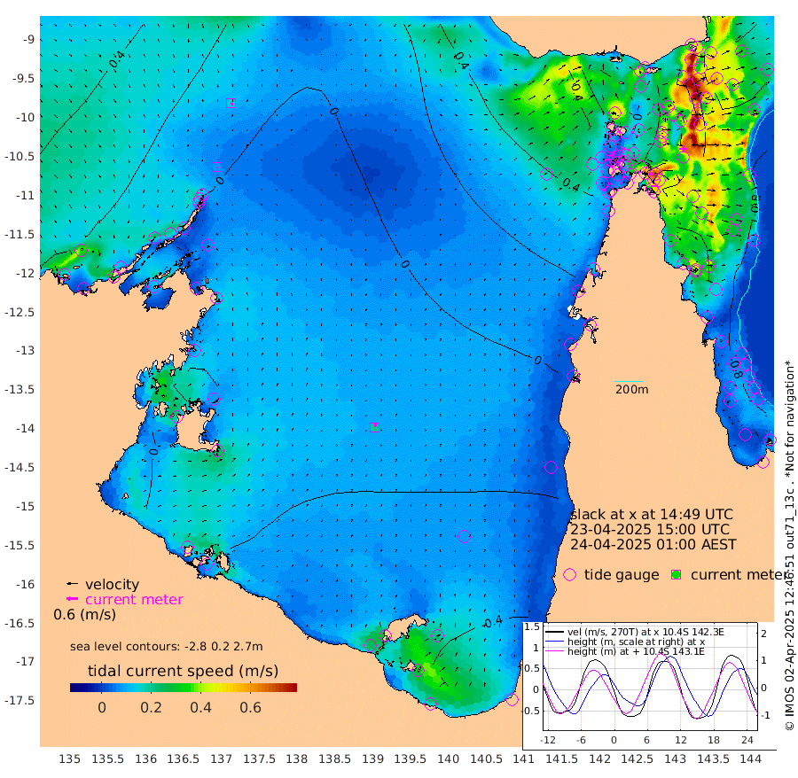 8cm/s 131T +3cm/s rms + 7cm/s -42T. ARA-GOC87 57m 20cm/s 18T +3cm/s rms + 2cm/s -2T. ARA-GOC87 60m 14cm/s 127T +2cm/s rms + 3cm/s 61T. ARA-GOC87 47m -90cm Daru -85cm Bobo Island -81cm Meer Island Barge -102cm Bramble Cay -105cm Unnamed Cay -94cm Pearce Cay -103cm Stephens Island -118cm Merrie England Shoals -99cm Mutacomal Reef -95cm Darnley Island Barge -89cm East Cay -86cm Yorke Island Barge -93cm Rennel Island -78cm Aureed Island -69cm Dungeness Reef -12cm Zagai Island -18cm Yam Island 30cm Dauan Island 40cm Saibai Island 6cm Phipi Reef -20cm Warrior Reef - West 43cm Mabuiag Island Barge -92cm Half Way Island -64cm Coconut Island -84cm Dugong Islet -44cm Poll Island -56cm Kirkcaldie Reef -4cm Suarji Island -37cm Sue Islet 48cm Hawkesbury Island -12cm Alert Patches -12cm Twin Island 56cm Badu Island 2cm St Pauls (Moa Island) 33cm Kubin (Moa Island) 11cm Ince Point 23cm Thursday Island 21cm Nardana Patches 25cm Turtle Head 43cm Round Island 45cm Goods Island 65cm Booby Island 59cm White Rocks Area 79cm Carpentaria 8cm Papou Point 77cm Bampfield Head 53cm Crab Island 58cm Red Wallis Island 28cm Packe Island -83cm Harrington Reef 52cm Herald Camp 1cm Sharp Point 30cm Red Island Point 14cm Possession Island -22cm Alpha Rock -42cm Frederick Point -82cm Wyborn Reef Light -71cm Tetley Island -63cm Triangle Reef -85cm Turtle Head Island -73cm Maclennan Cay -67cm Raine Island -96cm Mcsweeny Reef -96cm Collette Reef -80cm Shadwell Reef -109cm Hannibal Island -107cm Round Point 47cm Vrilya Point -98cm Cape Grenville -88cm Hicks Island -82cm Sir Charles Hardy Island -30cm Harvey Island -95cm Kay Reef -77cm Rocky Island -70cm Chapman Island -67cm Ham Reef -74cm Jubilee Reef -74cm Night Island -71cm Unnamed Reef No. 3 -83cm Morris Island -70cm 1st 3 Mile Opening -76cm Creech Reef -91cm Fife Island -93cm Eden Reef -90cm Stanley Island -99cm Normanby River 26cm Yabooma Island 22cm Hutchison River 25cm Elcho Island 25cm North West Crocodile Island 24cm Cape Wessel 11cm Stevens Island -6cm Guluwuru Island 9cm Hopeful Bay 20cm Auster Point 16cm Two Island Bay 0cm Cadell Strait -106cm Mallison Island -5cm Melville Bay (Gove Harbour) 2cm Truant Island -2cm Cape Arnhem -4cm Cape Grey -15cm Hawk Island -1cm Milner Bay (Groote Eylandt) -18cm Cape Beatrice -17cm West Island -10cm Centre Island -65cm Mornington Island -65cm West Wellesley Islands -63cm Bountiful Island -73cm Albert River Mouth -73cm Sweers Island -78cm Karumba -70cm Nassau River Offshore -53cm Christmas Creek -18cm Archer River 6cm Boyd Point 5cm Weipa (Humbug Point) 8cm Pennefather River 42cm Cullen Point