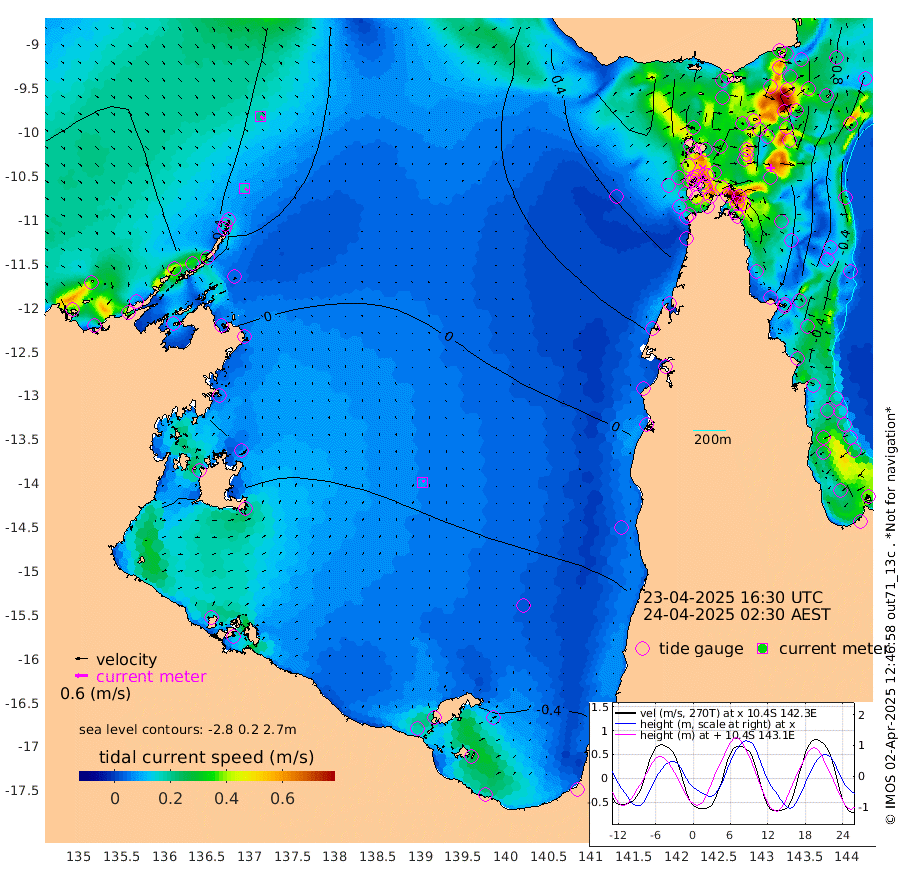 17cm/s 126T +3cm/s rms + 7cm/s -42T. ARA-GOC87 57m 9cm/s 35T +3cm/s rms + 2cm/s -2T. ARA-GOC87 60m 21cm/s 123T +2cm/s rms + 3cm/s 61T. ARA-GOC87 47m -111cm Daru -102cm Bobo Island -47cm Meer Island Barge -81cm Bramble Cay -105cm Unnamed Cay -96cm Pearce Cay -94cm Stephens Island -116cm Merrie England Shoals -121cm Mutacomal Reef -80cm Darnley Island Barge -57cm East Cay -89cm Yorke Island Barge -103cm Rennel Island -91cm Aureed Island -92cm Dungeness Reef -62cm Zagai Island -64cm Yam Island -12cm Dauan Island -8cm Saibai Island -44cm Phipi Reef -68cm Warrior Reef - West -2cm Mabuiag Island Barge -99cm Half Way Island -99cm Coconut Island -100cm Dugong Islet -84cm Poll Island -91cm Kirkcaldie Reef -66cm Suarji Island -76cm Sue Islet 46cm Hawkesbury Island -62cm Alert Patches -62cm Twin Island 40cm Badu Island -55cm St Pauls (Moa Island) 17cm Kubin (Moa Island) -31cm Ince Point -12cm Thursday Island -16cm Nardana Patches 6cm Turtle Head 23cm Round Island 48cm Goods Island 75cm Booby Island 61cm White Rocks Area 81cm Carpentaria -40cm Papou Point 74cm Bampfield Head 58cm Crab Island 61cm Red Wallis Island 19cm Packe Island -114cm Harrington Reef 54cm Herald Camp -23cm Sharp Point 8cm Red Island Point -26cm Possession Island -70cm Alpha Rock -85cm Frederick Point -111cm Wyborn Reef Light -106cm Tetley Island -45cm Triangle Reef -104cm Turtle Head Island -45cm Maclennan Cay -27cm Raine Island -96cm Mcsweeny Reef -89cm Collette Reef -54cm Shadwell Reef -99cm Hannibal Island -86cm Round Point 55cm Vrilya Point -76cm Cape Grenville -60cm Hicks Island -47cm Sir Charles Hardy Island -22cm Harvey Island -61cm Kay Reef -39cm Rocky Island -28cm Chapman Island -26cm Ham Reef -34cm Jubilee Reef -41cm Night Island -31cm Unnamed Reef No. 3 -43cm Morris Island -27cm 1st 3 Mile Opening -35cm Creech Reef -51cm Fife Island -37cm Eden Reef -45cm Stanley Island -51cm Normanby River 83cm Yabooma Island 79cm Hutchison River 73cm Elcho Island 69cm North West Crocodile Island 56cm Cape Wessel 53cm Stevens Island 33cm Guluwuru Island 52cm Hopeful Bay 56cm Auster Point 61cm Two Island Bay 63cm Cadell Strait -38cm Mallison Island 27cm Melville Bay (Gove Harbour) 34cm Truant Island 16cm Cape Arnhem 0cm Cape Grey -20cm Hawk Island -21cm Milner Bay (Groote Eylandt) -36cm Cape Beatrice -52cm West Island -49cm Centre Island -87cm Mornington Island -83cm West Wellesley Islands -76cm Bountiful Island -93cm Albert River Mouth -102cm Sweers Island -102cm Karumba -69cm Nassau River Offshore -41cm Christmas Creek 1cm Archer River 22cm Boyd Point 29cm Weipa (Humbug Point) 16cm Pennefather River 53cm Cullen Point