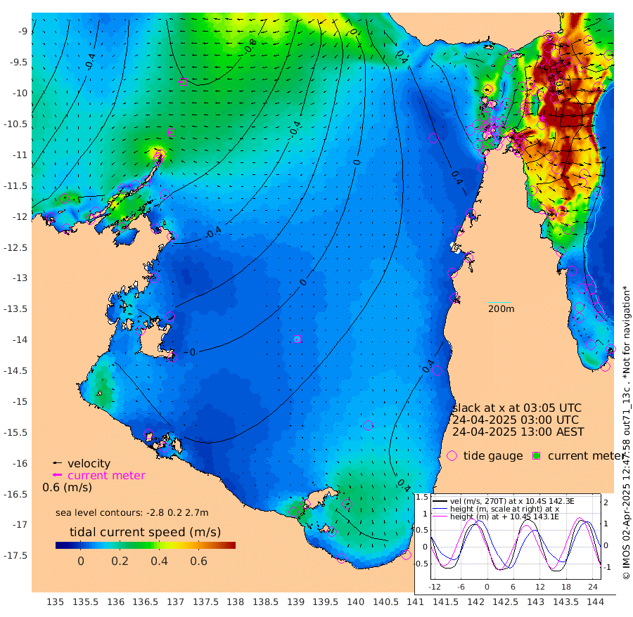 29cm/s -91T +3cm/s rms + 7cm/s -42T. ARA-GOC87 57m 13cm/s -148T +3cm/s rms + 2cm/s -2T. ARA-GOC87 60m 32cm/s -96T +2cm/s rms + 3cm/s 61T. ARA-GOC87 47m -79cm Daru -90cm Bobo Island -98cm Meer Island Barge -112cm Bramble Cay -109cm Unnamed Cay -95cm Pearce Cay -110cm Stephens Island -117cm Merrie England Shoals -88cm Mutacomal Reef -106cm Darnley Island Barge -108cm East Cay -91cm Yorke Island Barge -89cm Rennel Island -78cm Aureed Island -54cm Dungeness Reef 0cm Zagai Island -1cm Yam Island 80cm Dauan Island 65cm Saibai Island 64cm Phipi Reef 18cm Warrior Reef - West 54cm Mabuiag Island Barge -88cm Half Way Island -62cm Coconut Island -76cm Dugong Islet -28cm Poll Island -42cm Kirkcaldie Reef 9cm Suarji Island -31cm Sue Islet 45cm Hawkesbury Island 7cm Alert Patches 2cm Twin Island 59cm Badu Island 21cm St Pauls (Moa Island) 41cm Kubin (Moa Island) 28cm Ince Point 35cm Thursday Island 36cm Nardana Patches 43cm Turtle Head 35cm Round Island 48cm Goods Island 56cm Booby Island 46cm White Rocks Area 42cm Carpentaria 7cm Papou Point 23cm Bampfield Head 52cm Crab Island 61cm Red Wallis Island 51cm Packe Island -81cm Harrington Reef 46cm Herald Camp 15cm Sharp Point 30cm Red Island Point 11cm Possession Island -12cm Alpha Rock -32cm Frederick Point -82cm Wyborn Reef Light -68cm Tetley Island -70cm Triangle Reef -100cm Turtle Head Island -89cm Maclennan Cay -85cm Raine Island -98cm Mcsweeny Reef -99cm Collette Reef -89cm Shadwell Reef -114cm Hannibal Island -115cm Round Point 49cm Vrilya Point -108cm Cape Grenville -105cm Hicks Island -102cm Sir Charles Hardy Island -33cm Harvey Island -113cm Kay Reef -95cm Rocky Island -89cm Chapman Island -89cm Ham Reef -94cm Jubilee Reef -81cm Night Island -88cm Unnamed Reef No. 3 -101cm Morris Island -92cm 1st 3 Mile Opening -94cm Creech Reef -97cm Fife Island -115cm Eden Reef -107cm Stanley Island -122cm Normanby River -100cm Yabooma Island -111cm Hutchison River -88cm Elcho Island -78cm North West Crocodile Island -98cm Cape Wessel -105cm Stevens Island -110cm Guluwuru Island -94cm Hopeful Bay -99cm Auster Point -97cm Two Island Bay -116cm Cadell Strait -172cm Mallison Island -92cm Melville Bay (Gove Harbour) -101cm Truant Island -62cm Cape Arnhem -49cm Cape Grey -22cm Hawk Island -6cm Milner Bay (Groote Eylandt) 9cm Cape Beatrice 33cm West Island 37cm Centre Island 54cm Mornington Island 48cm West Wellesley Islands 49cm Bountiful Island 81cm Albert River Mouth 65cm Sweers Island 83cm Karumba 59cm Nassau River Offshore 49cm Christmas Creek 37cm Archer River 36cm Boyd Point 41cm Weipa (Humbug Point) 36cm Pennefather River 53cm Cullen Point