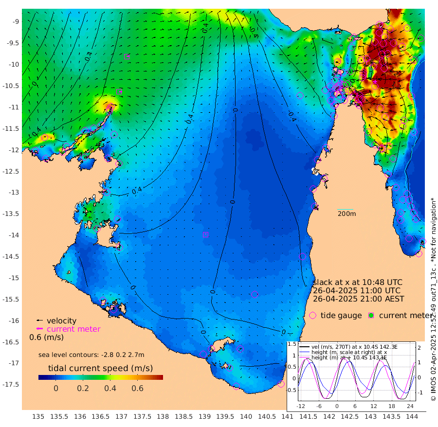 27cm/s 93T +3cm/s rms + 7cm/s -42T. ARA-GOC87 57m 6cm/s -23T +3cm/s rms + 2cm/s -2T. ARA-GOC87 60m 29cm/s 80T +2cm/s rms + 3cm/s 61T. ARA-GOC87 47m 134cm Daru 142cm Bobo Island 110cm Meer Island Barge 136cm Bramble Cay 144cm Unnamed Cay 144cm Pearce Cay 146cm Stephens Island 152cm Merrie England Shoals 134cm Mutacomal Reef 134cm Darnley Island Barge 122cm East Cay 128cm Yorke Island Barge 136cm Rennel Island 128cm Aureed Island 112cm Dungeness Reef 58cm Zagai Island 50cm Yam Island -25cm Dauan Island -33cm Saibai Island 16cm Phipi Reef 49cm Warrior Reef - West -32cm Mabuiag Island Barge 131cm Half Way Island 121cm Coconut Island 120cm Dugong Islet 84cm Poll Island 93cm Kirkcaldie Reef 55cm Suarji Island 70cm Sue Islet -57cm Hawkesbury Island 44cm Alert Patches 48cm Twin Island -47cm Badu Island 32cm St Pauls (Moa Island) -24cm Kubin (Moa Island) 10cm Ince Point -7cm Thursday Island -4cm Nardana Patches -17cm Turtle Head -22cm Round Island -45cm Goods Island -72cm Booby Island -58cm White Rocks Area -83cm Carpentaria 32cm Papou Point -40cm Bampfield Head -58cm Crab Island -71cm Red Wallis Island -32cm Packe Island 137cm Harrington Reef -56cm Herald Camp 2cm Sharp Point -18cm Red Island Point 27cm Possession Island 48cm Alpha Rock 84cm Frederick Point 131cm Wyborn Reef Light 117cm Tetley Island 88cm Triangle Reef 147cm Turtle Head Island 100cm Maclennan Cay 90cm Raine Island 135cm Mcsweeny Reef 130cm Collette Reef 103cm Shadwell Reef 147cm Hannibal Island 142cm Round Point -65cm Vrilya Point 125cm Cape Grenville 122cm Hicks Island 106cm Sir Charles Hardy Island 39cm Harvey Island 117cm Kay Reef 99cm Rocky Island 89cm Chapman Island 84cm Ham Reef 95cm Jubilee Reef 94cm Night Island 88cm Unnamed Reef No. 3 108cm Morris Island 97cm 1st 3 Mile Opening 99cm Creech Reef 109cm Fife Island 118cm Eden Reef 108cm Stanley Island 122cm Normanby River 70cm Yabooma Island 108cm Hutchison River 79cm Elcho Island 65cm North West Crocodile Island 68cm Cape Wessel 88cm Stevens Island 102cm Guluwuru Island 75cm Hopeful Bay 78cm Auster Point 71cm Two Island Bay 108cm Cadell Strait 135cm Mallison Island 90cm Melville Bay (Gove Harbour) 94cm Truant Island 66cm Cape Arnhem 50cm Cape Grey 42cm Hawk Island 15cm Milner Bay (Groote Eylandt) 9cm Cape Beatrice -21cm West Island -18cm Centre Island 14cm Mornington Island 6cm West Wellesley Islands 3cm Bountiful Island 11cm Albert River Mouth 24cm Sweers Island 13cm Karumba -1cm Nassau River Offshore -7cm Christmas Creek -20cm Archer River -33cm Boyd Point -37cm Weipa (Humbug Point) -28cm Pennefather River -66cm Cullen Point