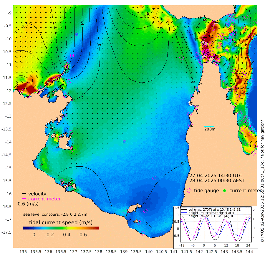 7cm/s 55T +3cm/s rms + 7cm/s -42T. ARA-GOC87 57m 9cm/s 111T +3cm/s rms + 2cm/s -2T. ARA-GOC87 60m 6cm/s 5T +2cm/s rms + 3cm/s 61T. ARA-GOC87 47m 117cm Daru 106cm Bobo Island 21cm Meer Island Barge 42cm Bramble Cay 86cm Unnamed Cay 81cm Pearce Cay 70cm Stephens Island 78cm Merrie England Shoals 111cm Mutacomal Reef 67cm Darnley Island Barge 18cm East Cay 94cm Yorke Island Barge 92cm Rennel Island 101cm Aureed Island 116cm Dungeness Reef 148cm Zagai Island 137cm Yam Island 127cm Dauan Island 129cm Saibai Island 140cm Phipi Reef 146cm Warrior Reef - West 100cm Mabuiag Island Barge 91cm Half Way Island 125cm Coconut Island 107cm Dugong Islet 128cm Poll Island 125cm Kirkcaldie Reef 152cm Suarji Island 133cm Sue Islet 4cm Hawkesbury Island 129cm Alert Patches 129cm Twin Island 35cm Badu Island 141cm St Pauls (Moa Island) 46cm Kubin (Moa Island) 103cm Ince Point 85cm Thursday Island 91cm Nardana Patches 55cm Turtle Head 45cm Round Island 5cm Goods Island -16cm Booby Island -13cm White Rocks Area 4cm Carpentaria 115cm Papou Point 19cm Bampfield Head -13cm Crab Island -12cm Red Wallis Island 28cm Packe Island 124cm Harrington Reef 17cm Herald Camp 52cm Sharp Point 40cm Red Island Point 100cm Possession Island 124cm Alpha Rock 127cm Frederick Point 120cm Wyborn Reef Light 126cm Tetley Island 34cm Triangle Reef 112cm Turtle Head Island 23cm Maclennan Cay -6cm Raine Island 79cm Mcsweeny Reef 68cm Collette Reef 29cm Shadwell Reef 70cm Hannibal Island 39cm Round Point -16cm Vrilya Point 36cm Cape Grenville 28cm Hicks Island 27cm Sir Charles Hardy Island 12cm Harvey Island 14cm Kay Reef 3cm Rocky Island -8cm Chapman Island -7cm Ham Reef 1cm Jubilee Reef 7cm Night Island -7cm Unnamed Reef No. 3 0cm Morris Island 3cm 1st 3 Mile Opening 2cm Creech Reef -4cm Fife Island -13cm Eden Reef -1cm Stanley Island -8cm Normanby River -164cm Yabooma Island -163cm Hutchison River -156cm Elcho Island -158cm North West Crocodile Island -68cm Cape Wessel -119cm Stevens Island -17cm Guluwuru Island -119cm Hopeful Bay -85cm Auster Point -95cm Two Island Bay -120cm Cadell Strait 64cm Mallison Island -27cm Melville Bay (Gove Harbour) -24cm Truant Island -2cm Cape Arnhem 4cm Cape Grey 6cm Hawk Island 9cm Milner Bay (Groote Eylandt) 3cm Cape Beatrice 20cm West Island 28cm Centre Island 20cm Mornington Island 16cm West Wellesley Islands -2cm Bountiful Island -28cm Albert River Mouth -19cm Sweers Island -23cm Karumba 1cm Nassau River Offshore 7cm Christmas Creek -11cm Archer River -2cm Boyd Point -19cm Weipa (Humbug Point) -5cm Pennefather River -11cm Cullen Point