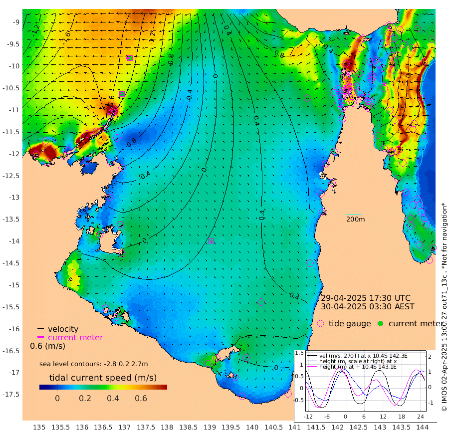 27cm/s -81T +3cm/s rms + 7cm/s -42T. ARA-GOC87 57m 21cm/s 155T +3cm/s rms + 2cm/s -2T. ARA-GOC87 60m 36cm/s -91T +2cm/s rms + 3cm/s 61T. ARA-GOC87 47m 30cm Daru 10cm Bobo Island -12cm Meer Island Barge -15cm Bramble Cay 12cm Unnamed Cay -2cm Pearce Cay 0cm Stephens Island 5cm Merrie England Shoals 28cm Mutacomal Reef 6cm Darnley Island Barge -20cm East Cay 22cm Yorke Island Barge 17cm Rennel Island 21cm Aureed Island 41cm Dungeness Reef 72cm Zagai Island 73cm Yam Island 103cm Dauan Island 104cm Saibai Island 95cm Phipi Reef 79cm Warrior Reef - West 90cm Mabuiag Island Barge 19cm Half Way Island 37cm Coconut Island 35cm Dugong Islet 55cm Poll Island 58cm Kirkcaldie Reef 87cm Suarji Island 69cm Sue Islet 58cm Hawkesbury Island 86cm Alert Patches 77cm Twin Island 67cm Badu Island 90cm St Pauls (Moa Island) 64cm Kubin (Moa Island) 83cm Ince Point 84cm Thursday Island 84cm Nardana Patches 76cm Turtle Head 68cm Round Island 62cm Goods Island 70cm Booby Island 58cm White Rocks Area 91cm Carpentaria 66cm Papou Point 79cm Bampfield Head 59cm Crab Island 67cm Red Wallis Island 68cm Packe Island 35cm Harrington Reef 83cm Herald Camp 37cm Sharp Point 57cm Red Island Point 72cm Possession Island 72cm Alpha Rock 58cm Frederick Point 29cm Wyborn Reef Light 37cm Tetley Island 0cm Triangle Reef 19cm Turtle Head Island -5cm Maclennan Cay -18cm Raine Island 12cm Mcsweeny Reef 9cm Collette Reef -1cm Shadwell Reef 3cm Hannibal Island -18cm Round Point 68cm Vrilya Point -5cm Cape Grenville -13cm Hicks Island 0cm Sir Charles Hardy Island -1cm Harvey Island -14cm Kay Reef -16cm Rocky Island -18cm Chapman Island -15cm Ham Reef -15cm Jubilee Reef -11cm Night Island -16cm Unnamed Reef No. 3 -21cm Morris Island -9cm 1st 3 Mile Opening -13cm Creech Reef -24cm Fife Island -33cm Eden Reef -16cm Stanley Island -33cm Normanby River -261cm Yabooma Island -305cm Hutchison River -269cm Elcho Island -262cm North West Crocodile Island -168cm Cape Wessel -239cm Stevens Island -138cm Guluwuru Island -217cm Hopeful Bay -187cm Auster Point -196cm Two Island Bay -259cm Cadell Strait -52cm Mallison Island -134cm Melville Bay (Gove Harbour) -137cm Truant Island -80cm Cape Arnhem -54cm Cape Grey -44cm Hawk Island -17cm Milner Bay (Groote Eylandt) -10cm Cape Beatrice 40cm West Island 45cm Centre Island 32cm Mornington Island 40cm West Wellesley Islands 21cm Bountiful Island -28cm Albert River Mouth -29cm Sweers Island -17cm Karumba 44cm Nassau River Offshore 62cm Christmas Creek 51cm Archer River 61cm Boyd Point 55cm Weipa (Humbug Point) 54cm Pennefather River 70cm Cullen Point