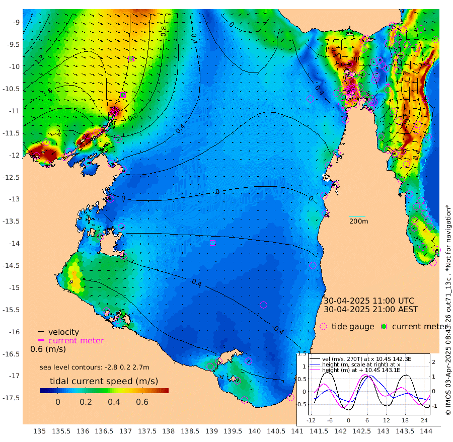 35cm/s 127T +3cm/s rms + 7cm/s -42T. ARA-GOC87 57m 11cm/s 1T +3cm/s rms + 2cm/s -2T. ARA-GOC87 60m 38cm/s 122T +2cm/s rms + 3cm/s 61T. ARA-GOC87 47m -28cm Daru -14cm Bobo Island 20cm Meer Island Barge 17cm Bramble Cay -10cm Unnamed Cay 2cm Pearce Cay 1cm Stephens Island -2cm Merrie England Shoals -26cm Mutacomal Reef -6cm Darnley Island Barge 28cm East Cay -22cm Yorke Island Barge -10cm Rennel Island -21cm Aureed Island -29cm Dungeness Reef -54cm Zagai Island -50cm Yam Island -60cm Dauan Island -66cm Saibai Island -56cm Phipi Reef -62cm Warrior Reef - West -24cm Mabuiag Island Barge -15cm Half Way Island -19cm Coconut Island -29cm Dugong Islet -36cm Poll Island -33cm Kirkcaldie Reef -49cm Suarji Island -50cm Sue Islet 81cm Hawkesbury Island -26cm Alert Patches -27cm Twin Island 65cm Badu Island -41cm St Pauls (Moa Island) 42cm Kubin (Moa Island) -10cm Ince Point 7cm Thursday Island 1cm Nardana Patches 34cm Turtle Head 54cm Round Island 82cm Goods Island 98cm Booby Island 98cm White Rocks Area 66cm Carpentaria -18cm Papou Point 104cm Bampfield Head 90cm Crab Island 89cm Red Wallis Island 57cm Packe Island -24cm Harrington Reef 63cm Herald Camp -31cm Sharp Point 43cm Red Island Point 5cm Possession Island -38cm Alpha Rock -26cm Frederick Point -20cm Wyborn Reef Light -24cm Tetley Island 14cm Triangle Reef -1cm Turtle Head Island 19cm Maclennan Cay 41cm Raine Island -7cm Mcsweeny Reef -3cm Collette Reef 15cm Shadwell Reef 0cm Hannibal Island 24cm Round Point 79cm Vrilya Point 14cm Cape Grenville 23cm Hicks Island 15cm Sir Charles Hardy Island 3cm Harvey Island 27cm Kay Reef 30cm Rocky Island 39cm Chapman Island 34cm Ham Reef 31cm Jubilee Reef 25cm Night Island 37cm Unnamed Reef No. 3 36cm Morris Island 35cm 1st 3 Mile Opening 32cm Creech Reef 33cm Fife Island 45cm Eden Reef 32cm Stanley Island 39cm Normanby River 219cm Yabooma Island 250cm Hutchison River 218cm Elcho Island 207cm North West Crocodile Island 128cm Cape Wessel 187cm Stevens Island 89cm Guluwuru Island 170cm Hopeful Bay 149cm Auster Point 146cm Two Island Bay 191cm Cadell Strait -9cm Mallison Island 87cm Melville Bay (Gove Harbour) 95cm Truant Island 47cm Cape Arnhem 13cm Cape Grey -6cm Hawk Island -39cm Milner Bay (Groote Eylandt) -50cm Cape Beatrice -105cm West Island -101cm Centre Island -112cm Mornington Island -120cm West Wellesley Islands -127cm Bountiful Island -114cm Albert River Mouth -128cm Sweers Island -112cm Karumba -81cm Nassau River Offshore -46cm Christmas Creek 17cm Archer River 24cm Boyd Point 37cm Weipa (Humbug Point) 48cm Pennefather River 56cm Cullen Point