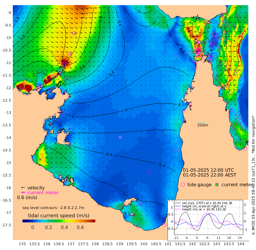 40cm/s 123T +3cm/s rms + 7cm/s -42T. ARA-GOC87 57m 10cm/s 13T +3cm/s rms + 2cm/s -2T. ARA-GOC87 60m 43cm/s 118T +2cm/s rms + 3cm/s 61T. ARA-GOC87 47m -13cm Daru 0cm Bobo Island 17cm Meer Island Barge 17cm Bramble Cay -2cm Unnamed Cay 10cm Pearce Cay 5cm Stephens Island 1cm Merrie England Shoals -12cm Mutacomal Reef -1cm Darnley Island Barge 24cm East Cay -10cm Yorke Island Barge -1cm Rennel Island -9cm Aureed Island -12cm Dungeness Reef -22cm Zagai Island -20cm Yam Island -23cm Dauan Island -27cm Saibai Island -22cm Phipi Reef -30cm Warrior Reef - West 6cm Mabuiag Island Barge -6cm Half Way Island -1cm Coconut Island -16cm Dugong Islet -13cm Poll Island -14cm Kirkcaldie Reef -20cm Suarji Island -25cm Sue Islet 95cm Hawkesbury Island -3cm Alert Patches -2cm Twin Island 83cm Badu Island -11cm St Pauls (Moa Island) 61cm Kubin (Moa Island) 13cm Ince Point 27cm Thursday Island 23cm Nardana Patches 49cm Turtle Head 72cm Round Island 90cm Goods Island 103cm Booby Island 102cm White Rocks Area 70cm Carpentaria 8cm Papou Point 116cm Bampfield Head 91cm Crab Island 93cm Red Wallis Island 69cm Packe Island -10cm Harrington Reef 77cm Herald Camp -21cm Sharp Point 56cm Red Island Point 27cm Possession Island -14cm Alpha Rock -5cm Frederick Point -2cm Wyborn Reef Light -3cm Tetley Island 16cm Triangle Reef 14cm Turtle Head Island 16cm Maclennan Cay 33cm Raine Island -1cm Mcsweeny Reef 1cm Collette Reef 13cm Shadwell Reef 3cm Hannibal Island 23cm Round Point 76cm Vrilya Point 11cm Cape Grenville 20cm Hicks Island 15cm Sir Charles Hardy Island 2cm Harvey Island 21cm Kay Reef 24cm Rocky Island 32cm Chapman Island 27cm Ham Reef 25cm Jubilee Reef 18cm Night Island 28cm Unnamed Reef No. 3 27cm Morris Island 27cm 1st 3 Mile Opening 24cm Creech Reef 21cm Fife Island 35cm Eden Reef 22cm Stanley Island 28cm Normanby River 225cm Yabooma Island 262cm Hutchison River 224cm Elcho Island 213cm North West Crocodile Island 142cm Cape Wessel 198cm Stevens Island 110cm Guluwuru Island 177cm Hopeful Bay 161cm Auster Point 159cm Two Island Bay 207cm Cadell Strait 20cm Mallison Island 103cm Melville Bay (Gove Harbour) 114cm Truant Island 60cm Cape Arnhem 20cm Cape Grey -2cm Hawk Island -43cm Milner Bay (Groote Eylandt) -58cm Cape Beatrice -119cm West Island -115cm Centre Island -129cm Mornington Island -139cm West Wellesley Islands -143cm Bountiful Island -138cm Albert River Mouth -153cm Sweers Island -137cm Karumba -97cm Nassau River Offshore -57cm Christmas Creek 8cm Archer River 22cm Boyd Point 32cm Weipa (Humbug Point) 41cm Pennefather River 56cm Cullen Point
