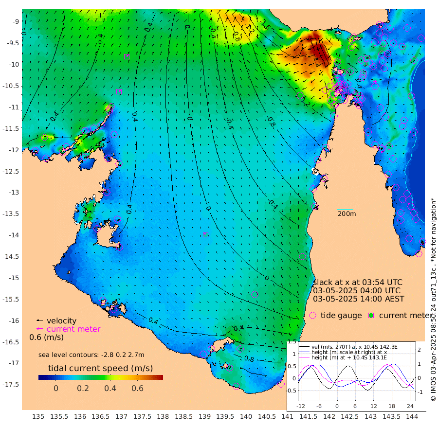 19cm/s 38T +3cm/s rms + 7cm/s -42T. ARA-GOC87 57m 18cm/s -49T +3cm/s rms + 2cm/s -2T. ARA-GOC87 60m 28cm/s 37T +2cm/s rms + 3cm/s 61T. ARA-GOC87 47m -46cm Daru -34cm Bobo Island -17cm Meer Island Barge -25cm Bramble Cay -42cm Unnamed Cay -34cm Pearce Cay -35cm Stephens Island -43cm Merrie England Shoals -53cm Mutacomal Reef -25cm Darnley Island Barge -24cm East Cay -32cm Yorke Island Barge -49cm Rennel Island -31cm Aureed Island -53cm Dungeness Reef -47cm Zagai Island -69cm Yam Island -54cm Dauan Island -51cm Saibai Island -54cm Phipi Reef -47cm Warrior Reef - West -97cm Mabuiag Island Barge -51cm Half Way Island -58cm Coconut Island -57cm Dugong Islet -64cm Poll Island -79cm Kirkcaldie Reef -77cm Suarji Island -62cm Sue Islet -189cm Hawkesbury Island -106cm Alert Patches -99cm Twin Island -160cm Badu Island -97cm St Pauls (Moa Island) -151cm Kubin (Moa Island) -117cm Ince Point -134cm Thursday Island -127cm Nardana Patches -145cm Turtle Head -161cm Round Island -173cm Goods Island -198cm Booby Island -189cm White Rocks Area -182cm Carpentaria -95cm Papou Point -211cm Bampfield Head -172cm Crab Island -189cm Red Wallis Island -165cm Packe Island -67cm Harrington Reef -191cm Herald Camp -21cm Sharp Point -141cm Red Island Point -120cm Possession Island -82cm Alpha Rock -84cm Frederick Point -58cm Wyborn Reef Light -64cm Tetley Island -24cm Triangle Reef -76cm Turtle Head Island -29cm Maclennan Cay -21cm Raine Island -39cm Mcsweeny Reef -32cm Collette Reef -22cm Shadwell Reef -30cm Hannibal Island -32cm Round Point -171cm Vrilya Point -33cm Cape Grenville -29cm Hicks Island -29cm Sir Charles Hardy Island -10cm Harvey Island -28cm Kay Reef -20cm Rocky Island -17cm Chapman Island -20cm Ham Reef -21cm Jubilee Reef -19cm Night Island -22cm Unnamed Reef No. 3 -22cm Morris Island -25cm 1st 3 Mile Opening -23cm Creech Reef -15cm Fife Island -11cm Eden Reef -24cm Stanley Island -20cm Normanby River 41cm Yabooma Island 66cm Hutchison River 61cm Elcho Island 55cm North West Crocodile Island 52cm Cape Wessel 62cm Stevens Island 80cm Guluwuru Island 61cm Hopeful Bay 49cm Auster Point 51cm Two Island Bay 85cm Cadell Strait 143cm Mallison Island 73cm Melville Bay (Gove Harbour) 69cm Truant Island 58cm Cape Arnhem 57cm Cape Grey 67cm Hawk Island 70cm Milner Bay (Groote Eylandt) 69cm Cape Beatrice 63cm West Island 62cm Centre Island 104cm Mornington Island 104cm West Wellesley Islands 131cm Bountiful Island 191cm Albert River Mouth 208cm Sweers Island 165cm Karumba 51cm Nassau River Offshore -7cm Christmas Creek -63cm Archer River -88cm Boyd Point -90cm Weipa (Humbug Point) -110cm Pennefather River -144cm Cullen Point