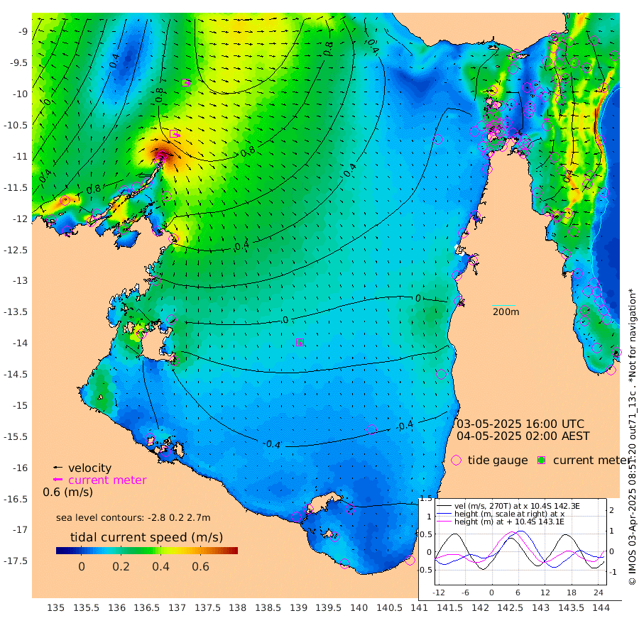 45cm/s 113T +3cm/s rms + 7cm/s -42T. ARA-GOC87 57m 20cm/s 155T +3cm/s rms + 2cm/s -2T. ARA-GOC87 60m 38cm/s 106T +2cm/s rms + 3cm/s 61T. ARA-GOC87 47m 30cm Daru 41cm Bobo Island 57cm Meer Island Barge 51cm Bramble Cay 38cm Unnamed Cay 48cm Pearce Cay 44cm Stephens Island 34cm Merrie England Shoals 26cm Mutacomal Reef 52cm Darnley Island Barge 57cm East Cay 44cm Yorke Island Barge 32cm Rennel Island 40cm Aureed Island 27cm Dungeness Reef 28cm Zagai Island 21cm Yam Island 39cm Dauan Island 42cm Saibai Island 21cm Phipi Reef 29cm Warrior Reef - West 25cm Mabuiag Island Barge 30cm Half Way Island 29cm Coconut Island 27cm Dugong Islet 21cm Poll Island 16cm Kirkcaldie Reef 8cm Suarji Island 25cm Sue Islet 62cm Hawkesbury Island 13cm Alert Patches 18cm Twin Island 55cm Badu Island 14cm St Pauls (Moa Island) 46cm Kubin (Moa Island) 20cm Ince Point 25cm Thursday Island 23cm Nardana Patches 36cm Turtle Head 42cm Round Island 54cm Goods Island 56cm Booby Island 47cm White Rocks Area 47cm Carpentaria 20cm Papou Point 69cm Bampfield Head 43cm Crab Island 51cm Red Wallis Island 47cm Packe Island 20cm Harrington Reef 57cm Herald Camp -7cm Sharp Point 33cm Red Island Point 22cm Possession Island 14cm Alpha Rock 21cm Frederick Point 31cm Wyborn Reef Light 30cm Tetley Island 53cm Triangle Reef 37cm Turtle Head Island 51cm Maclennan Cay 56cm Raine Island 38cm Mcsweeny Reef 42cm Collette Reef 50cm Shadwell Reef 45cm Hannibal Island 52cm Round Point 36cm Vrilya Point 44cm Cape Grenville 52cm Hicks Island 66cm Sir Charles Hardy Island 14cm Harvey Island 52cm Kay Reef 56cm Rocky Island 66cm Chapman Island 61cm Ham Reef 59cm Jubilee Reef 47cm Night Island 59cm Unnamed Reef No. 3 56cm Morris Island 56cm 1st 3 Mile Opening 57cm Creech Reef 53cm Fife Island 72cm Eden Reef 55cm Stanley Island 59cm Normanby River 98cm Yabooma Island 119cm Hutchison River 90cm Elcho Island 77cm North West Crocodile Island 108cm Cape Wessel 101cm Stevens Island 128cm Guluwuru Island 92cm Hopeful Bay 98cm Auster Point 104cm Two Island Bay 144cm Cadell Strait 226cm Mallison Island 101cm Melville Bay (Gove Harbour) 116cm Truant Island 72cm Cape Arnhem 19cm Cape Grey -6cm Hawk Island -60cm Milner Bay (Groote Eylandt) -75cm Cape Beatrice -130cm West Island -129cm Centre Island -123cm Mornington Island -122cm West Wellesley Islands -134cm Bountiful Island -174cm Albert River Mouth -189cm Sweers Island -172cm Karumba -74cm Nassau River Offshore -22cm Christmas Creek 16cm Archer River 32cm Boyd Point 34cm Weipa (Humbug Point) 21cm Pennefather River 39cm Cullen Point