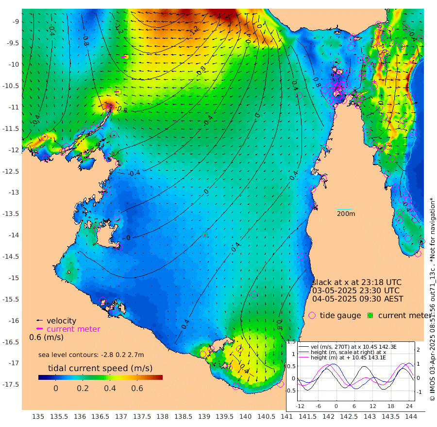 45cm/s -93T +3cm/s rms + 7cm/s -42T. ARA-GOC87 57m 20cm/s -155T +3cm/s rms + 2cm/s -2T. ARA-GOC87 60m 49cm/s -100T +2cm/s rms + 3cm/s 61T. ARA-GOC87 47m 22cm Daru 1cm Bobo Island -29cm Meer Island Barge -19cm Bramble Cay 0cm Unnamed Cay 0cm Pearce Cay -10cm Stephens Island -1cm Merrie England Shoals 22cm Mutacomal Reef -20cm Darnley Island Barge -27cm East Cay -4cm Yorke Island Barge 13cm Rennel Island 3cm Aureed Island 38cm Dungeness Reef 49cm Zagai Island 65cm Yam Island 95cm Dauan Island 74cm Saibai Island 114cm Phipi Reef 69cm Warrior Reef - West 87cm Mabuiag Island Barge 12cm Half Way Island 27cm Coconut Island 24cm Dugong Islet 49cm Poll Island 55cm Kirkcaldie Reef 77cm Suarji Island 40cm Sue Islet 108cm Hawkesbury Island 83cm Alert Patches 73cm Twin Island 113cm Badu Island 83cm St Pauls (Moa Island) 97cm Kubin (Moa Island) 89cm Ince Point 94cm Thursday Island 94cm Nardana Patches 105cm Turtle Head 93cm Round Island 106cm Goods Island 104cm Booby Island 103cm White Rocks Area 54cm Carpentaria 66cm Papou Point 74cm Bampfield Head 90cm Crab Island 103cm Red Wallis Island 107cm Packe Island 27cm Harrington Reef 102cm Herald Camp 29cm Sharp Point 95cm Red Island Point 75cm Possession Island 53cm Alpha Rock 52cm Frederick Point 17cm Wyborn Reef Light 24cm Tetley Island -13cm Triangle Reef 12cm Turtle Head Island -17cm Maclennan Cay -25cm Raine Island -2cm Mcsweeny Reef -9cm Collette Reef -19cm Shadwell Reef -13cm Hannibal Island -18cm Round Point 77cm Vrilya Point -16cm Cape Grenville -20cm Hicks Island -22cm Sir Charles Hardy Island -6cm Harvey Island -26cm Kay Reef -25cm Rocky Island -30cm Chapman Island -32cm Ham Reef -29cm Jubilee Reef -21cm Night Island -29cm Unnamed Reef No. 3 -27cm Morris Island -25cm 1st 3 Mile Opening -27cm Creech Reef -31cm Fife Island -42cm Eden Reef -31cm Stanley Island -37cm Normanby River -79cm Yabooma Island -91cm Hutchison River -80cm Elcho Island -64cm North West Crocodile Island -124cm Cape Wessel -105cm Stevens Island -135cm Guluwuru Island -96cm Hopeful Bay -110cm Auster Point -114cm Two Island Bay -127cm Cadell Strait -256cm Mallison Island -109cm Melville Bay (Gove Harbour) -126cm Truant Island -84cm Cape Arnhem -50cm Cape Grey -30cm Hawk Island -12cm Milner Bay (Groote Eylandt) 11cm Cape Beatrice 43cm West Island 40cm Centre Island 80cm Mornington Island 73cm West Wellesley Islands 105cm Bountiful Island 110cm Albert River Mouth 92cm Sweers Island 126cm Karumba 104cm Nassau River Offshore 96cm Christmas Creek 76cm Archer River 62cm Boyd Point 78cm Weipa (Humbug Point) 61cm Pennefather River 73cm Cullen Point
