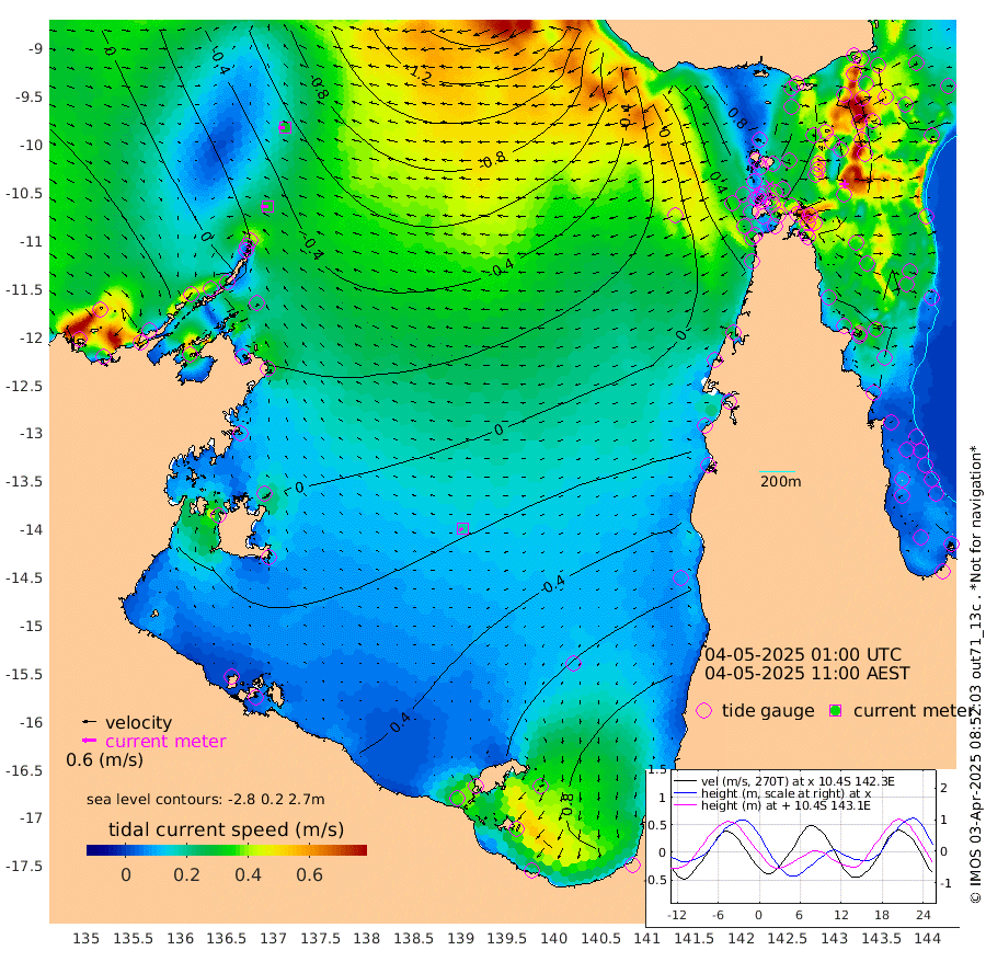31cm/s -92T +3cm/s rms + 7cm/s -42T. ARA-GOC87 57m 18cm/s -119T +3cm/s rms + 2cm/s -2T. ARA-GOC87 60m 29cm/s -96T +2cm/s rms + 3cm/s 61T. ARA-GOC87 47m -32cm Daru -45cm Bobo Island -56cm Meer Island Barge -54cm Bramble Cay -50cm Unnamed Cay -45cm Pearce Cay -58cm Stephens Island -54cm Merrie England Shoals -35cm Mutacomal Reef -61cm Darnley Island Barge -59cm East Cay -50cm Yorke Island Barge -41cm Rennel Island -42cm Aureed Island -14cm Dungeness Reef 11cm Zagai Island 15cm Yam Island 74cm Dauan Island 53cm Saibai Island 88cm Phipi Reef 31cm Warrior Reef - West 48cm Mabuiag Island Barge -45cm Half Way Island -26cm Coconut Island -37cm Dugong Islet -5cm Poll Island -10cm Kirkcaldie Reef 24cm Suarji Island -12cm Sue Islet 46cm Hawkesbury Island 21cm Alert Patches 11cm Twin Island 67cm Badu Island 25cm St Pauls (Moa Island) 41cm Kubin (Moa Island) 30cm Ince Point 34cm Thursday Island 36cm Nardana Patches 48cm Turtle Head 37cm Round Island 51cm Goods Island 43cm Booby Island 43cm White Rocks Area -11cm Carpentaria 13cm Papou Point 9cm Bampfield Head 37cm Crab Island 41cm Red Wallis Island 46cm Packe Island -41cm Harrington Reef 35cm Herald Camp 11cm Sharp Point 39cm Red Island Point 17cm Possession Island -3cm Alpha Rock -10cm Frederick Point -39cm Wyborn Reef Light -32cm Tetley Island -39cm Triangle Reef -53cm Turtle Head Island -50cm Maclennan Cay -44cm Raine Island -50cm Mcsweeny Reef -50cm Collette Reef -46cm Shadwell Reef -57cm Hannibal Island -57cm Round Point 19cm Vrilya Point -57cm Cape Grenville -55cm Hicks Island -56cm Sir Charles Hardy Island -19cm Harvey Island -60cm Kay Reef -49cm Rocky Island -48cm Chapman Island -52cm Ham Reef -52cm Jubilee Reef -45cm Night Island -51cm Unnamed Reef No. 3 -53cm Morris Island -49cm 1st 3 Mile Opening -53cm Creech Reef -57cm Fife Island -62cm Eden Reef -59cm Stanley Island -67cm Normanby River 6cm Yabooma Island 16cm Hutchison River 16cm Elcho Island 26cm North West Crocodile Island -61cm Cape Wessel -19cm Stevens Island -69cm Guluwuru Island -15cm Hopeful Bay -42cm Auster Point -47cm Two Island Bay -30cm Cadell Strait -185cm Mallison Island -47cm Melville Bay (Gove Harbour) -64cm Truant Island -41cm Cape Arnhem -17cm Cape Grey 3cm Hawk Island 14cm Milner Bay (Groote Eylandt) 31cm Cape Beatrice 43cm West Island 42cm Centre Island 99cm Mornington Island 90cm West Wellesley Islands 139cm Bountiful Island 181cm Albert River Mouth 166cm Sweers Island 181cm Karumba 104cm Nassau River Offshore 78cm Christmas Creek 50cm Archer River 27cm Boyd Point 47cm Weipa (Humbug Point) 20cm Pennefather River 24cm Cullen Point
