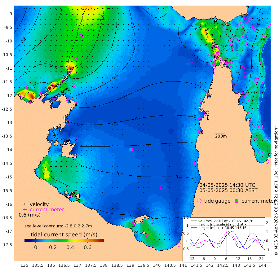 33cm/s 120T +3cm/s rms + 7cm/s -42T. ARA-GOC87 57m 9cm/s 35T +3cm/s rms + 2cm/s -2T. ARA-GOC87 60m 35cm/s 114T +2cm/s rms + 3cm/s 61T. ARA-GOC87 47m -43cm Daru -40cm Bobo Island -24cm Meer Island Barge -34cm Bramble Cay -41cm Unnamed Cay -41cm Pearce Cay -45cm Stephens Island -49cm Merrie England Shoals -44cm Mutacomal Reef -40cm Darnley Island Barge -29cm East Cay -40cm Yorke Island Barge -43cm Rennel Island -42cm Aureed Island -35cm Dungeness Reef -4cm Zagai Island -6cm Yam Island 32cm Dauan Island 33cm Saibai Island 12cm Phipi Reef -10cm Warrior Reef - West 43cm Mabuiag Island Barge -46cm Half Way Island -30cm Coconut Island -46cm Dugong Islet -22cm Poll Island -32cm Kirkcaldie Reef -9cm Suarji Island -20cm Sue Islet 96cm Hawkesbury Island 0cm Alert Patches -1cm Twin Island 89cm Badu Island 4cm St Pauls (Moa Island) 66cm Kubin (Moa Island) 22cm Ince Point 35cm Thursday Island 33cm Nardana Patches 50cm Turtle Head 81cm Round Island 84cm Goods Island 98cm Booby Island 90cm White Rocks Area 81cm Carpentaria 14cm Papou Point 123cm Bampfield Head 79cm Crab Island 86cm Red Wallis Island 64cm Packe Island -50cm Harrington Reef 93cm Herald Camp -8cm Sharp Point 45cm Red Island Point 31cm Possession Island -6cm Alpha Rock -20cm Frederick Point -30cm Wyborn Reef Light -24cm Tetley Island -14cm Triangle Reef -30cm Turtle Head Island -23cm Maclennan Cay -11cm Raine Island -43cm Mcsweeny Reef -39cm Collette Reef -23cm Shadwell Reef -44cm Hannibal Island -34cm Round Point 65cm Vrilya Point -36cm Cape Grenville -28cm Hicks Island -20cm Sir Charles Hardy Island -12cm Harvey Island -29cm Kay Reef -19cm Rocky Island -10cm Chapman Island -12cm Ham Reef -17cm Jubilee Reef -23cm Night Island -16cm Unnamed Reef No. 3 -22cm Morris Island -13cm 1st 3 Mile Opening -21cm Creech Reef -33cm Fife Island -20cm Eden Reef -26cm Stanley Island -30cm Normanby River 161cm Yabooma Island 180cm Hutchison River 155cm Elcho Island 145cm North West Crocodile Island 113cm Cape Wessel 142cm Stevens Island 92cm Guluwuru Island 130cm Hopeful Bay 121cm Auster Point 123cm Two Island Bay 144cm Cadell Strait 59cm Mallison Island 83cm Melville Bay (Gove Harbour) 95cm Truant Island 52cm Cape Arnhem 15cm Cape Grey -4cm Hawk Island -35cm Milner Bay (Groote Eylandt) -56cm Cape Beatrice -104cm West Island -98cm Centre Island -128cm Mornington Island -133cm West Wellesley Islands -132cm Bountiful Island -143cm Albert River Mouth -154cm Sweers Island -146cm Karumba -103cm Nassau River Offshore -62cm Christmas Creek -4cm Archer River 21cm Boyd Point 27cm Weipa (Humbug Point) 25cm Pennefather River 60cm Cullen Point