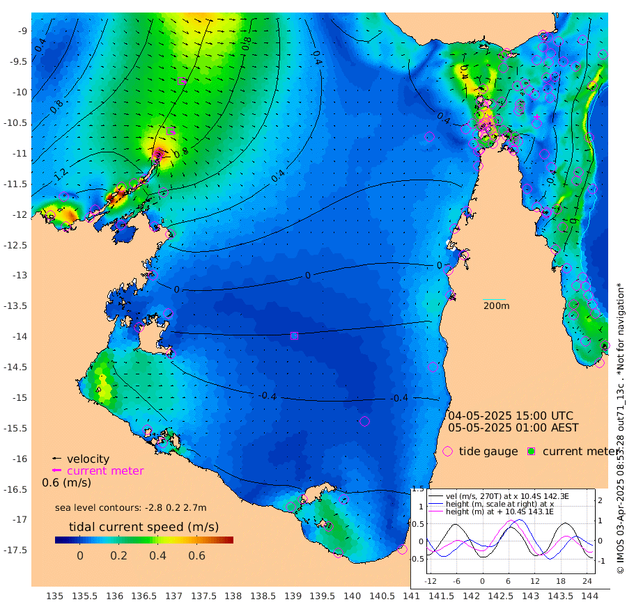 37cm/s 118T +3cm/s rms + 7cm/s -42T. ARA-GOC87 57m 6cm/s 72T +3cm/s rms + 2cm/s -2T. ARA-GOC87 60m 37cm/s 112T +2cm/s rms + 3cm/s 61T. ARA-GOC87 47m -38cm Daru -32cm Bobo Island -10cm Meer Island Barge -21cm Bramble Cay -33cm Unnamed Cay -31cm Pearce Cay -34cm Stephens Island -40cm Merrie England Shoals -39cm Mutacomal Reef -27cm Darnley Island Barge -14cm East Cay -30cm Yorke Island Barge -36cm Rennel Island -34cm Aureed Island -31cm Dungeness Reef -5cm Zagai Island -8cm Yam Island 31cm Dauan Island 33cm Saibai Island 9cm Phipi Reef -9cm Warrior Reef - West 36cm Mabuiag Island Barge -40cm Half Way Island -28cm Coconut Island -41cm Dugong Islet -22cm Poll Island -32cm Kirkcaldie Reef -15cm Suarji Island -19cm Sue Islet 89cm Hawkesbury Island -6cm Alert Patches -6cm Twin Island 82cm Badu Island -3cm St Pauls (Moa Island) 60cm Kubin (Moa Island) 15cm Ince Point 28cm Thursday Island 25cm Nardana Patches 44cm Turtle Head 72cm Round Island 78cm Goods Island 90cm Booby Island 82cm White Rocks Area 74cm Carpentaria 7cm Papou Point 113cm Bampfield Head 72cm Crab Island 80cm Red Wallis Island 59cm Packe Island -47cm Harrington Reef 87cm Herald Camp -11cm Sharp Point 39cm Red Island Point 23cm Possession Island -10cm Alpha Rock -21cm Frederick Point -26cm Wyborn Reef Light -23cm Tetley Island -3cm Triangle Reef -27cm Turtle Head Island -11cm Maclennan Cay 2cm Raine Island -34cm Mcsweeny Reef -28cm Collette Reef -10cm Shadwell Reef -32cm Hannibal Island -22cm Round Point 59cm Vrilya Point -24cm Cape Grenville -15cm Hicks Island -5cm Sir Charles Hardy Island -8cm Harvey Island -15cm Kay Reef -5cm Rocky Island 5cm Chapman Island 3cm Ham Reef -2cm Jubilee Reef -11cm Night Island -1cm Unnamed Reef No. 3 -8cm Morris Island 0cm 1st 3 Mile Opening -6cm Creech Reef -18cm Fife Island -2cm Eden Reef -11cm Stanley Island -14cm Normanby River 159cm Yabooma Island 178cm Hutchison River 151cm Elcho Island 140cm North West Crocodile Island 118cm Cape Wessel 143cm Stevens Island 105cm Guluwuru Island 131cm Hopeful Bay 124cm Auster Point 127cm Two Island Bay 153cm Cadell Strait 106cm Mallison Island 92cm Melville Bay (Gove Harbour) 105cm Truant Island 59cm Cape Arnhem 17cm Cape Grey -3cm Hawk Island -41cm Milner Bay (Groote Eylandt) -62cm Cape Beatrice -114cm West Island -109cm Centre Island -131cm Mornington Island -134cm West Wellesley Islands -134cm Bountiful Island -150cm Albert River Mouth -162cm Sweers Island -153cm Karumba -99cm Nassau River Offshore -54cm Christmas Creek 1cm Archer River 24cm Boyd Point 30cm Weipa (Humbug Point) 24cm Pennefather River 57cm Cullen Point