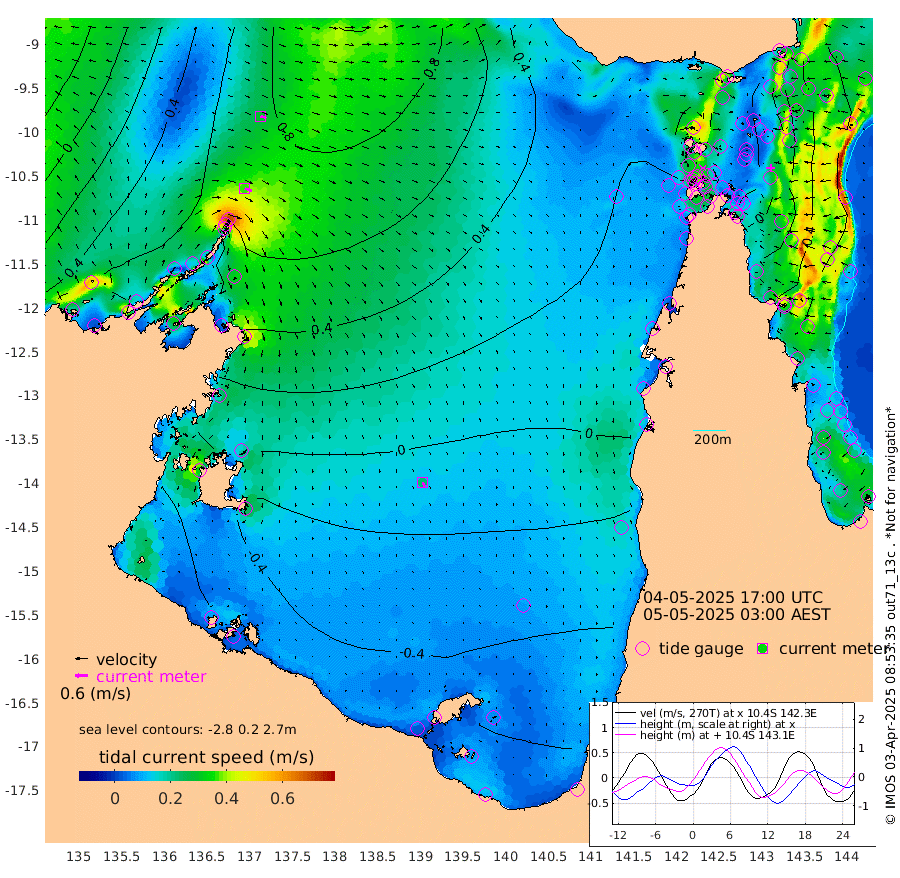36cm/s 113T +3cm/s rms + 7cm/s -42T. ARA-GOC87 57m 22cm/s 157T +3cm/s rms + 2cm/s -2T. ARA-GOC87 60m 29cm/s 106T +2cm/s rms + 3cm/s 61T. ARA-GOC87 47m 15cm Daru 25cm Bobo Island 56cm Meer Island Barge 47cm Bramble Cay 30cm Unnamed Cay 34cm Pearce Cay 36cm Stephens Island 28cm Merrie England Shoals 14cm Mutacomal Reef 45cm Darnley Island Barge 56cm East Cay 33cm Yorke Island Barge 20cm Rennel Island 26cm Aureed Island 10cm Dungeness Reef 4cm Zagai Island 1cm Yam Island 17cm Dauan Island 23cm Saibai Island -5cm Phipi Reef 6cm Warrior Reef - West 9cm Mabuiag Island Barge 18cm Half Way Island 10cm Coconut Island 13cm Dugong Islet 1cm Poll Island -2cm Kirkcaldie Reef -15cm Suarji Island 8cm Sue Islet 54cm Hawkesbury Island -7cm Alert Patches -2cm Twin Island 39cm Badu Island -8cm St Pauls (Moa Island) 33cm Kubin (Moa Island) 3cm Ince Point 10cm Thursday Island 7cm Nardana Patches 23cm Turtle Head 32cm Round Island 45cm Goods Island 51cm Booby Island 41cm White Rocks Area 47cm Carpentaria -1cm Papou Point 64cm Bampfield Head 37cm Crab Island 47cm Red Wallis Island 38cm Packe Island 3cm Harrington Reef 55cm Herald Camp -13cm Sharp Point 20cm Red Island Point 5cm Possession Island 0cm Alpha Rock 2cm Frederick Point 17cm Wyborn Reef Light 14cm Tetley Island 49cm Triangle Reef 19cm Turtle Head Island 50cm Maclennan Cay 57cm Raine Island 30cm Mcsweeny Reef 36cm Collette Reef 50cm Shadwell Reef 39cm Hannibal Island 49cm Round Point 34cm Vrilya Point 44cm Cape Grenville 50cm Hicks Island 67cm Sir Charles Hardy Island 13cm Harvey Island 56cm Kay Reef 59cm Rocky Island 70cm Chapman Island 66cm Ham Reef 61cm Jubilee Reef 49cm Night Island 63cm Unnamed Reef No. 3 58cm Morris Island 57cm 1st 3 Mile Opening 59cm Creech Reef 57cm Fife Island 76cm Eden Reef 60cm Stanley Island 64cm Normanby River 82cm Yabooma Island 89cm Hutchison River 68cm Elcho Island 57cm North West Crocodile Island 93cm Cape Wessel 82cm Stevens Island 107cm Guluwuru Island 79cm Hopeful Bay 82cm Auster Point 88cm Two Island Bay 117cm Cadell Strait 228cm Mallison Island 84cm Melville Bay (Gove Harbour) 97cm Truant Island 59cm Cape Arnhem 11cm Cape Grey -10cm Hawk Island -59cm Milner Bay (Groote Eylandt) -71cm Cape Beatrice -118cm West Island -118cm Centre Island -113cm Mornington Island -110cm West Wellesley Islands -120cm Bountiful Island -166cm Albert River Mouth -178cm Sweers Island -163cm Karumba -64cm Nassau River Offshore -15cm Christmas Creek 20cm Archer River 35cm Boyd Point 37cm Weipa (Humbug Point) 19cm Pennefather River 41cm Cullen Point