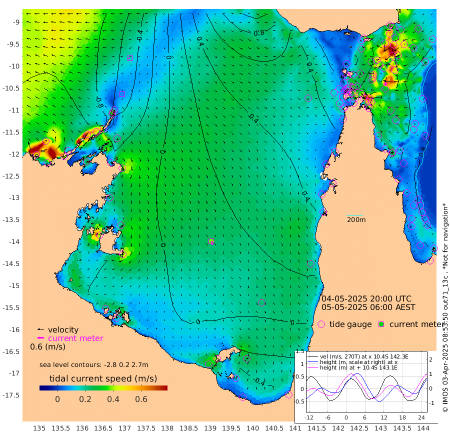 7cm/s -129T +3cm/s rms + 7cm/s -42T. ARA-GOC87 57m 37cm/s 164T +3cm/s rms + 2cm/s -2T. ARA-GOC87 60m 17cm/s -106T +2cm/s rms + 3cm/s 61T. ARA-GOC87 47m 110cm Daru 109cm Bobo Island 94cm Meer Island Barge 107cm Bramble Cay 115cm Unnamed Cay 116cm Pearce Cay 119cm Stephens Island 119cm Merrie England Shoals 114cm Mutacomal Reef 114cm Darnley Island Barge 105cm East Cay 111cm Yorke Island Barge 113cm Rennel Island 108cm Aureed Island 101cm Dungeness Reef 62cm Zagai Island 74cm Yam Island 35cm Dauan Island 36cm Saibai Island 37cm Phipi Reef 71cm Warrior Reef - West 34cm Mabuiag Island Barge 116cm Half Way Island 98cm Coconut Island 117cm Dugong Islet 87cm Poll Island 101cm Kirkcaldie Reef 65cm Suarji Island 87cm Sue Islet 62cm Hawkesbury Island 75cm Alert Patches 78cm Twin Island 39cm Badu Island 68cm St Pauls (Moa Island) 59cm Kubin (Moa Island) 64cm Ince Point 62cm Thursday Island 60cm Nardana Patches 59cm Turtle Head 46cm Round Island 53cm Goods Island 51cm Booby Island 48cm White Rocks Area 52cm Carpentaria 60cm Papou Point 48cm Bampfield Head 41cm Crab Island 56cm Red Wallis Island 69cm Packe Island 119cm Harrington Reef 68cm Herald Camp 16cm Sharp Point 58cm Red Island Point 57cm Possession Island 75cm Alpha Rock 95cm Frederick Point 105cm Wyborn Reef Light 100cm Tetley Island 84cm Triangle Reef 116cm Turtle Head Island 97cm Maclennan Cay 78cm Raine Island 112cm Mcsweeny Reef 107cm Collette Reef 89cm Shadwell Reef 115cm Hannibal Island 113cm Round Point 49cm Vrilya Point 109cm Cape Grenville 102cm Hicks Island 111cm Sir Charles Hardy Island 34cm Harvey Island 104cm Kay Reef 90cm Rocky Island 87cm Chapman Island 87cm Ham Reef 89cm Jubilee Reef 85cm Night Island 90cm Unnamed Reef No. 3 93cm Morris Island 83cm 1st 3 Mile Opening 93cm Creech Reef 100cm Fife Island 101cm Eden Reef 99cm Stanley Island 108cm Normanby River -107cm Yabooma Island -128cm Hutchison River -124cm Elcho Island -119cm North West Crocodile Island -51cm Cape Wessel -98cm Stevens Island -29cm Guluwuru Island -89cm Hopeful Bay -70cm Auster Point -63cm Two Island Bay -74cm Cadell Strait 72cm Mallison Island -38cm Melville Bay (Gove Harbour) -36cm Truant Island -25cm Cape Arnhem -33cm Cape Grey -39cm Hawk Island -59cm Milner Bay (Groote Eylandt) -48cm Cape Beatrice -41cm West Island -48cm Centre Island -32cm Mornington Island -27cm West Wellesley Islands -48cm Bountiful Island -118cm Albert River Mouth -128cm Sweers Island -94cm Karumba 19cm Nassau River Offshore 53cm Christmas Creek 51cm Archer River 55cm Boyd Point 51cm Weipa (Humbug Point) 43cm Pennefather River 50cm Cullen Point