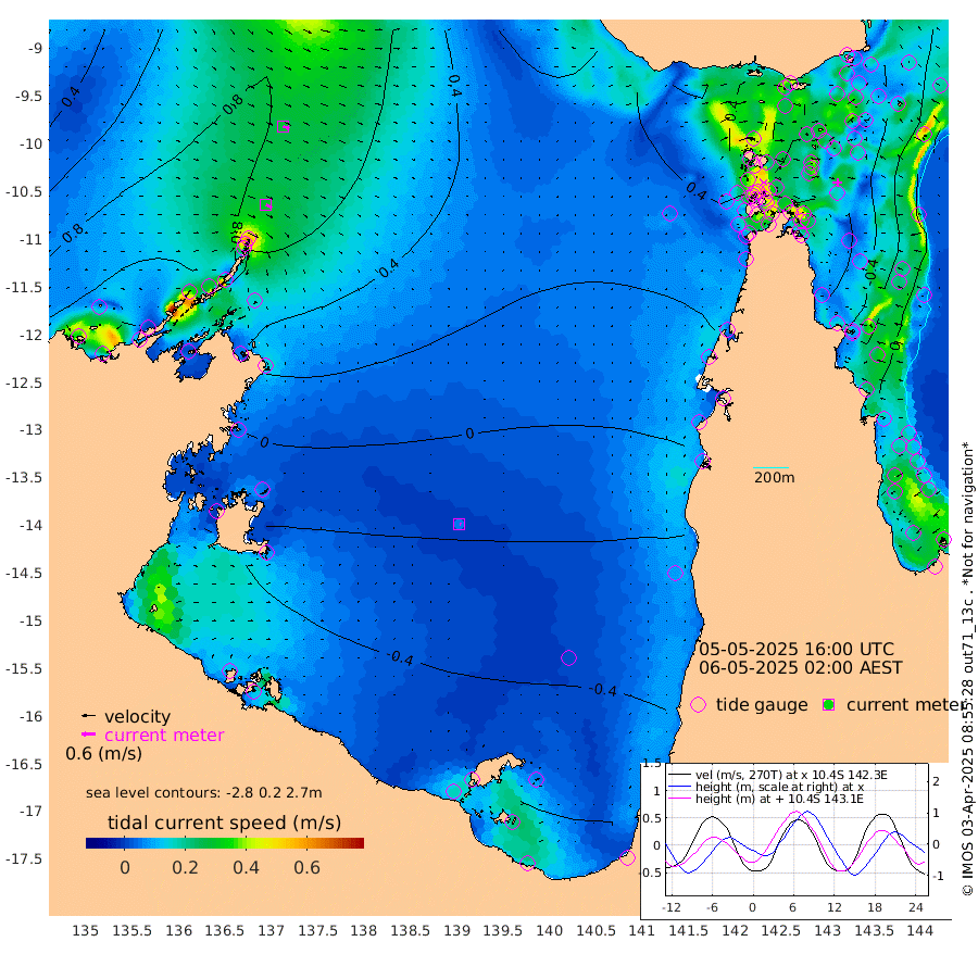 29cm/s 118T +3cm/s rms + 7cm/s -42T. ARA-GOC87 57m 6cm/s 105T +3cm/s rms + 2cm/s -2T. ARA-GOC87 60m 28cm/s 112T +2cm/s rms + 3cm/s 61T. ARA-GOC87 47m -52cm Daru -50cm Bobo Island -12cm Meer Island Barge -28cm Bramble Cay -42cm Unnamed Cay -47cm Pearce Cay -44cm Stephens Island -49cm Merrie England Shoals -52cm Mutacomal Reef -34cm Darnley Island Barge -18cm East Cay -40cm Yorke Island Barge -50cm Rennel Island -48cm Aureed Island -47cm Dungeness Reef -22cm Zagai Island -24cm Yam Island 22cm Dauan Island 25cm Saibai Island -6cm Phipi Reef -25cm Warrior Reef - West 25cm Mabuiag Island Barge -53cm Half Way Island -47cm Coconut Island -54cm Dugong Islet -40cm Poll Island -49cm Kirkcaldie Reef -34cm Suarji Island -32cm Sue Islet 77cm Hawkesbury Island -23cm Alert Patches -24cm Twin Island 66cm Badu Island -21cm St Pauls (Moa Island) 46cm Kubin (Moa Island) 0cm Ince Point 14cm Thursday Island 11cm Nardana Patches 32cm Turtle Head 59cm Round Island 67cm Goods Island 82cm Booby Island 71cm White Rocks Area 71cm Carpentaria -12cm Papou Point 104cm Bampfield Head 63cm Crab Island 72cm Red Wallis Island 48cm Packe Island -66cm Harrington Reef 82cm Herald Camp -15cm Sharp Point 24cm Red Island Point 6cm Possession Island -23cm Alpha Rock -40cm Frederick Point -43cm Wyborn Reef Light -40cm Tetley Island -8cm Triangle Reef -47cm Turtle Head Island -14cm Maclennan Cay 2cm Raine Island -43cm Mcsweeny Reef -35cm Collette Reef -12cm Shadwell Reef -40cm Hannibal Island -29cm Round Point 54cm Vrilya Point -28cm Cape Grenville -20cm Hicks Island -5cm Sir Charles Hardy Island -10cm Harvey Island -15cm Kay Reef -5cm Rocky Island 7cm Chapman Island 5cm Ham Reef -2cm Jubilee Reef -11cm Night Island -1cm Unnamed Reef No. 3 -8cm Morris Island 0cm 1st 3 Mile Opening -6cm Creech Reef -17cm Fife Island -1cm Eden Reef -9cm Stanley Island -14cm Normanby River 130cm Yabooma Island 136cm Hutchison River 117cm Elcho Island 107cm North West Crocodile Island 97cm Cape Wessel 114cm Stevens Island 86cm Guluwuru Island 108cm Hopeful Bay 100cm Auster Point 103cm Two Island Bay 120cm Cadell Strait 119cm Mallison Island 74cm Melville Bay (Gove Harbour) 86cm Truant Island 48cm Cape Arnhem 10cm Cape Grey -7cm Hawk Island -38cm Milner Bay (Groote Eylandt) -57cm Cape Beatrice -100cm West Island -96cm Centre Island -116cm Mornington Island -114cm West Wellesley Islands -113cm Bountiful Island -134cm Albert River Mouth -145cm Sweers Island -139cm Karumba -84cm Nassau River Offshore -42cm Christmas Creek 7cm Archer River 28cm Boyd Point 35cm Weipa (Humbug Point) 21cm Pennefather River 57cm Cullen Point