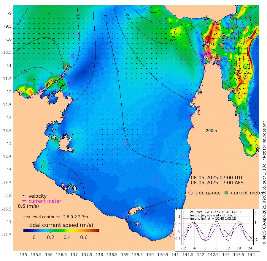 10cm/s 87T +3cm/s rms + 7cm/s -42T. ARA-GOC87 57m 12cm/s -41T +3cm/s rms + 2cm/s -2T. ARA-GOC87 60m 14cm/s 77T +2cm/s rms + 3cm/s 61T. ARA-GOC87 47m -82cm Daru -74cm Bobo Island -7cm Meer Island Barge -22cm Bramble Cay -57cm Unnamed Cay -60cm Pearce Cay -49cm Stephens Island -46cm Merrie England Shoals -81cm Mutacomal Reef -40cm Darnley Island Barge -9cm East Cay -63cm Yorke Island Barge -70cm Rennel Island -73cm Aureed Island -92cm Dungeness Reef -114cm Zagai Island -125cm Yam Island -109cm Dauan Island -104cm Saibai Island -104cm Phipi Reef -118cm Warrior Reef - West -99cm Mabuiag Island Barge -75cm Half Way Island -91cm Coconut Island -92cm Dugong Islet -109cm Poll Island -107cm Kirkcaldie Reef -130cm Suarji Island -103cm Sue Islet -72cm Hawkesbury Island -112cm Alert Patches -121cm Twin Island -70cm Badu Island -132cm St Pauls (Moa Island) -95cm Kubin (Moa Island) -110cm Ince Point -103cm Thursday Island -106cm Nardana Patches -85cm Turtle Head -84cm Round Island -62cm Goods Island -53cm Booby Island -59cm White Rocks Area -58cm Carpentaria -114cm Papou Point -69cm Bampfield Head -36cm Crab Island -61cm Red Wallis Island -85cm Packe Island -102cm Harrington Reef -88cm Herald Camp -41cm Sharp Point -71cm Red Island Point -102cm Possession Island -110cm Alpha Rock -111cm Frederick Point -88cm Wyborn Reef Light -97cm Tetley Island -22cm Triangle Reef -87cm Turtle Head Island -19cm Maclennan Cay 14cm Raine Island -52cm Mcsweeny Reef -36cm Collette Reef -6cm Shadwell Reef -36cm Hannibal Island -21cm Round Point -29cm Vrilya Point -21cm Cape Grenville -17cm Hicks Island -22cm Sir Charles Hardy Island -8cm Harvey Island 0cm Kay Reef 6cm Rocky Island 17cm Chapman Island 12cm Ham Reef 8cm Jubilee Reef 0cm Night Island 13cm Unnamed Reef No. 3 7cm Morris Island 7cm 1st 3 Mile Opening 6cm Creech Reef 11cm Fife Island 20cm Eden Reef 11cm Stanley Island 8cm Normanby River 71cm Yabooma Island 79cm Hutchison River 78cm Elcho Island 71cm North West Crocodile Island 35cm Cape Wessel 70cm Stevens Island 34cm Guluwuru Island 73cm Hopeful Bay 50cm Auster Point 40cm Two Island Bay 72cm Cadell Strait 84cm Mallison Island 36cm Melville Bay (Gove Harbour) 32cm Truant Island 22cm Cape Arnhem 23cm Cape Grey 22cm Hawk Island 20cm Milner Bay (Groote Eylandt) 20cm Cape Beatrice 4cm West Island 5cm Centre Island 29cm Mornington Island 31cm West Wellesley Islands 39cm Bountiful Island 76cm Albert River Mouth 91cm Sweers Island 69cm Karumba 17cm Nassau River Offshore 0cm Christmas Creek 6cm Archer River -16cm Boyd Point -9cm Weipa (Humbug Point) -3cm Pennefather River -36cm Cullen Point